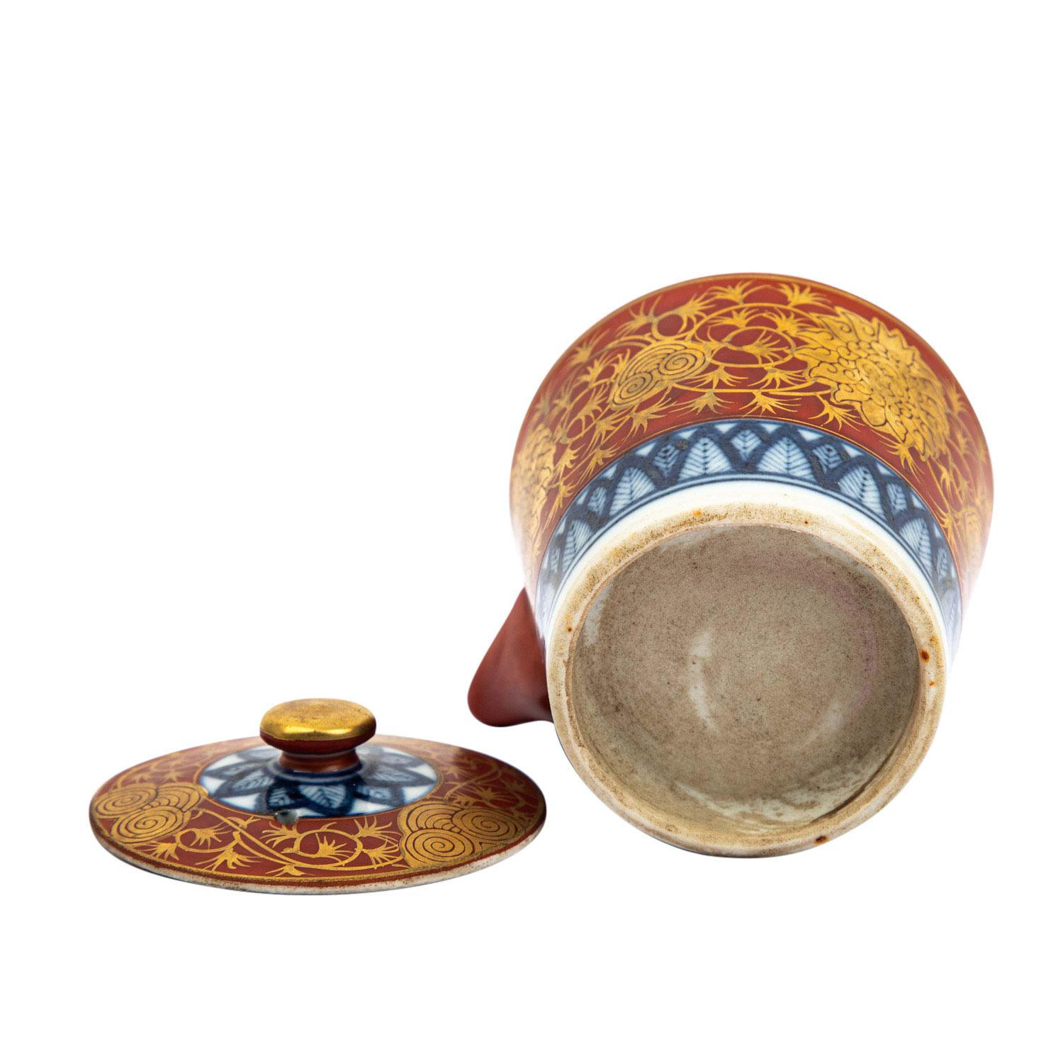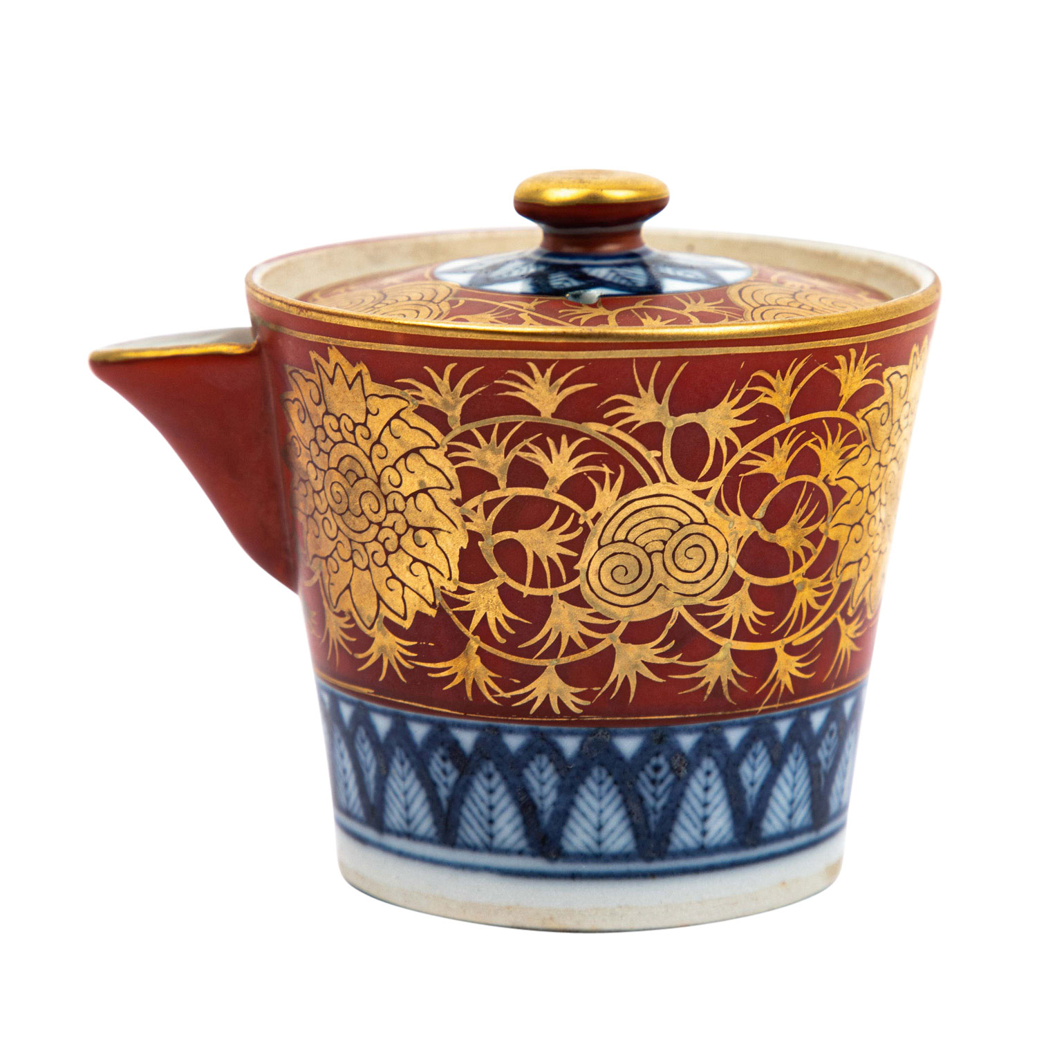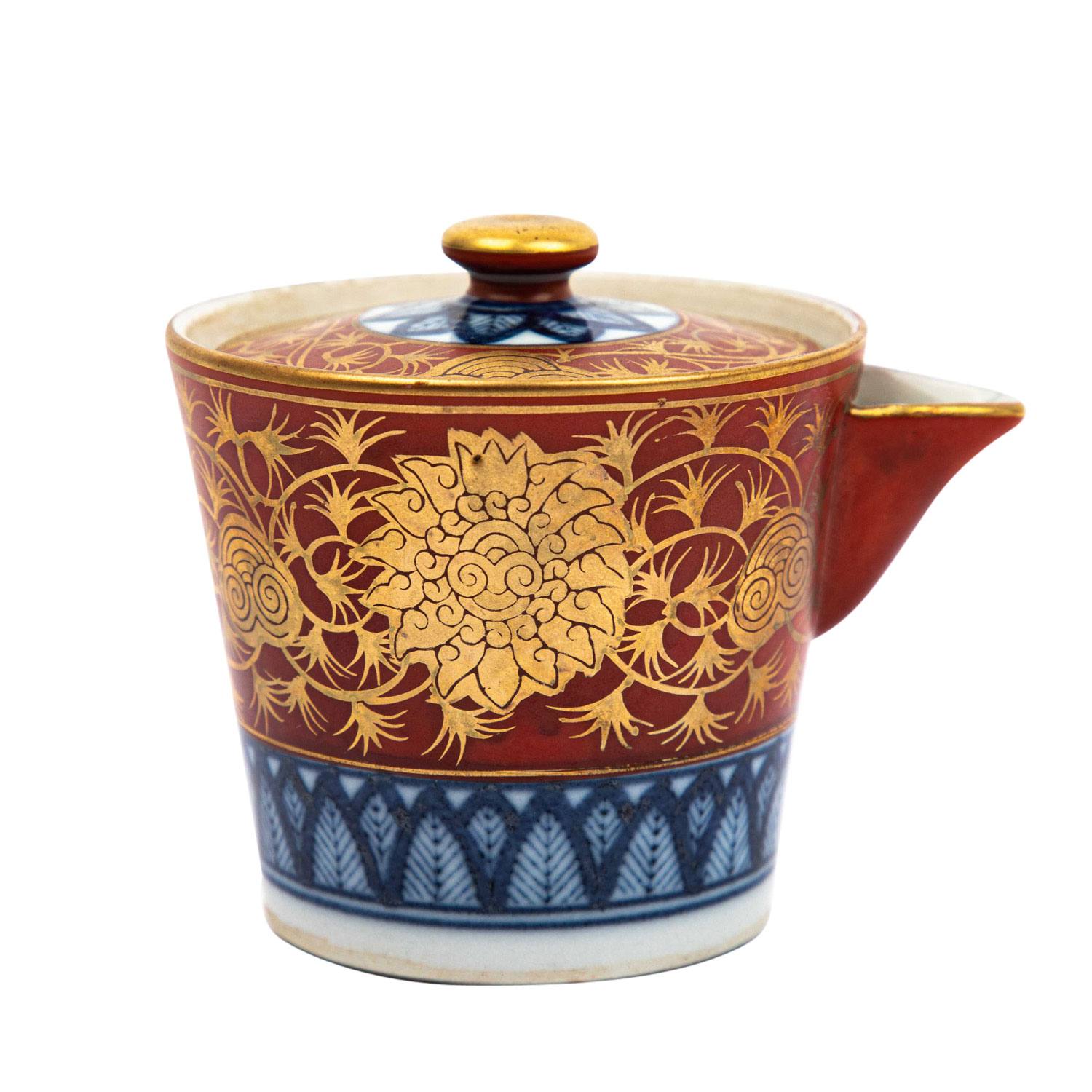 | Iron red Kutani teapot. JAPAN. In shoza style decorated with floral ornaments in gold and on the lower rim with underglaze blue border and on the lid with underglaze blue floral motif, h. 8 cm. Marked on the underside of the lid with an iron-red four-character mark. FROM THE ESTATE OF ALFRED AND GISELA DIENST