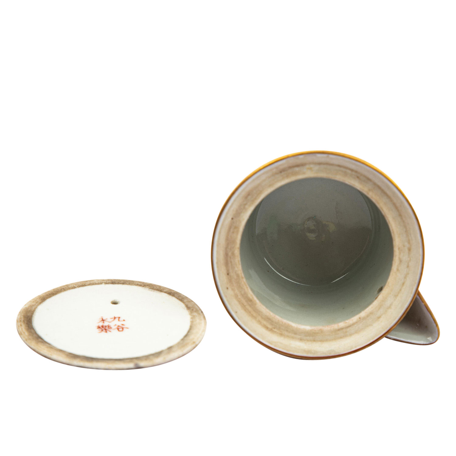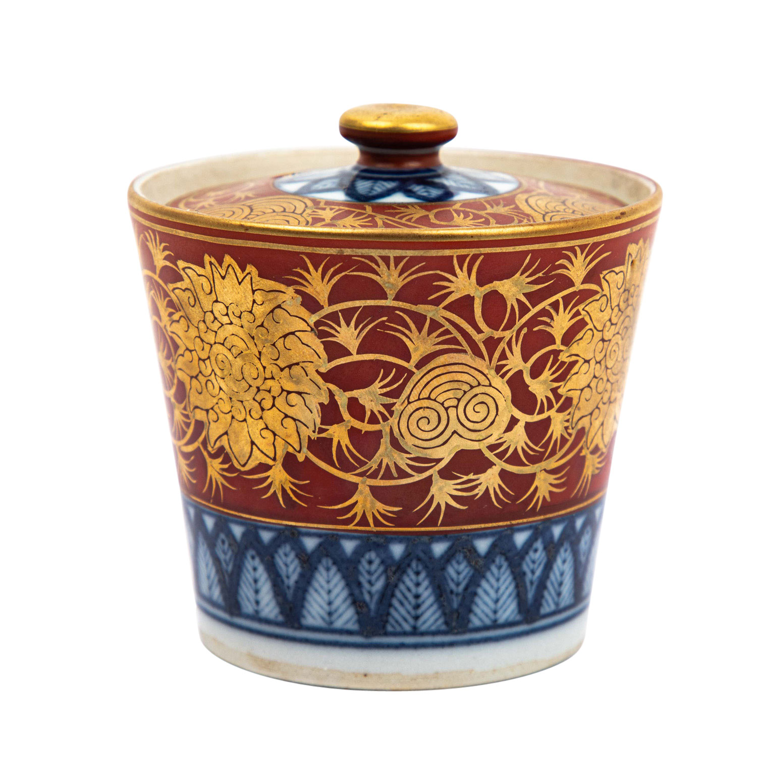 Decorated in the shoza style with floral ornaments in gold and underglaze blue border on the lower rim and underglaze blue flower motif on the lid, h. 8 cm. Marked on the underside of the lid with an iron-red four-character mark. FROM THE ESTATE OF ALFRED AND GISELA DIENST