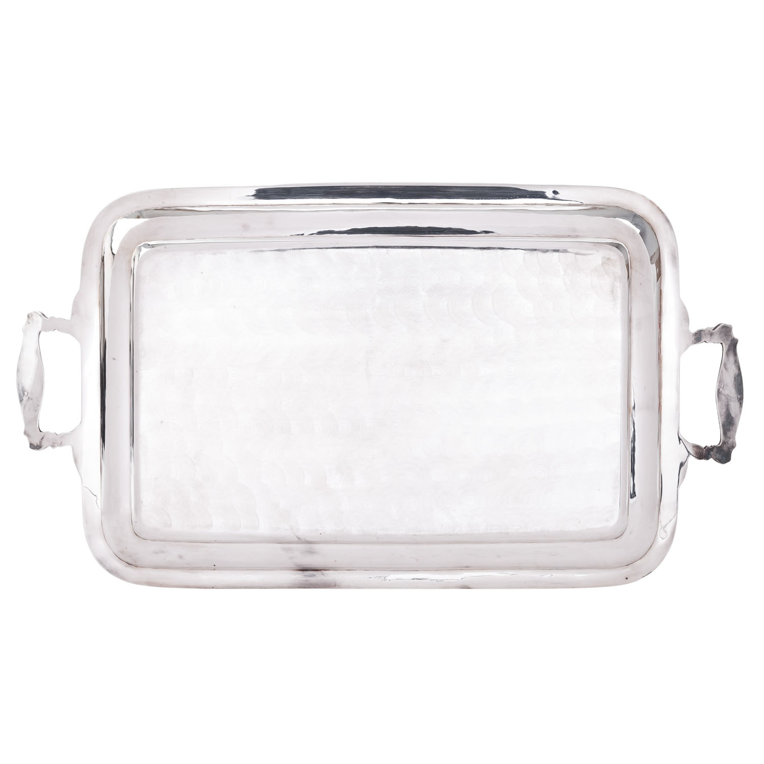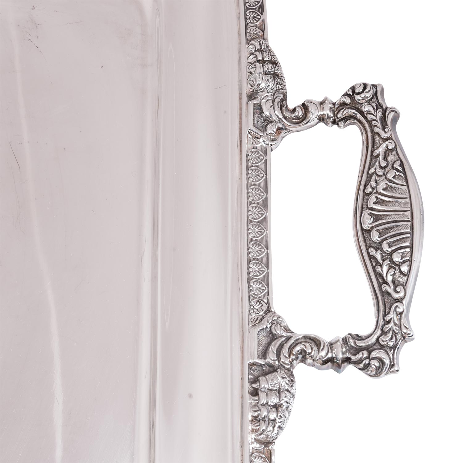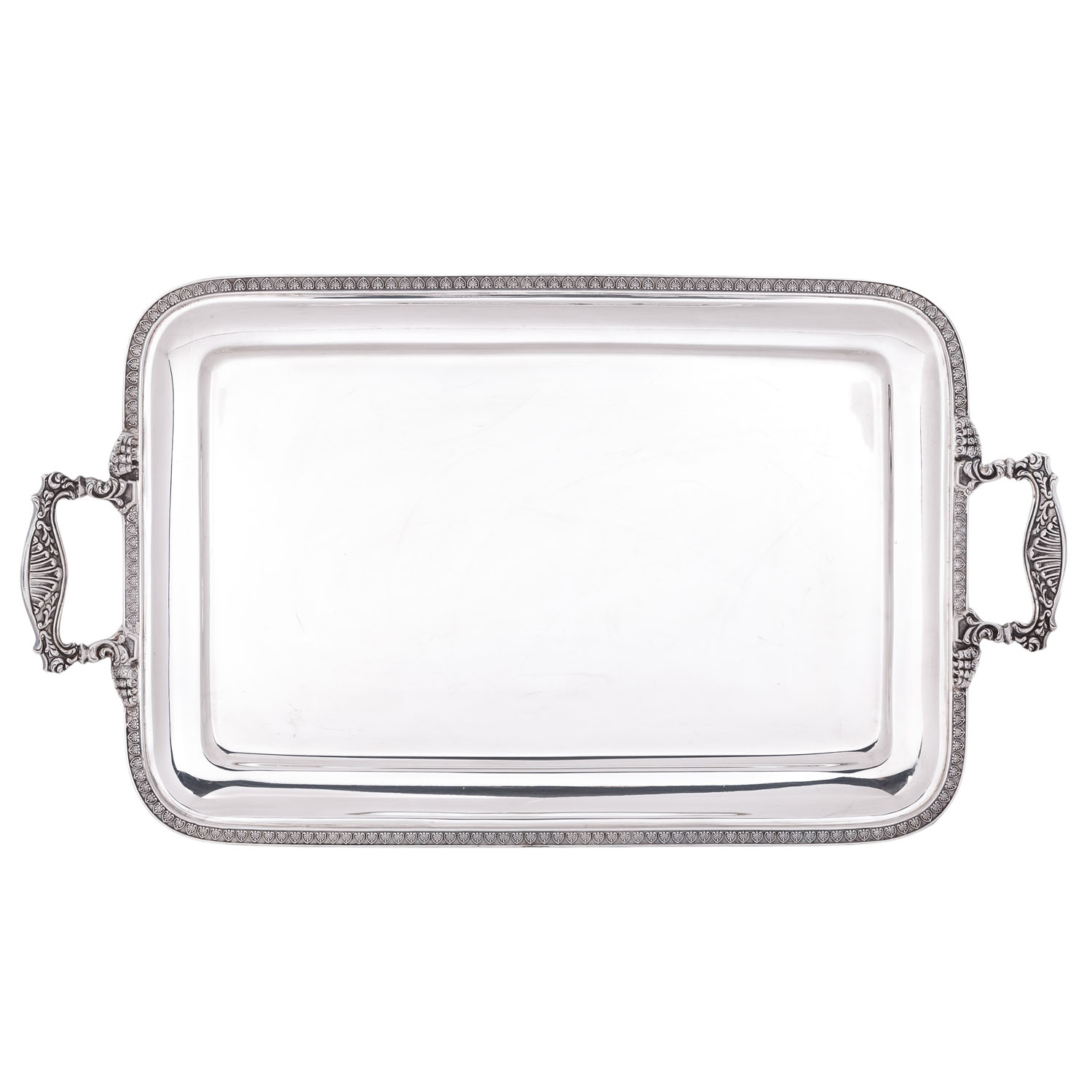 ITALY large tray, 800 silver, 20th cent. Rectangular with rounded corners, the rim with leaf decoration, the handles with lavish relief decoration of rocailles, shells and paws, hallmark struck, approx. 63.5x35 cm, weight approx. 2973 g. Slight signs of age and use.