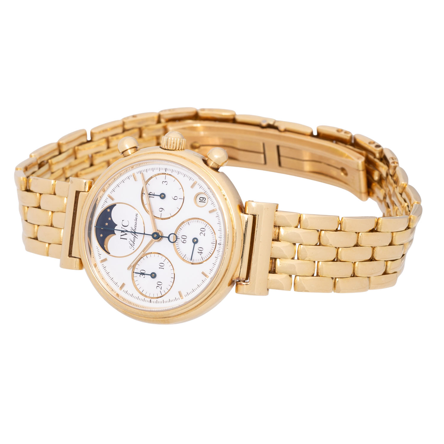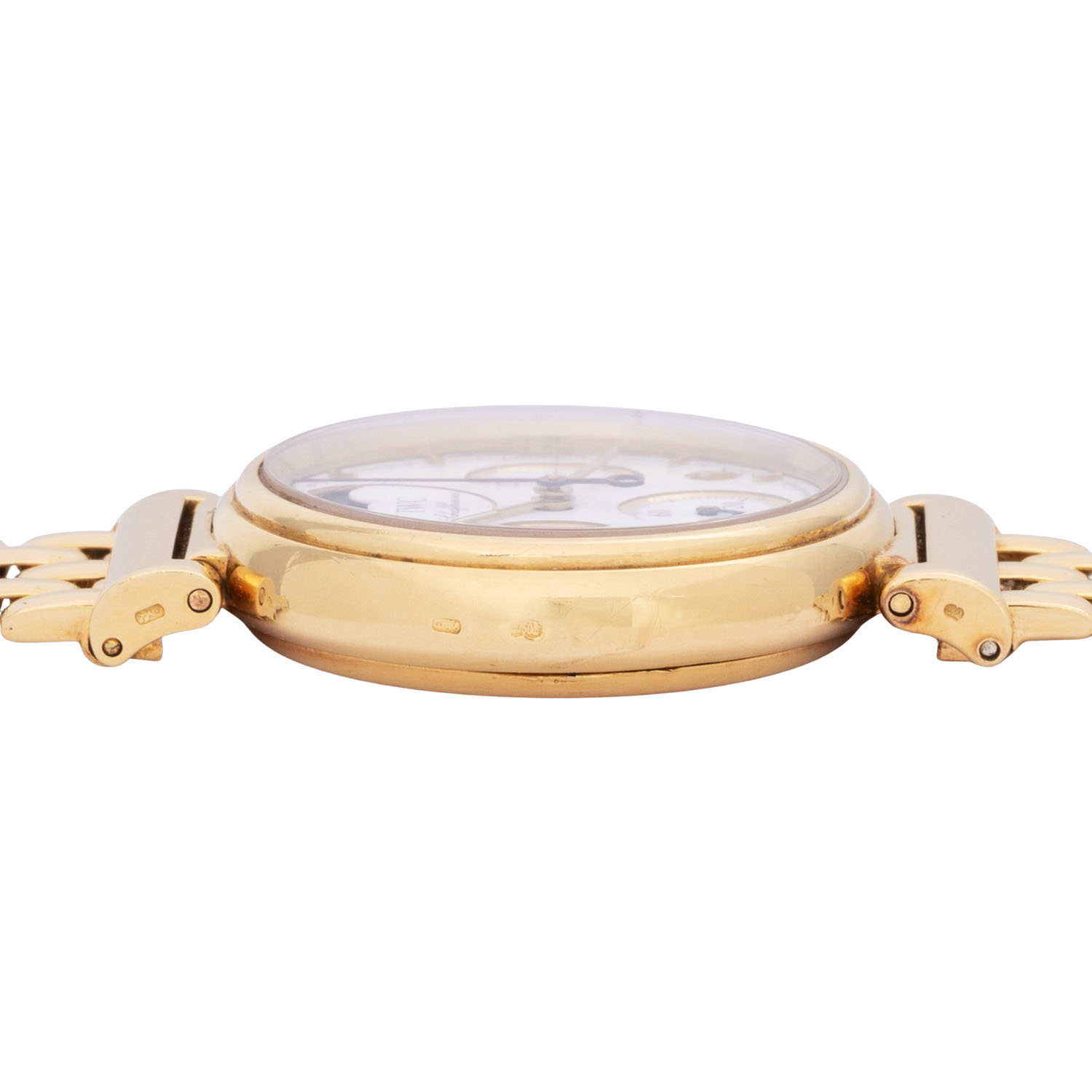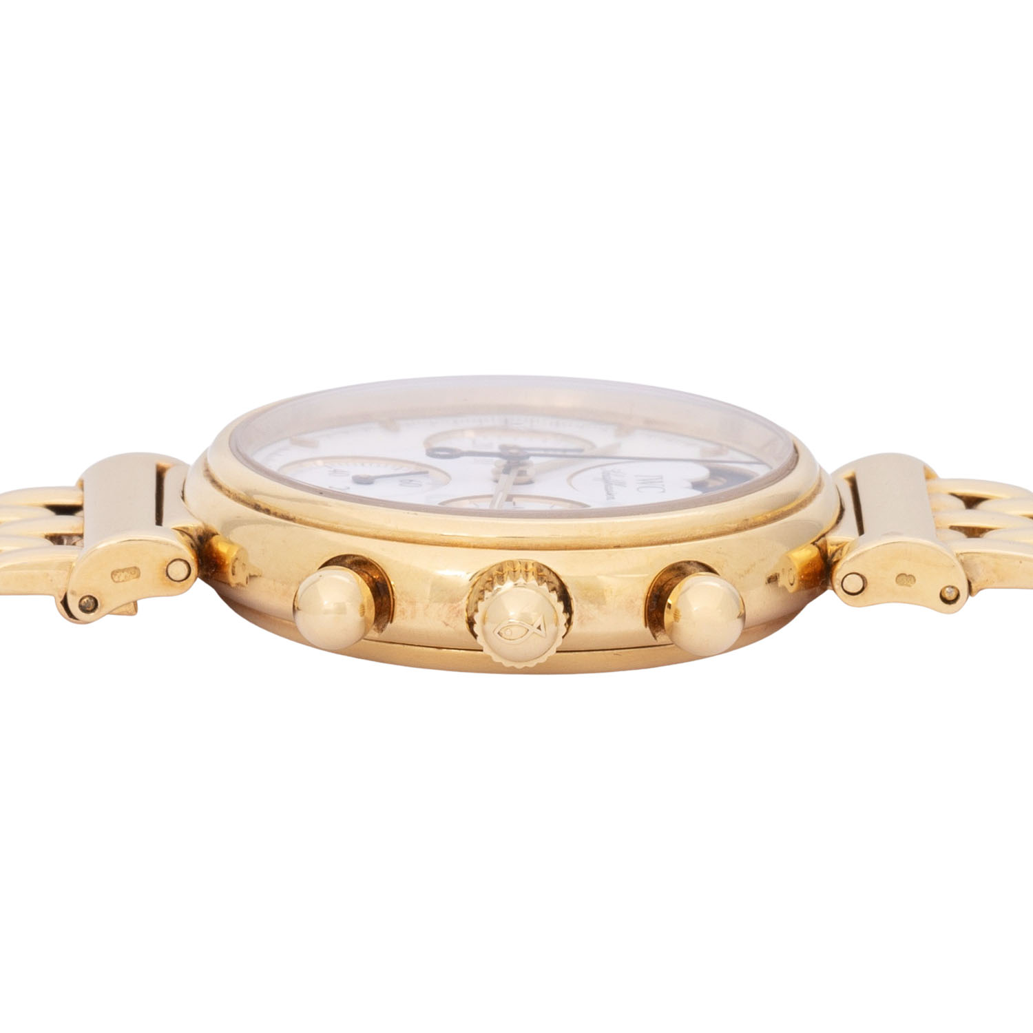 IWC DaVinci chronograph ref. 3735 ladies wristwatch. 18K yellow gold, case no. 2420947. Quartz-movement cal. 630 incl. new battery. White enamel dial with baton indices, 3 subdials, moon phase, date display and chronograph function with central stop second. Original IWC 18K yellow gold link bracelet with double-sided folding clasp. Good condition, slight signs of wear, back of the strap lugs rubbed. Diameter approx. 29 mm measured without crown.