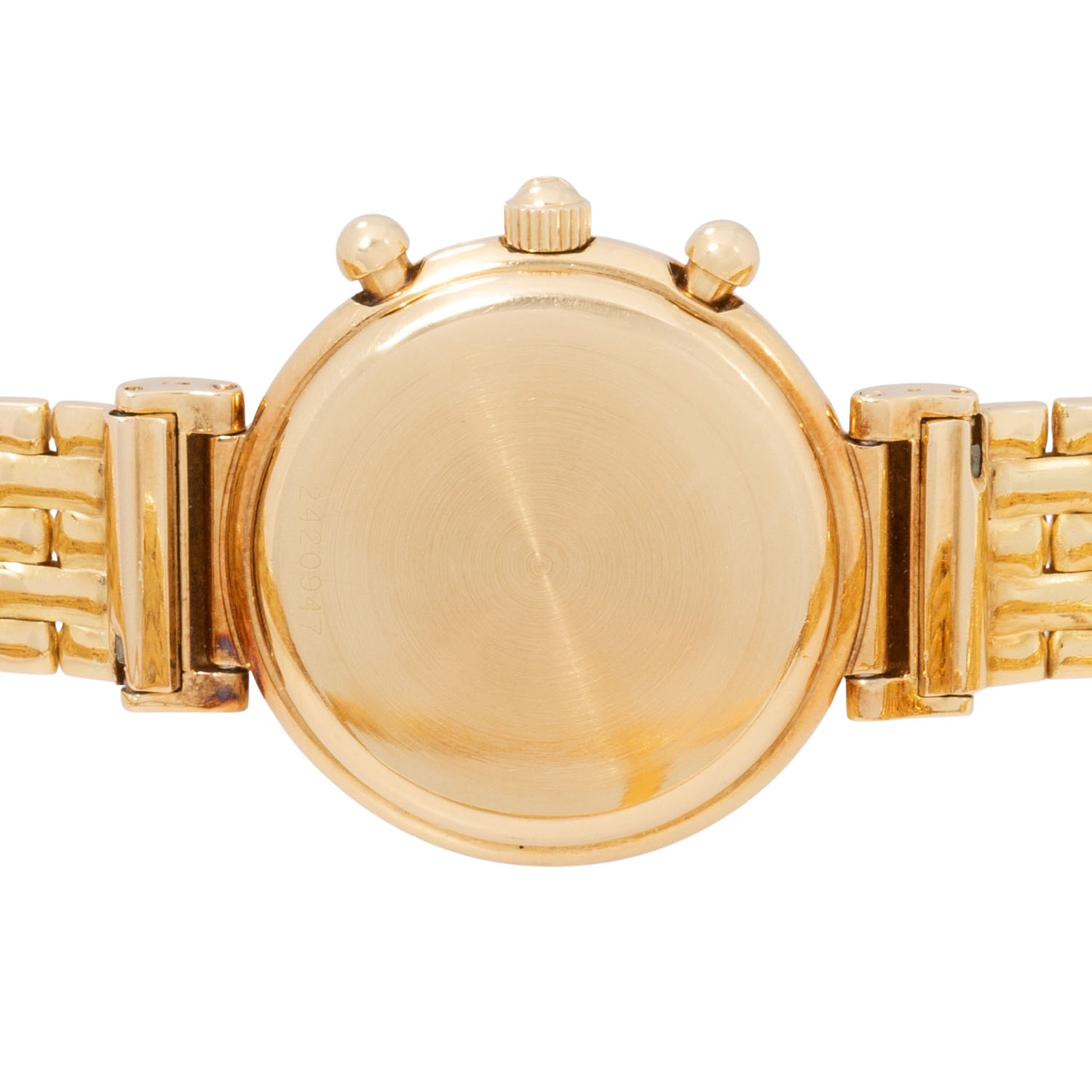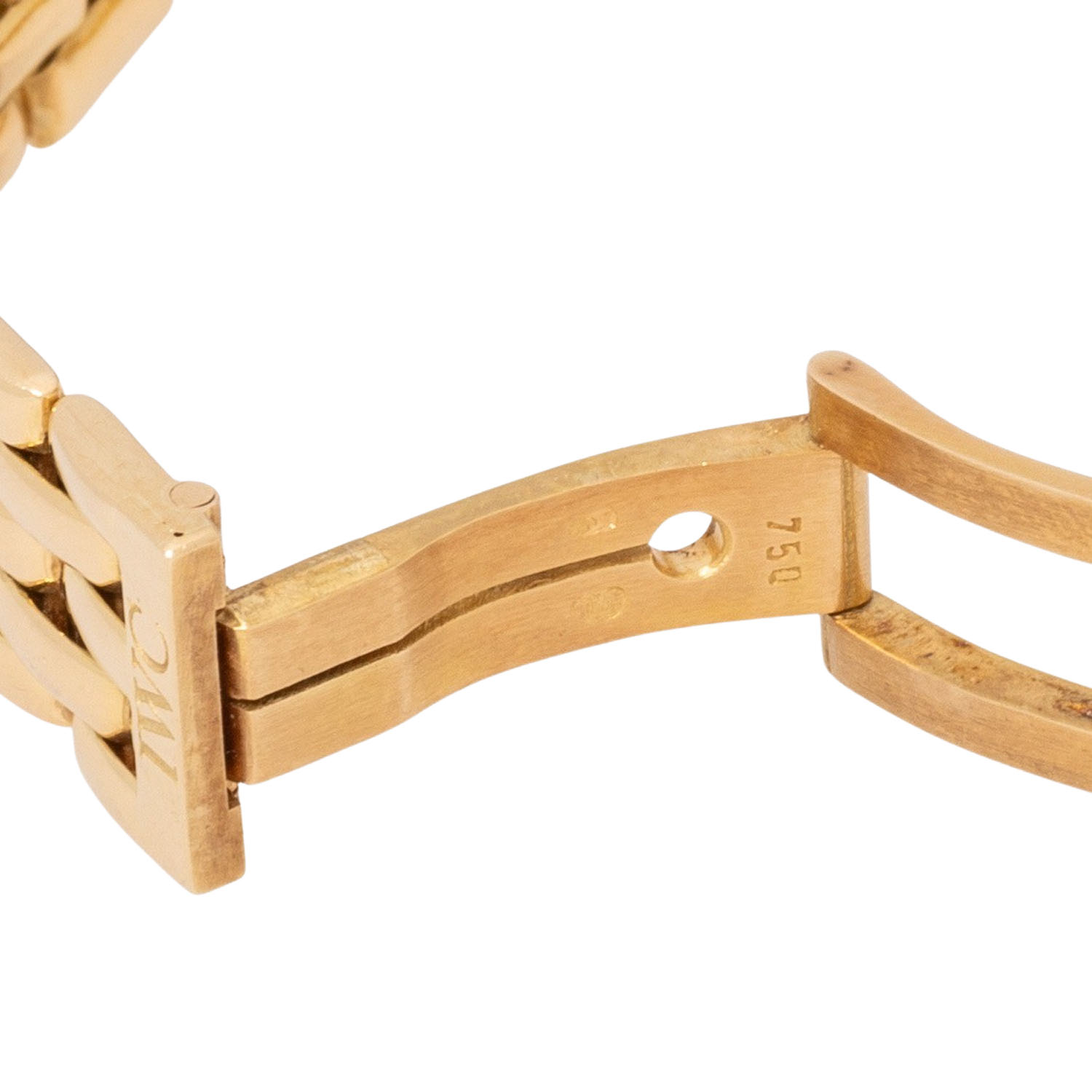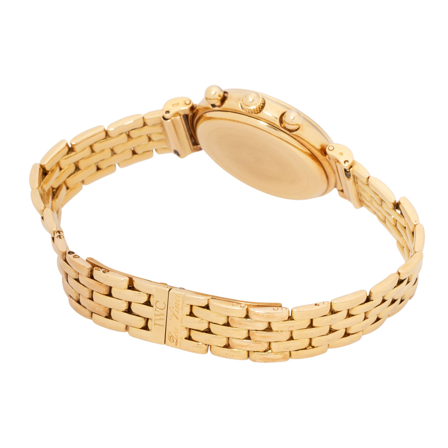 IWC DaVinci chronograph ref. 3735 ladies wristwatch. 18K yellow gold, case no. 2420947. Quartz-movement cal. 630 incl. new battery. White enamel dial with baton indices, 3 subdials, moon phase, date display and chronograph function with central stop second. Original IWC 18K yellow gold link bracelet with double-sided folding clasp. Good condition, slight signs of wear, back of the strap lugs rubbed. Diameter approx. 29 mm measured without crown.