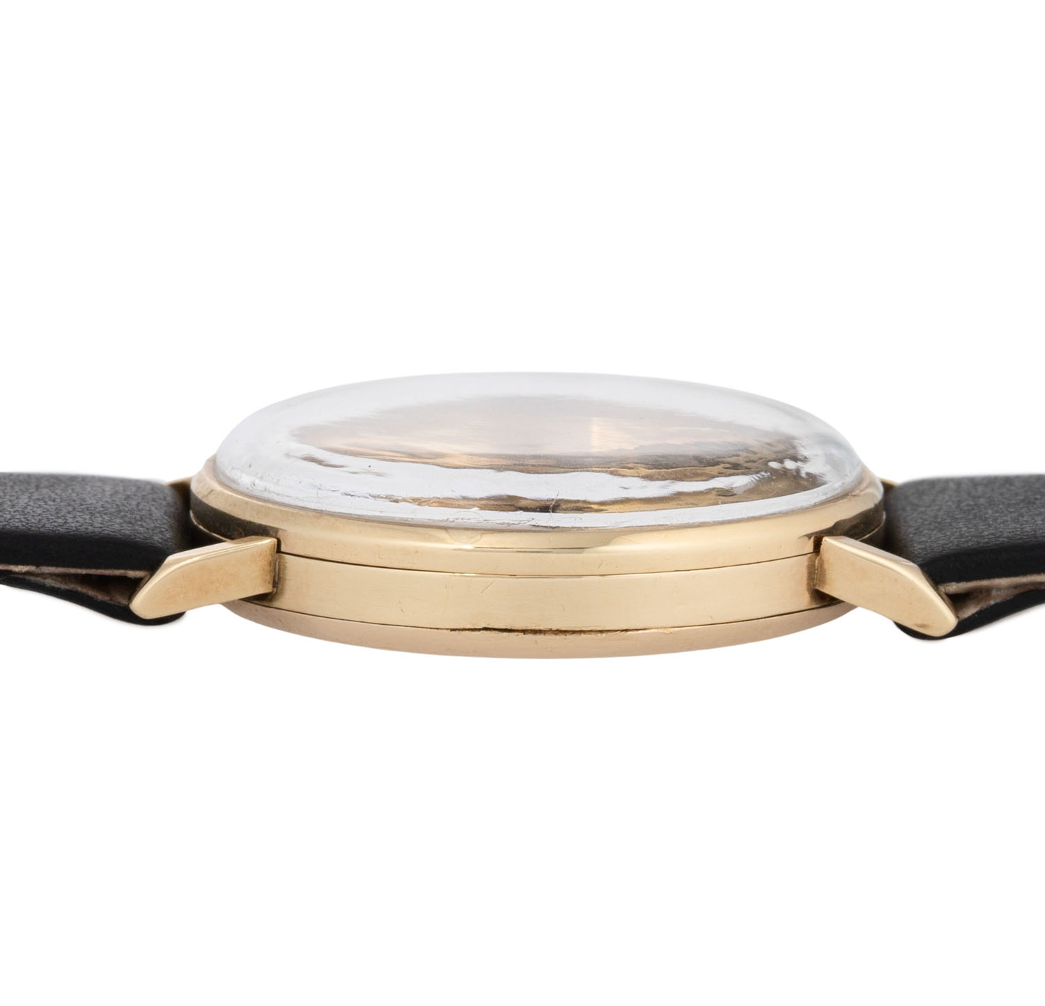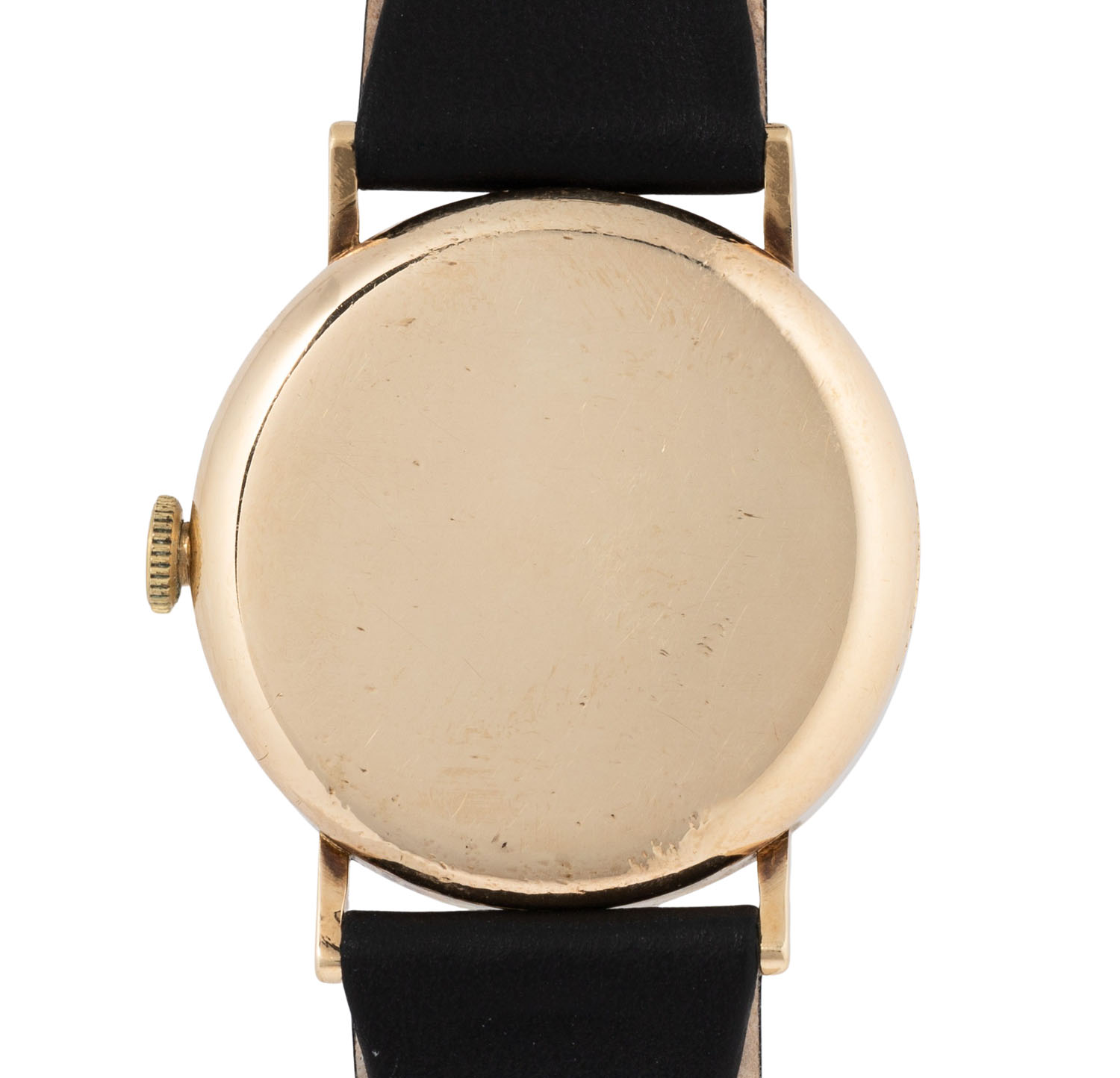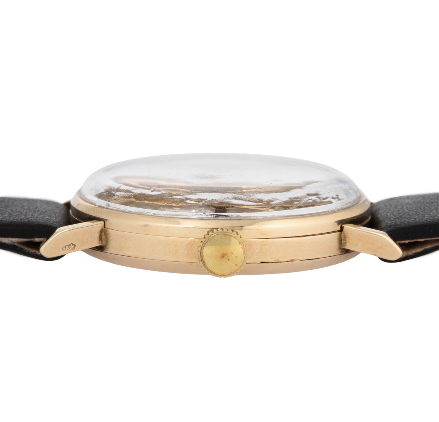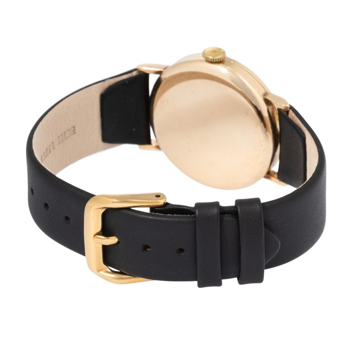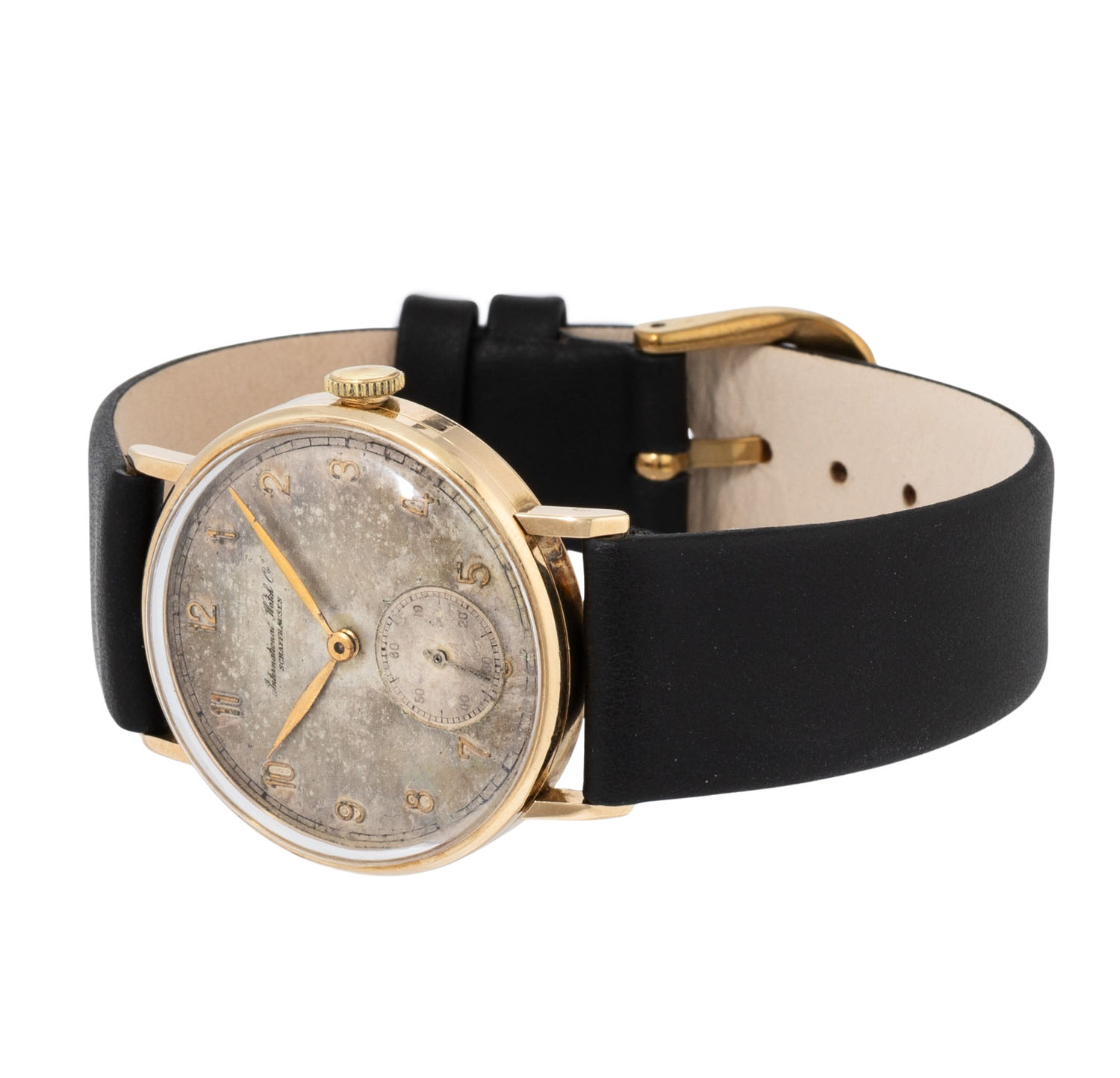 IWC Vintage Calatrava men's wristwatch from approx. 1940. 14K yellow gold. Hand-wound movement Cal. 83 with excellent working order (+/-0 s/d, 289° amplitude). Unrestored, patinated dial with applied Arabic numerals, golden hands, and sunken small seconds. Black leather strap with gold-plated buckle. Used condition with signs of wear, strap almost unworn. Diameter approx. 33 mm measured without crown.