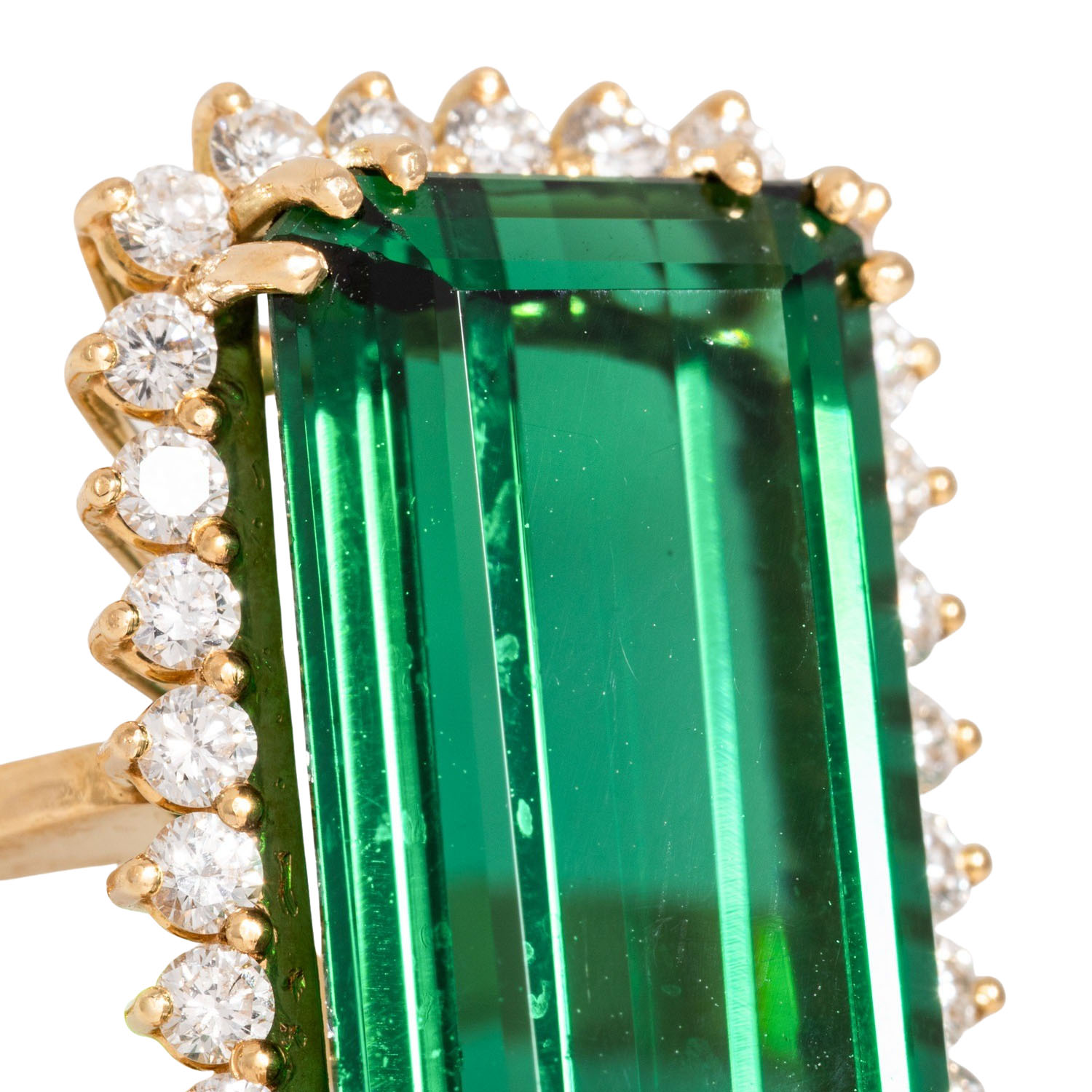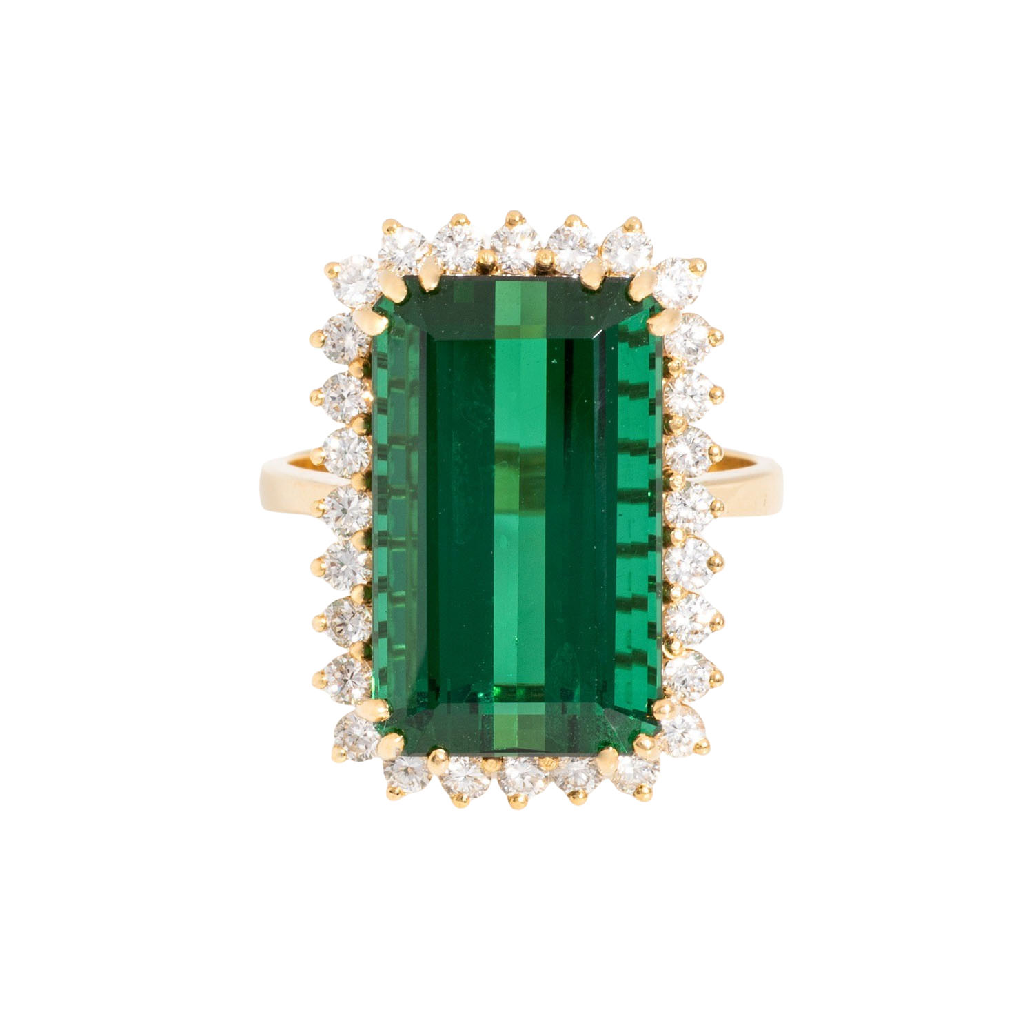 JACOBI ring set with step-cut tourmaline (Verdelith), approx. 17 x 10,5 x 7,4 mm, approx. 11 ct, brilliant-cut diamonds totalling approx. 0.70 ct, good colour and clarity, 18K YG, 7.8 g, ring size 55, 20th/21st century, minor signs of wear, facet edges of the tourmaline minimally chipped, maker's mark, certificate.