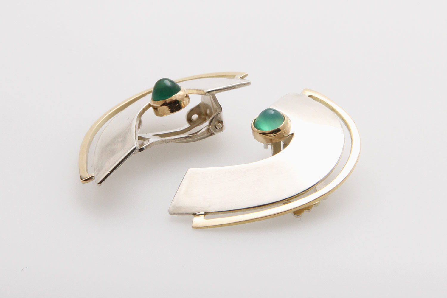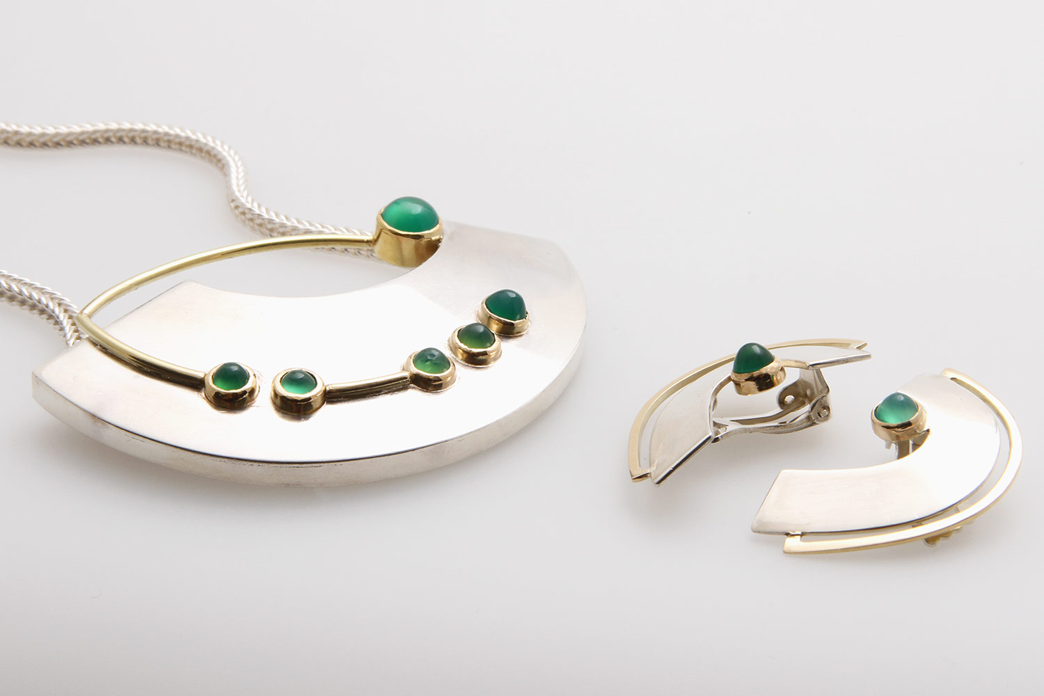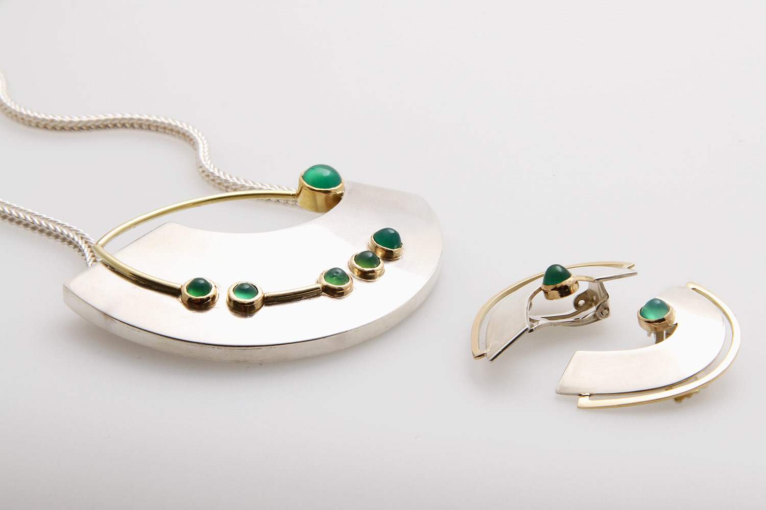 Jewelry set, 3 pieces: 1 necklace and a pair of ear clips set with agate, probably dyed green. Silver, partly GG 14K, partly gold-plated. Necklace l: approx. 73cm. Slight signs of wear.