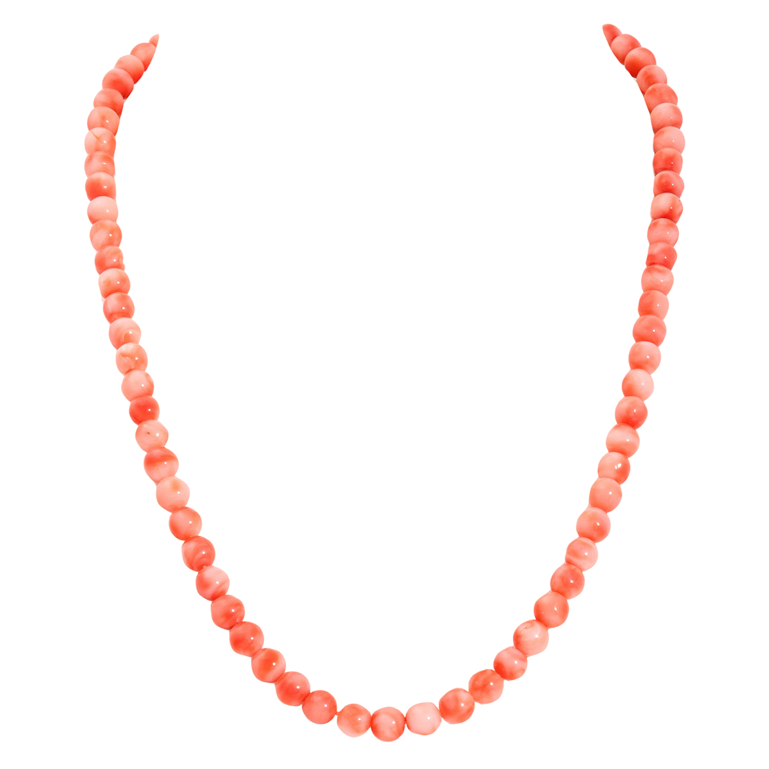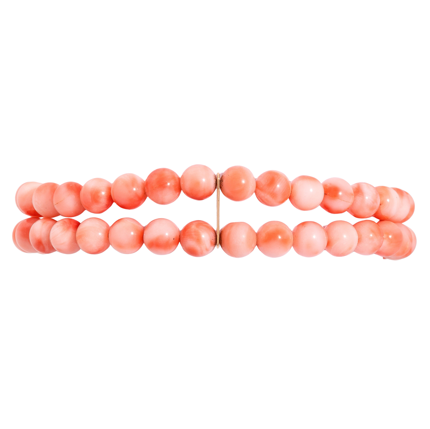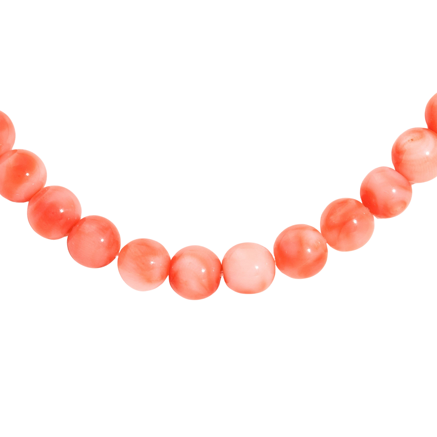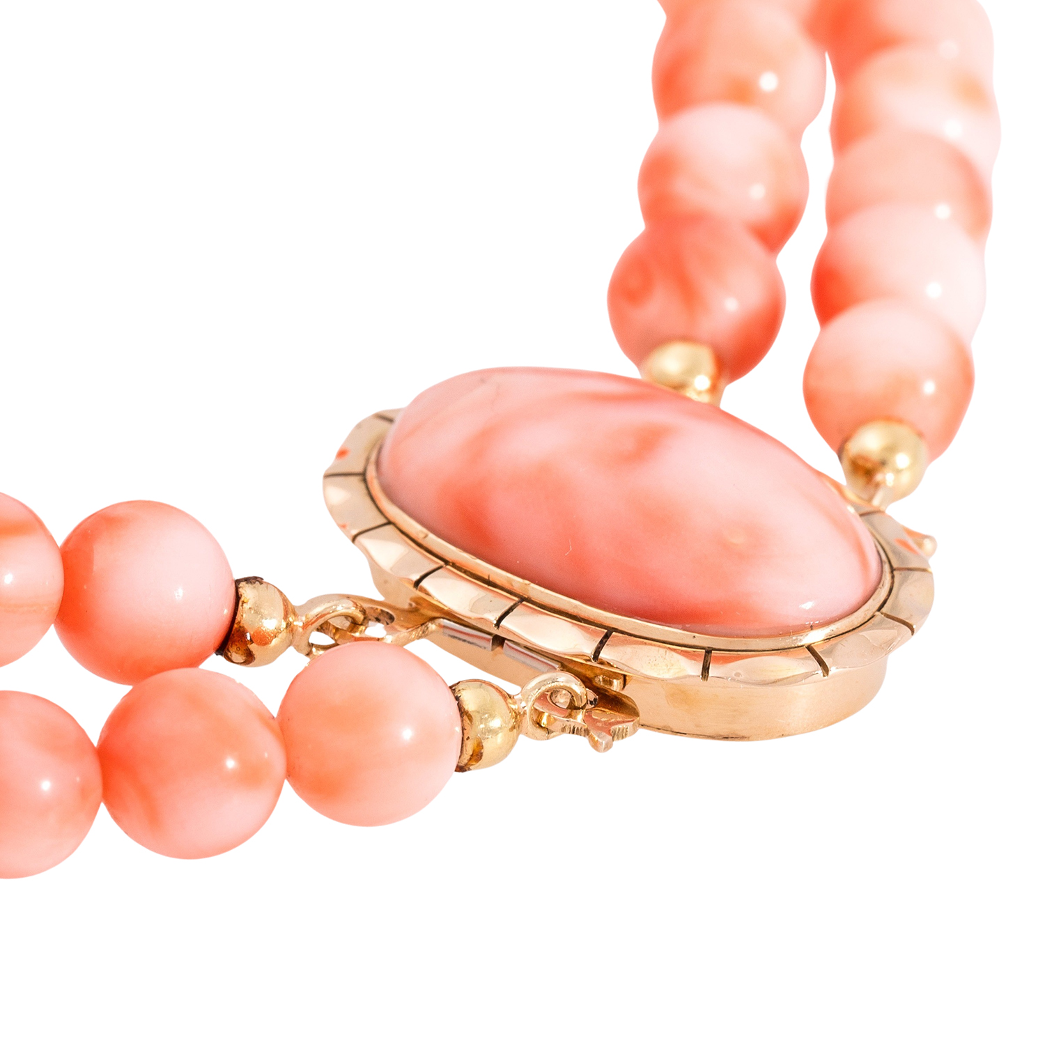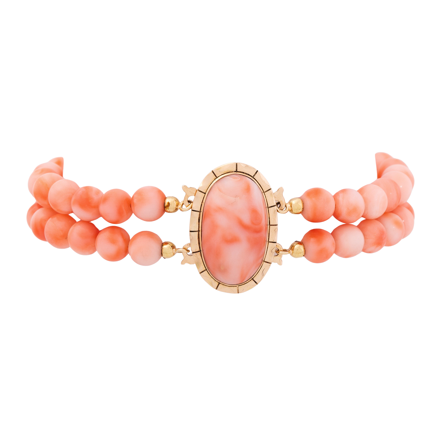 Jewellery Set: Coral necklace and bracelet, necklace of 73 coral beads, d: 6.8 mm, corals partly with cracks, clasp YG 18K, 32 g, L: ca. 50 cm, bracelet, 2-row, 54 coral beads, clasp YG 18K, set with coral cabochon, 24.7 g, L: 19.5 cm, 20th century, good condition. IMPORT/EXPORT RESTRICTIONS OUTSIDE THE EU!
