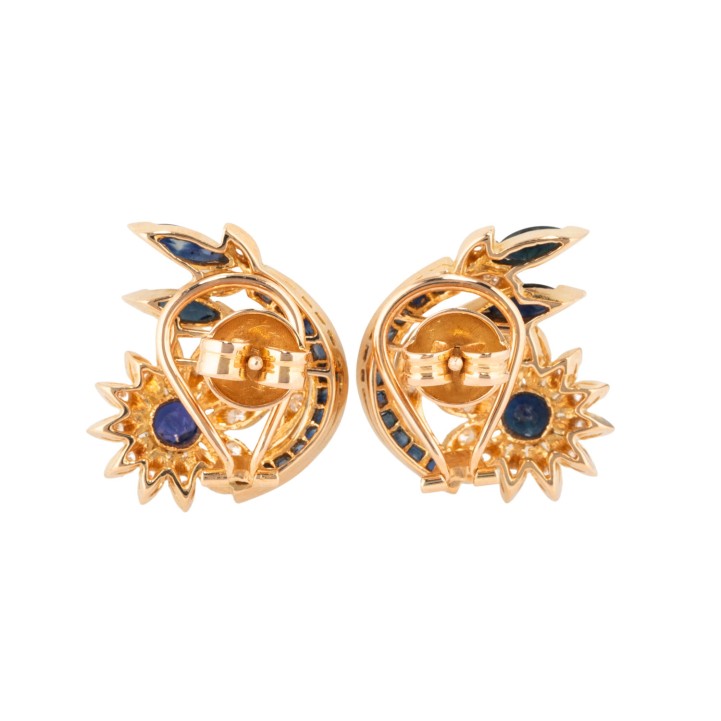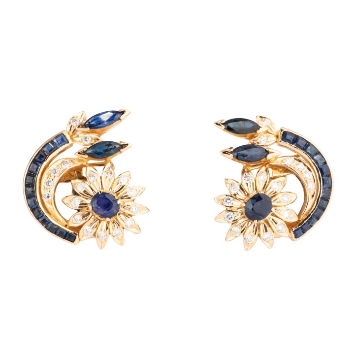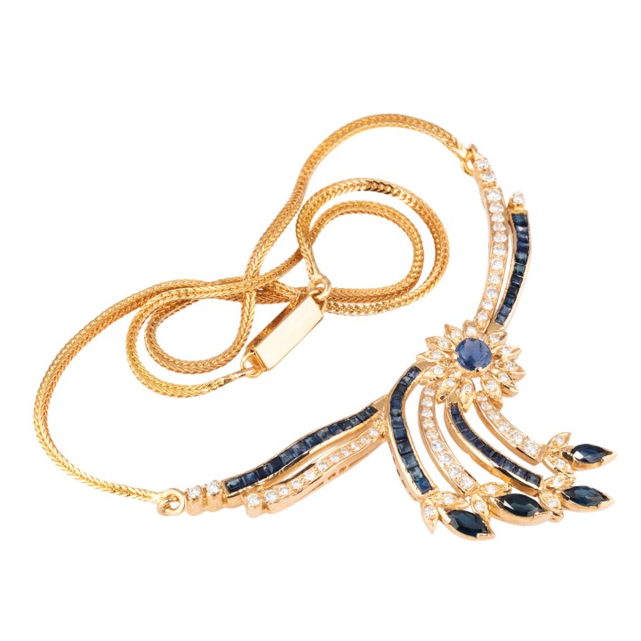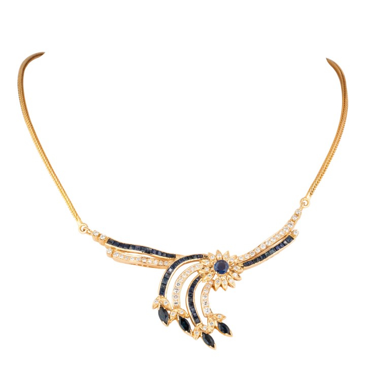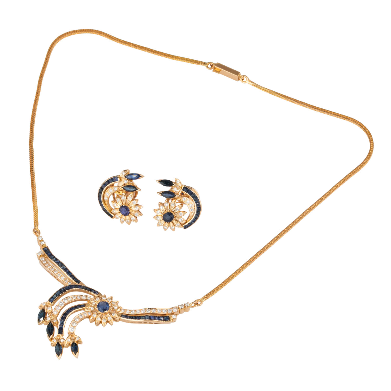 Set necklace and earrings with sapphires and brilliant-cut diamonds totalling ca. 2 ct, 19.2K yellow gold, 34.6 g, L: 43 cm, earrings D: 2 cm, 2nd half of 20th century, good condition.