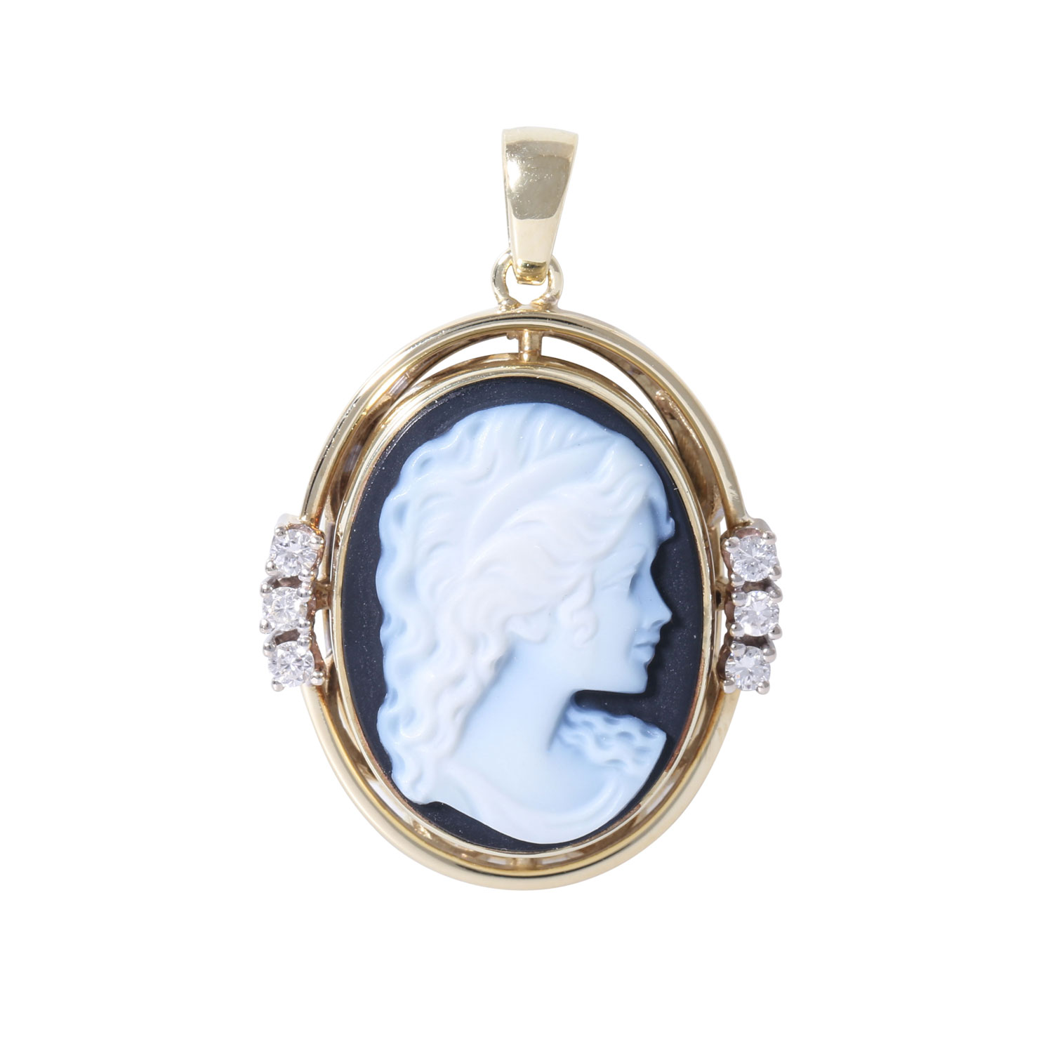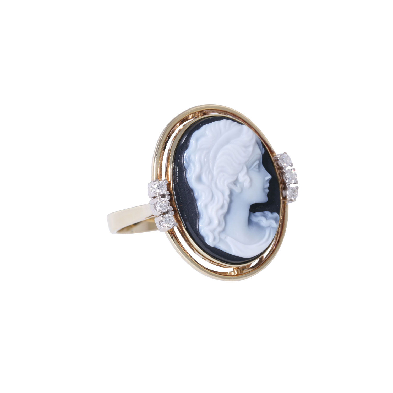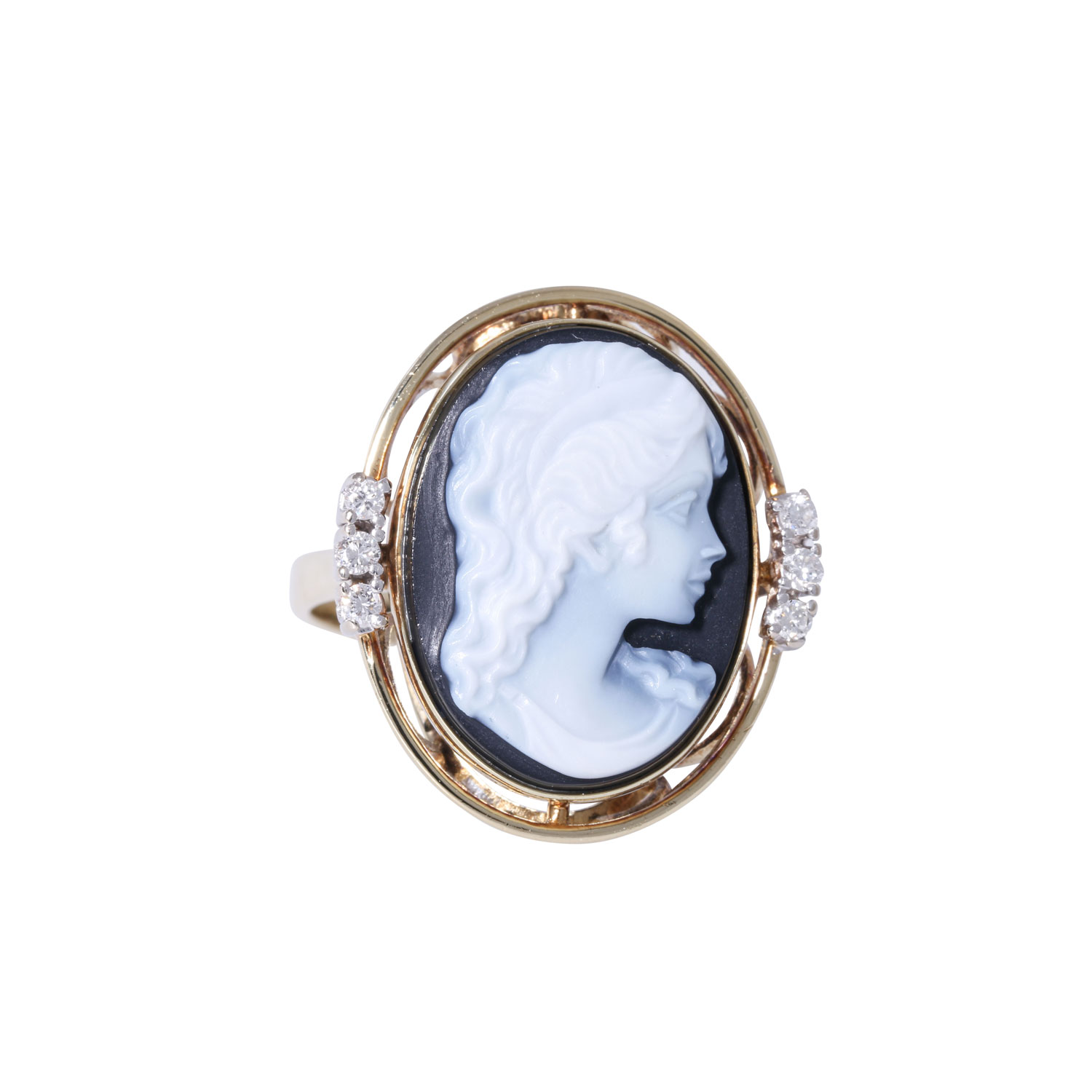 Jewellery set: Ring, pendant and stud earrings, all parts with finely cut agate cameo in the shape of a lady's portrait, ring and pendant each with 6 brilliant-cut diamonds totalling ca. 0.25ct ca. WHITE (H) /SI, YG 14K, total weight 16.9g, ring size 55, pendant L: 30 mm, stud earrings L x W 16 x 12 mm, 20th/21st century, minimal signs of wear.
