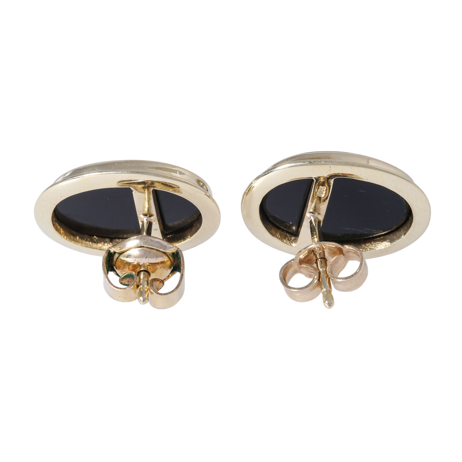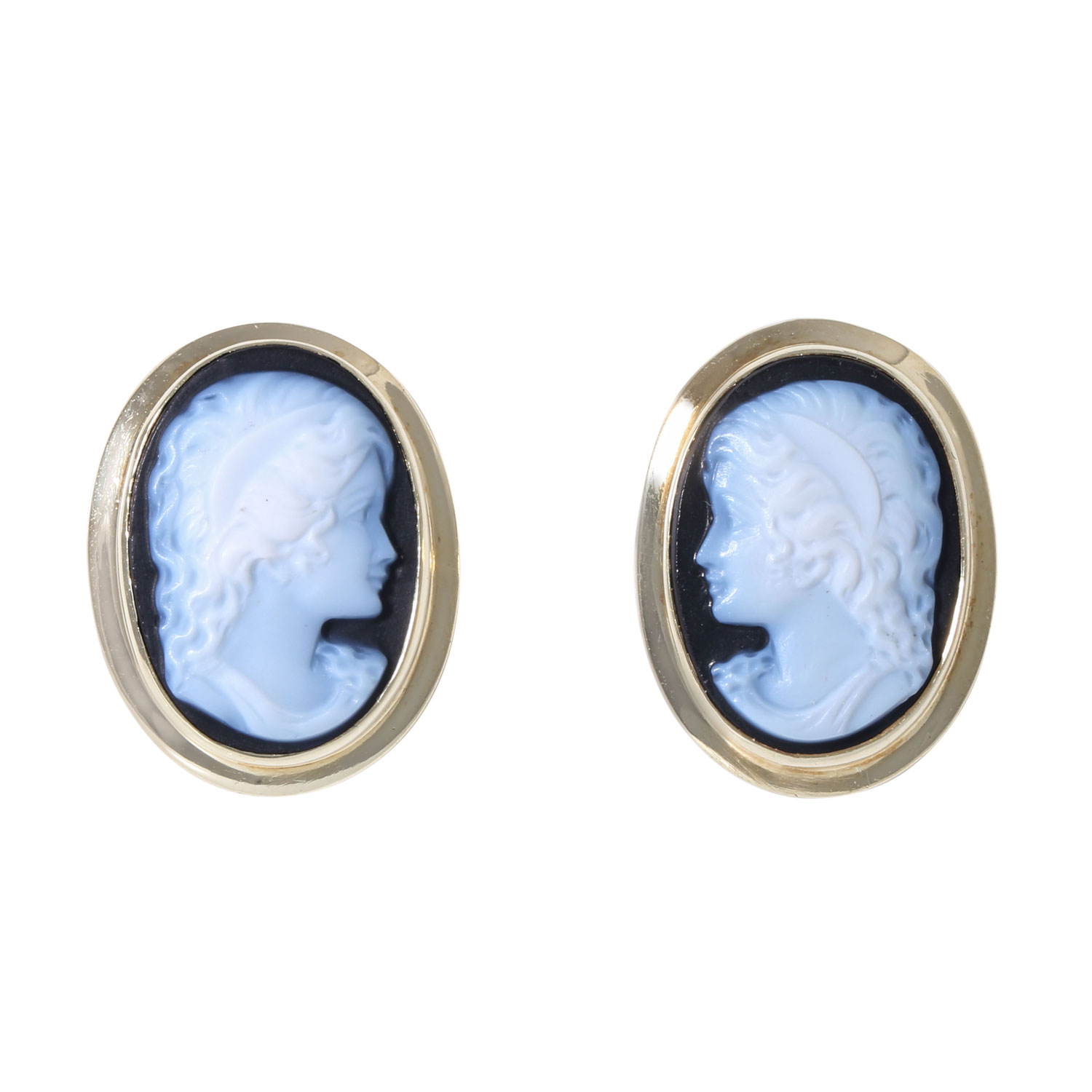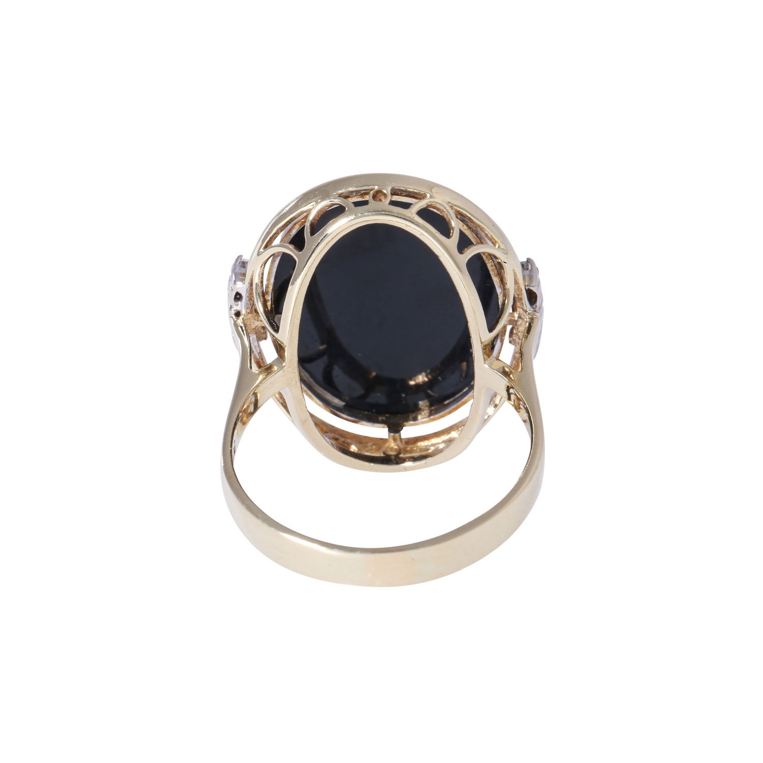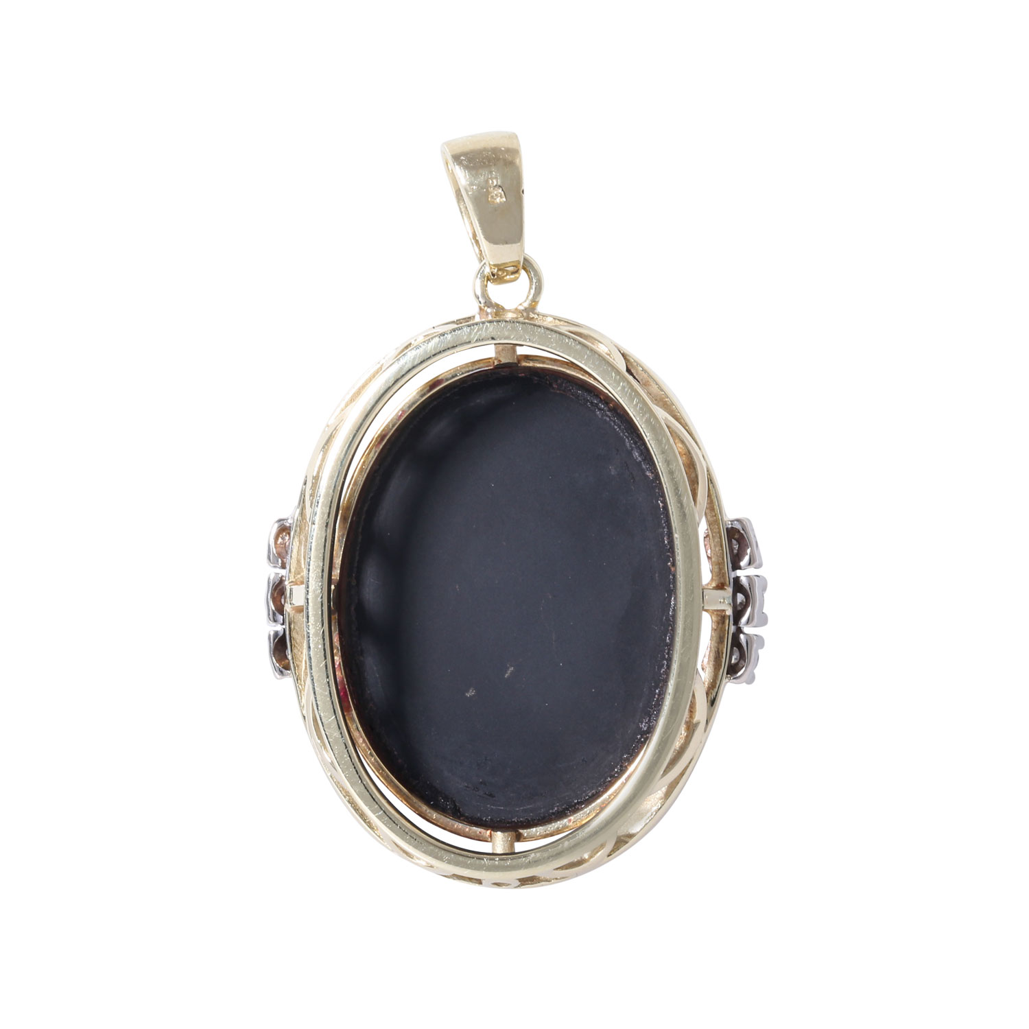 Jewellery set: Ring, pendant and stud earrings, all parts with finely cut agate cameo in the shape of a lady's portrait, ring and pendant each with 6 brilliant-cut diamonds totalling ca. 0.25ct ca. WHITE (H) /SI, YG 14K, total weight 16.9g, ring size 55, pendant L: 30 mm, stud earrings L x W 16 x 12 mm, 20th/21st century, minimal signs of wear.