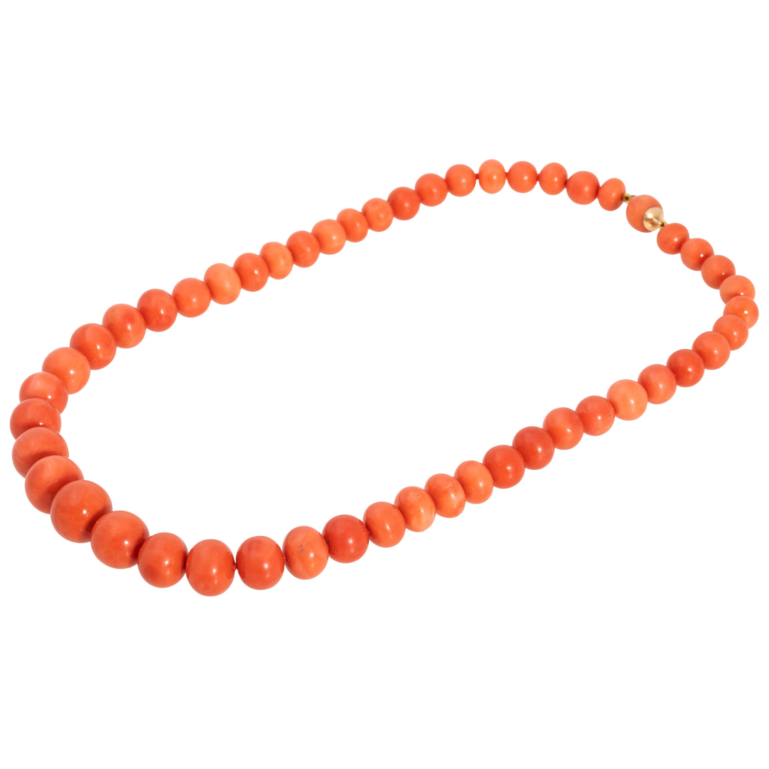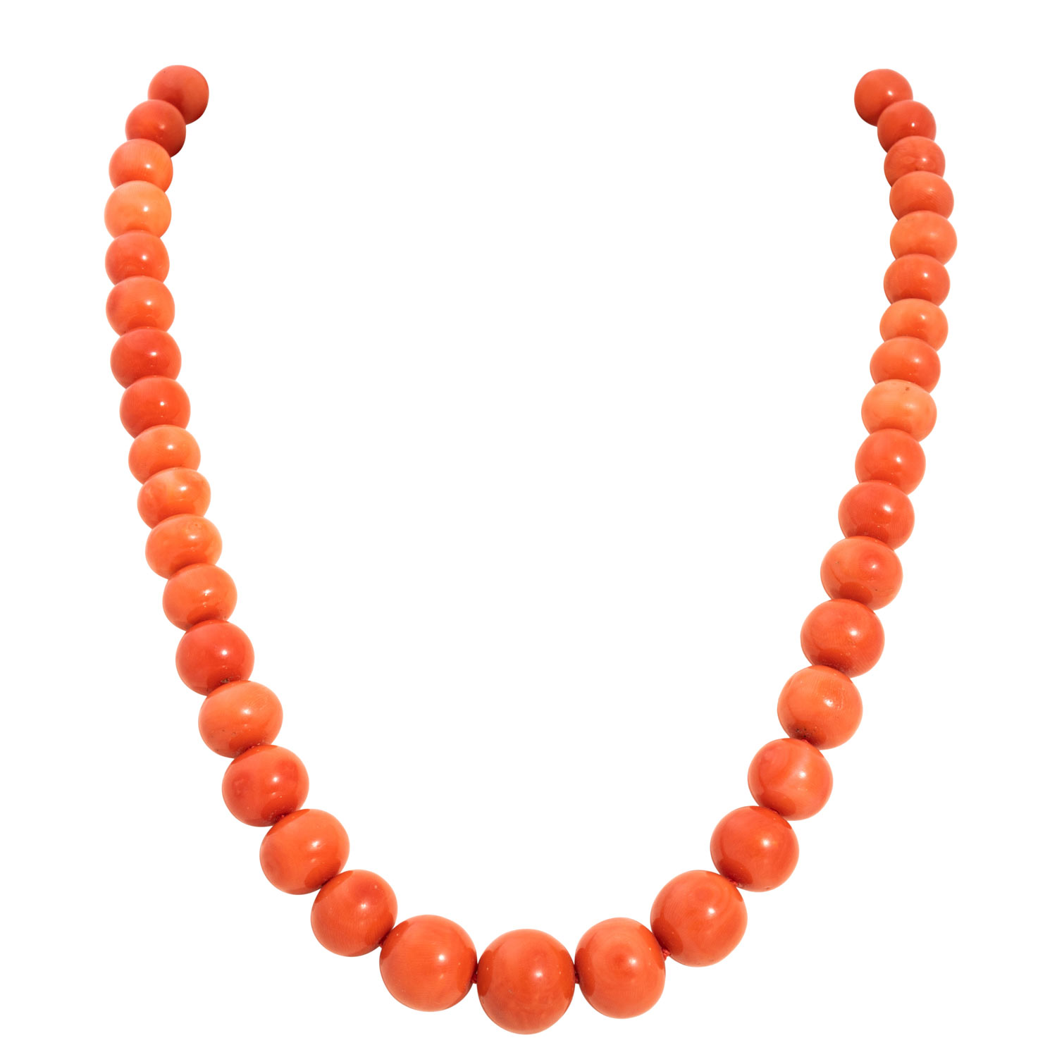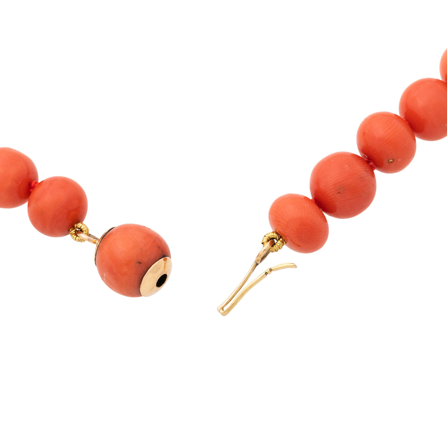 Jewellery set: Coral Necklace and pair of stud earrings, 49 Sardegna coral beads, in sizes from 9.4 - 15 mm, coral bead as clasp with YG setting. 87.8 g, L: 51 cm, 1 claw bead enclosed, pair of ear studs with 2 corals, YG 18K, 3.1 g, D: 10 mm, 20th century, good condition. IMPORT/EXPORT RESTRICTIONS OUTSIDE THE EU!