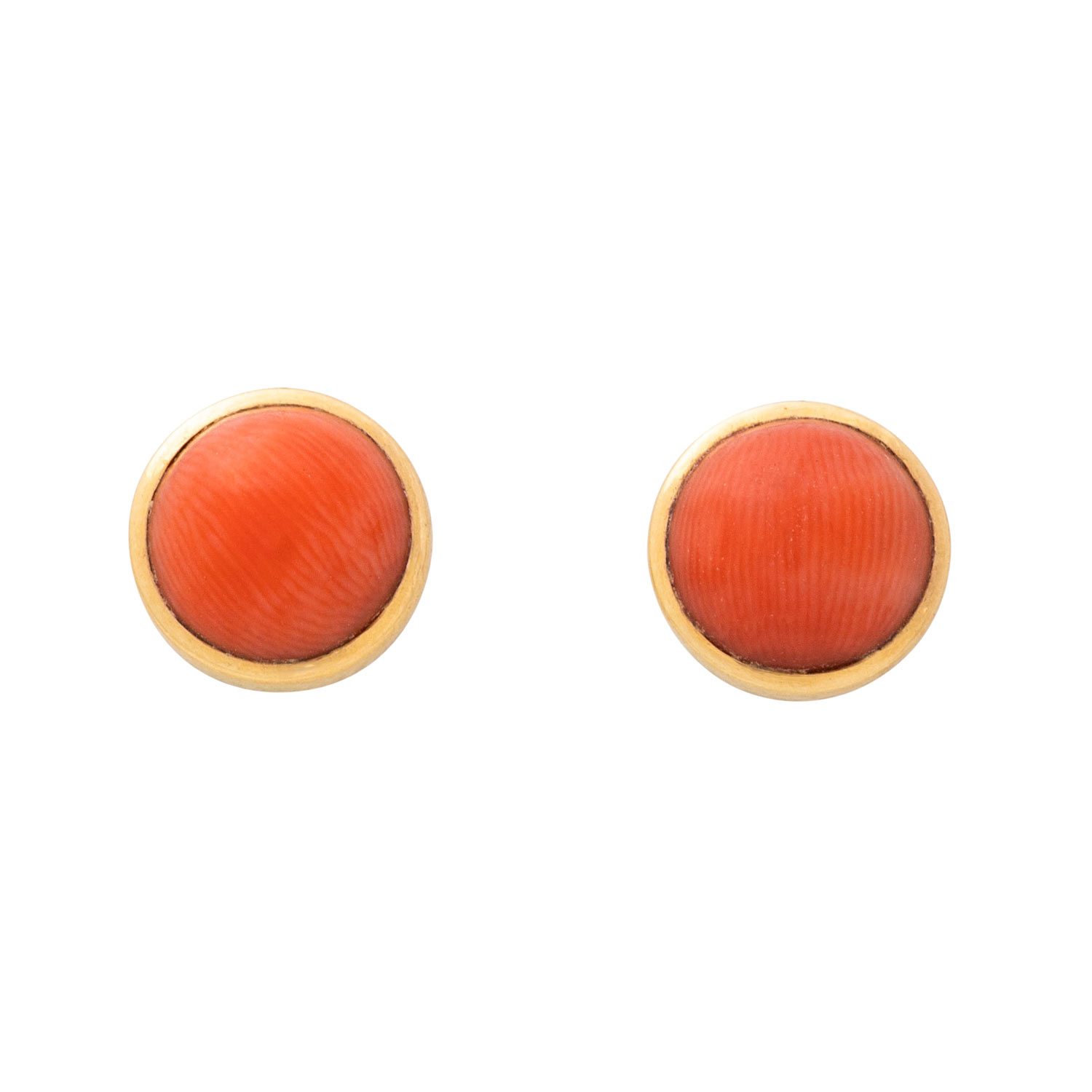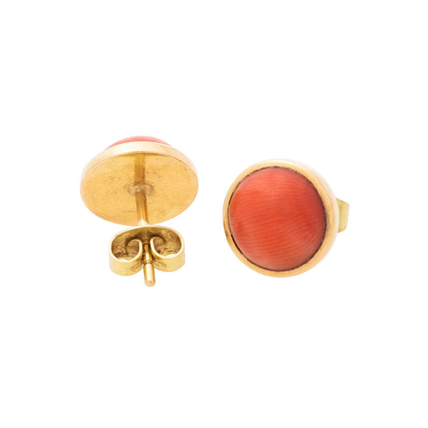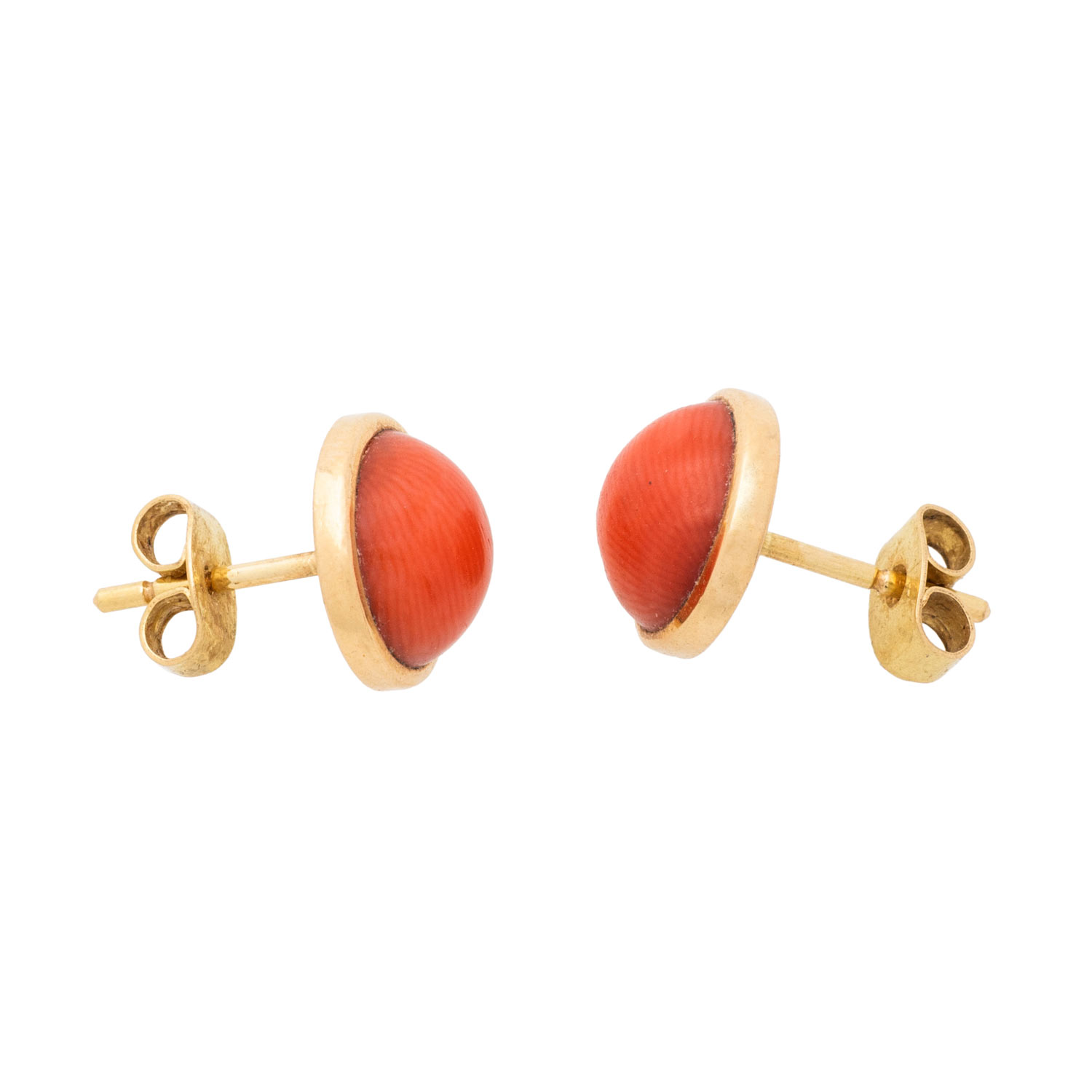 Jewellery set: Coral Necklace and pair of stud earrings, 49 Sardegna coral beads, in sizes from 9.4 - 15 mm, coral bead as clasp with YG setting. 87.8 g, L: 51 cm, 1 claw bead enclosed, pair of ear studs with 2 corals, YG 18K, 3.1 g, D: 10 mm, 20th century, good condition. IMPORT/EXPORT RESTRICTIONS OUTSIDE THE EU!