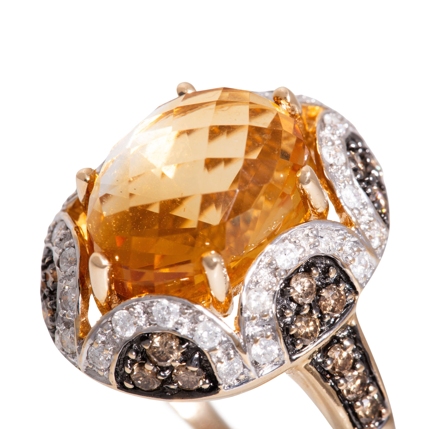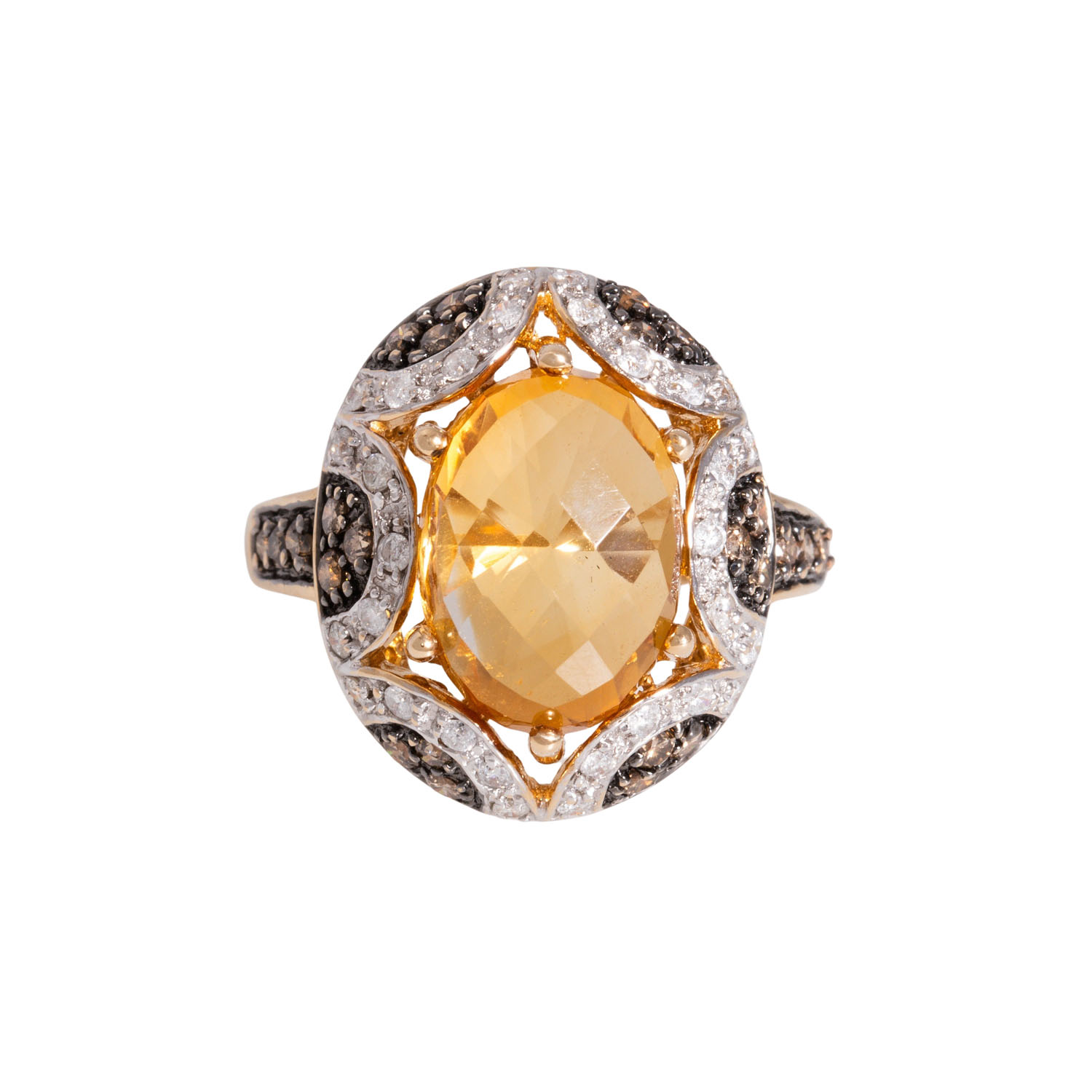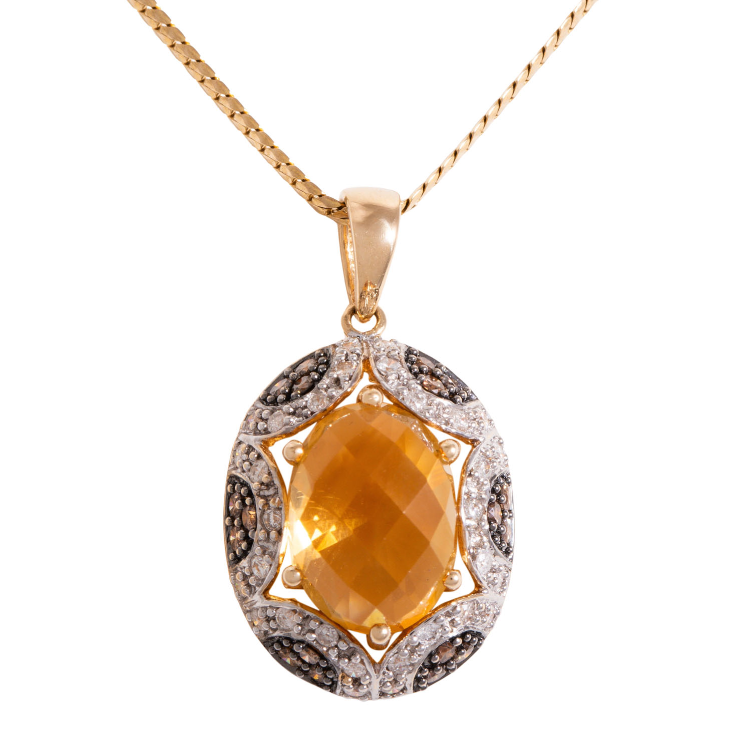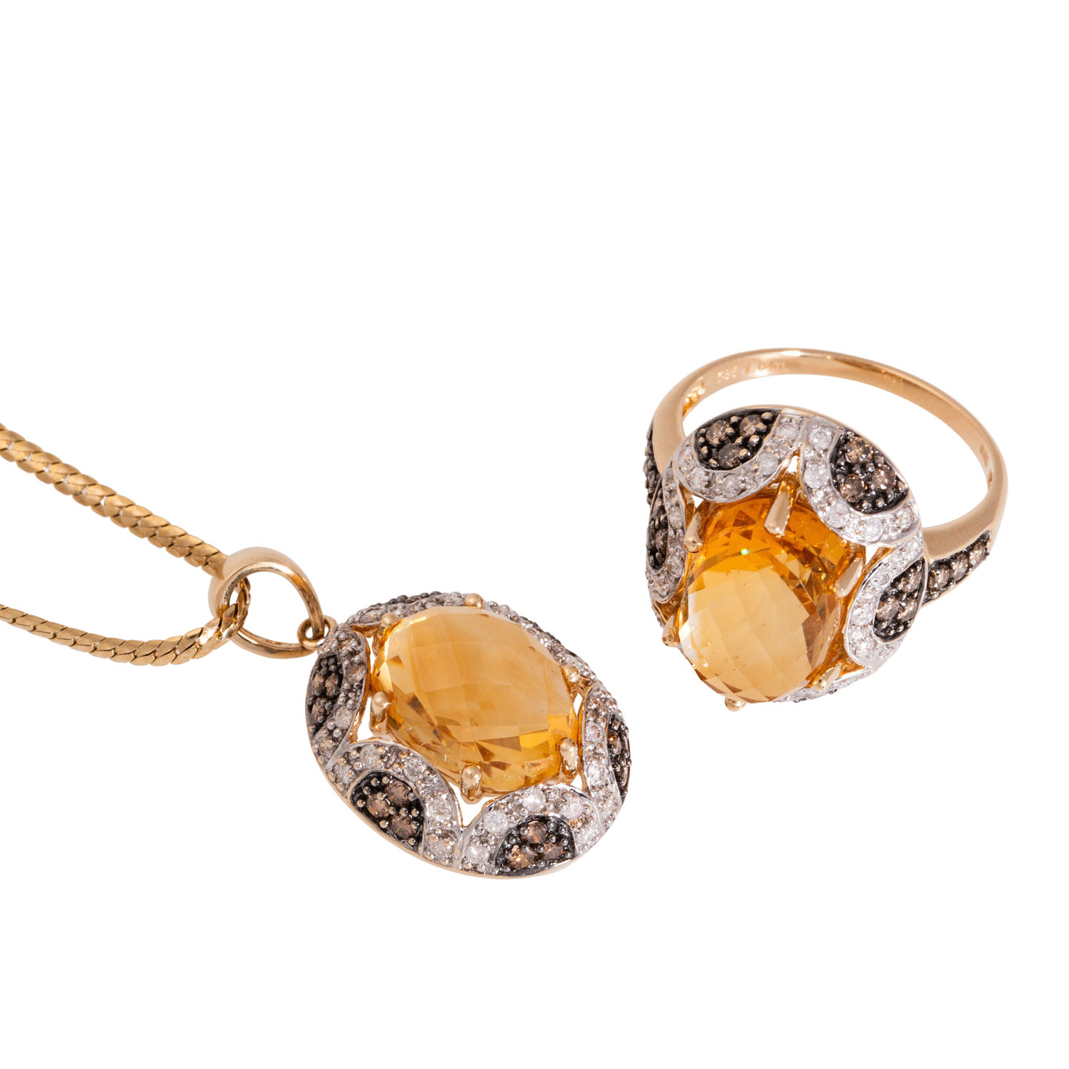 Set ring and pendant with citrines and brilliant-cut diamonds totalling ca. 1.9 ct, engraved 1.04 ct (ring) and 0.91 ct (pendant), low colour and clarity, 14K yellow gold, 14.4 g, ring size 62, pendant with necklace of 8K yellow gold, clasp of silver gilded, L: 46 cm, 3.5 g, 20th/21st century, necklace with signs of wear, otherwise good condition.