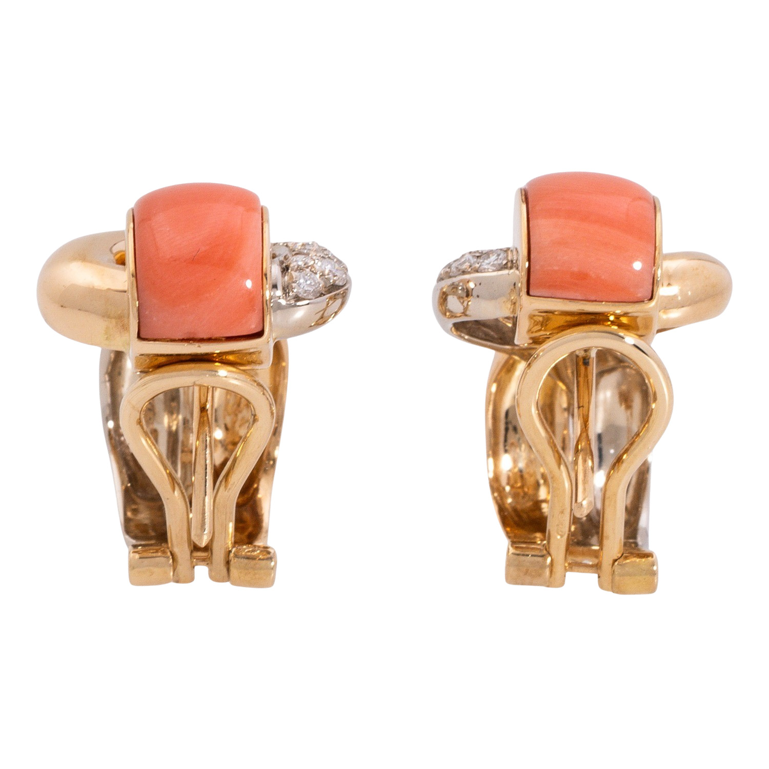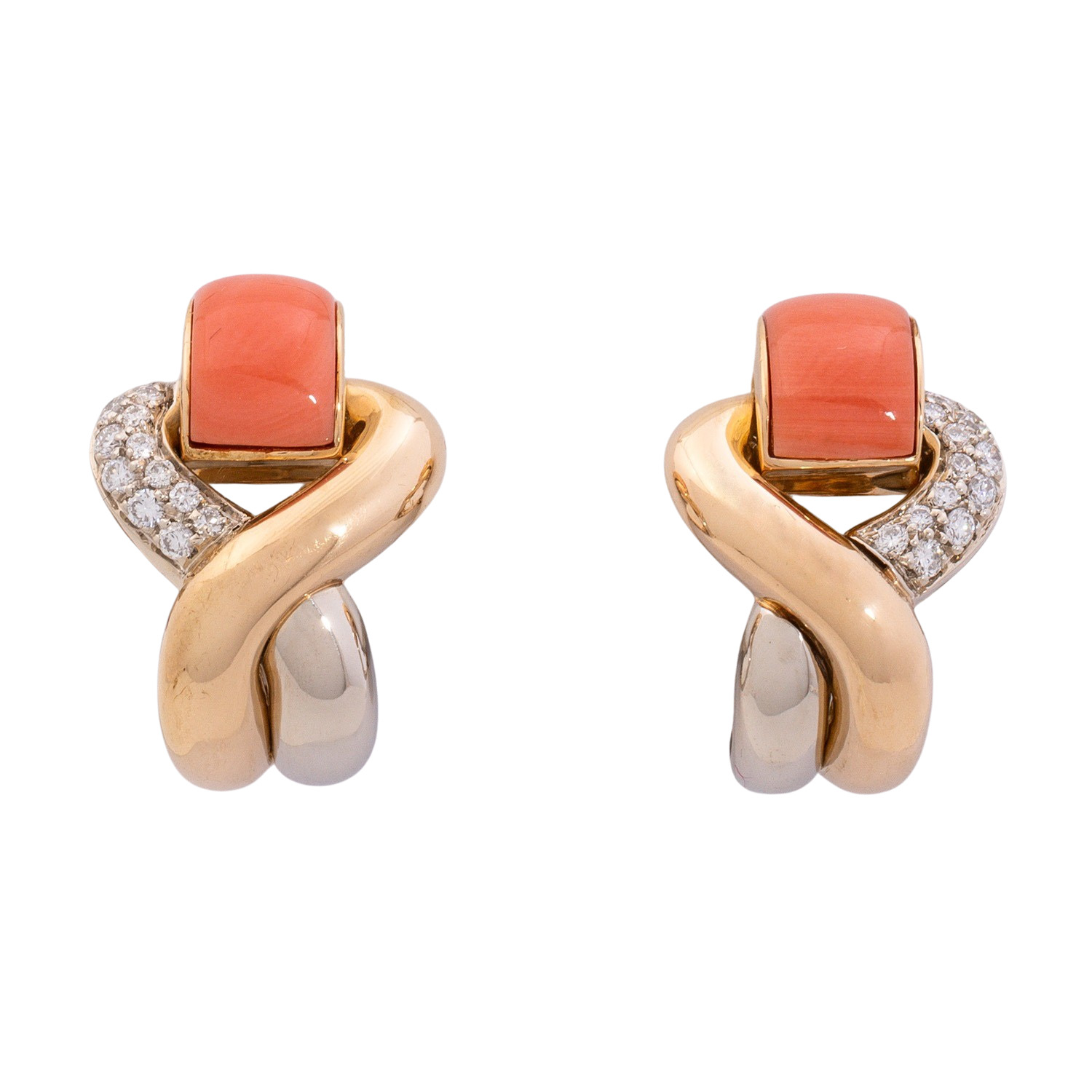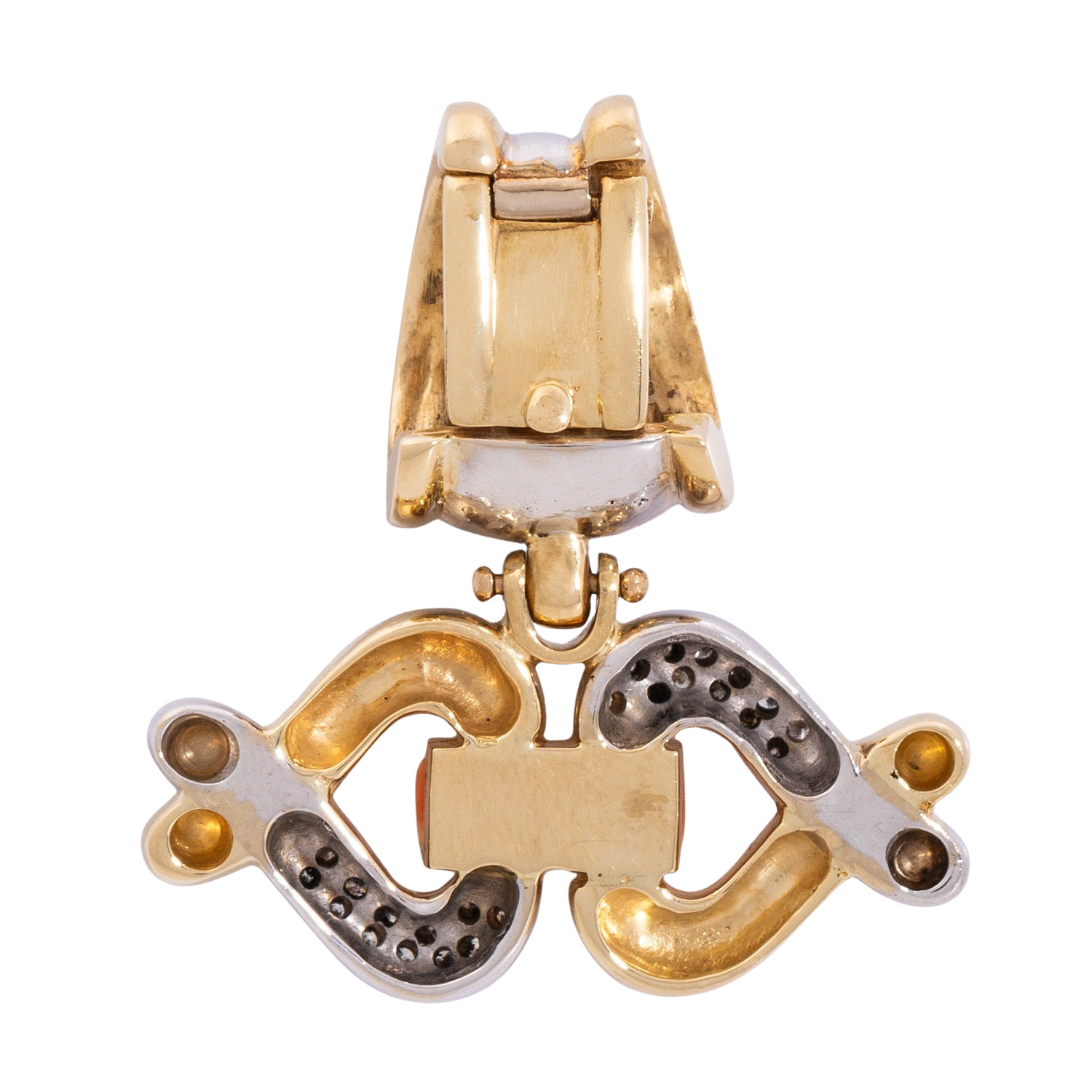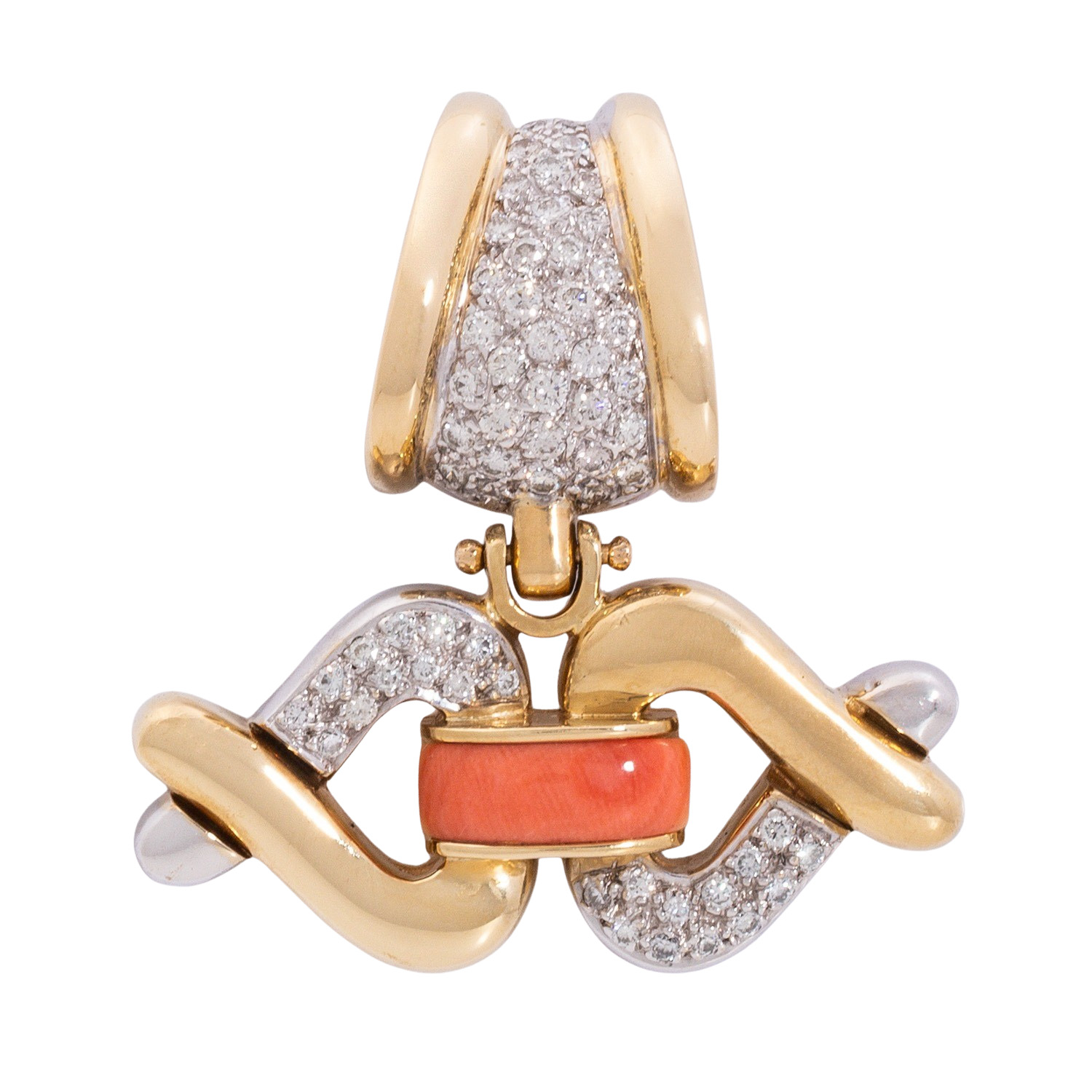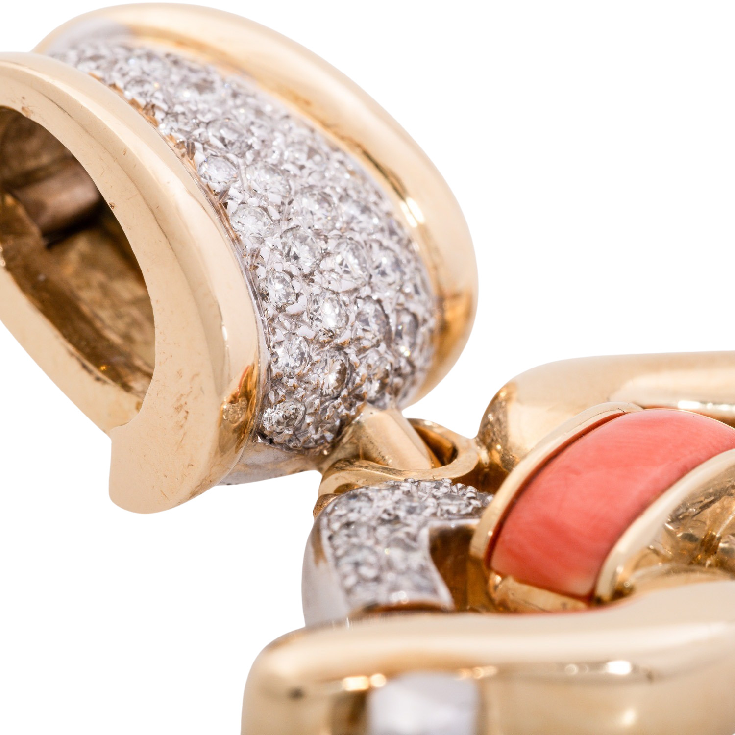 Jewel set with coral and brilliant-cut diamonds totalling ca. 1.4 ct, good colour and clarity, 18K yellow and white gold, 17.9 g, of which 1 pair of GIO CAROLI earrings 2.3x1.7 cm, with brand signature and Italian maker's mark and 1 pendant in the corresponding design without signature and mark, late 20th century, earrings in a good condition, pendant with signs of wear and work. NO SHIPPING OUTSIDE THE EU!