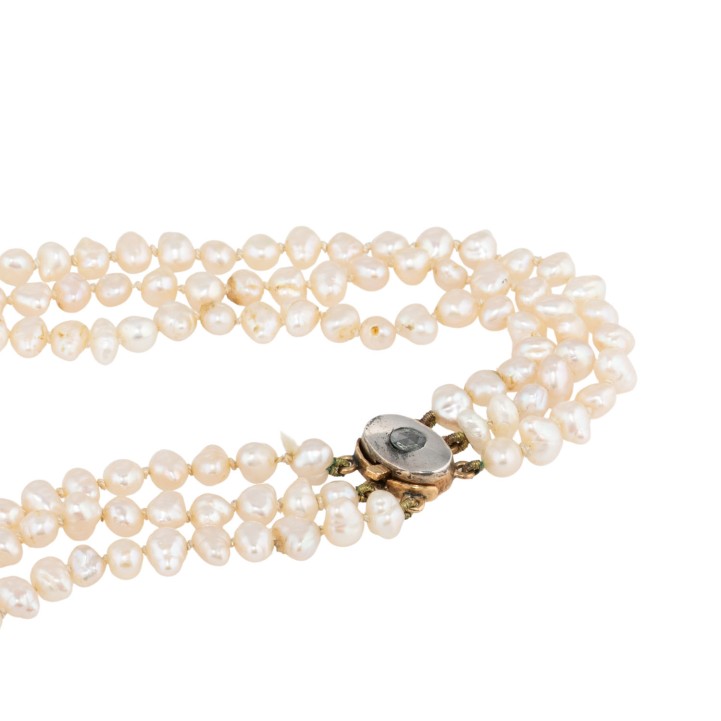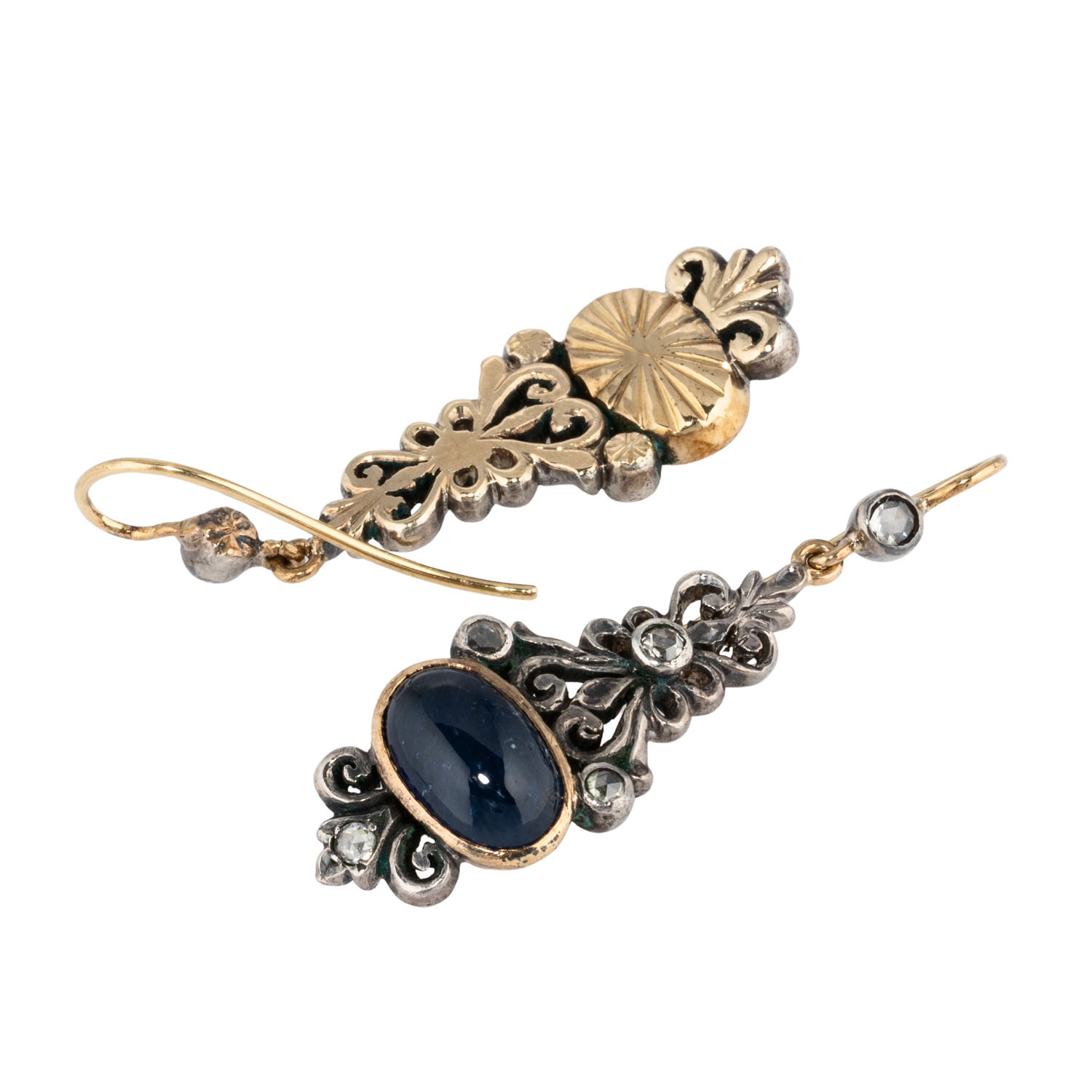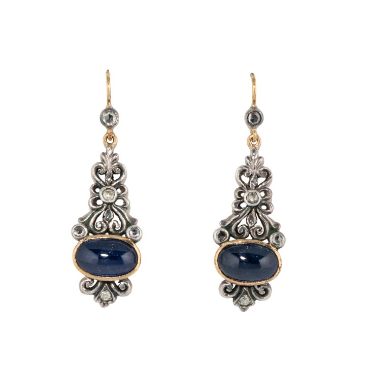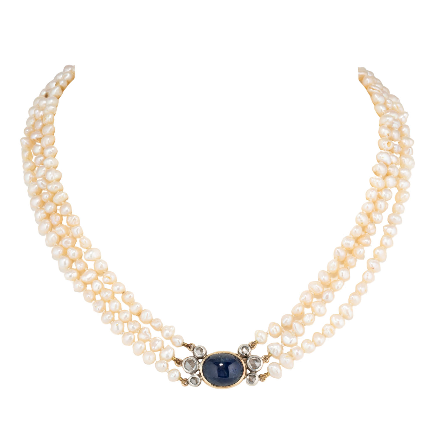 Jewellery set with oval cabochon-cut sapphires and rose-cut diamonds, 18K yellow gold, and silver, 48.9 g, consisting of 3-row necklace from Fresh Water cultured pearls L: 37 cm, and earrings L: 5 cm, 20th century, minor signs of wear (matching ring Kat. Nr. 208).