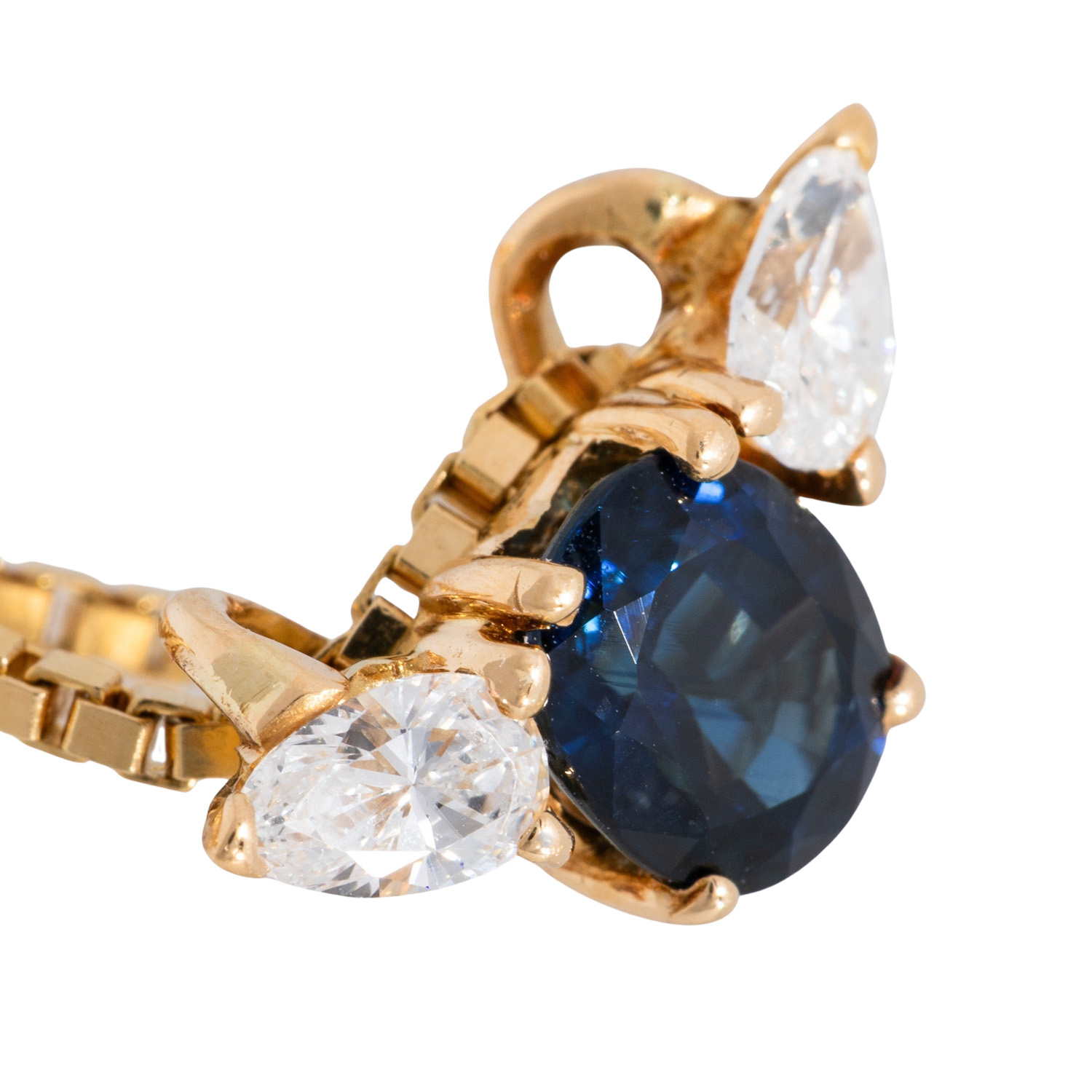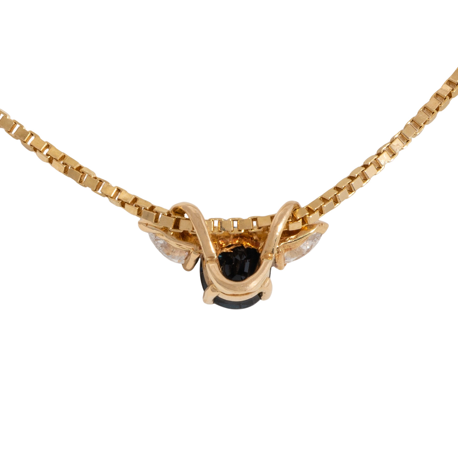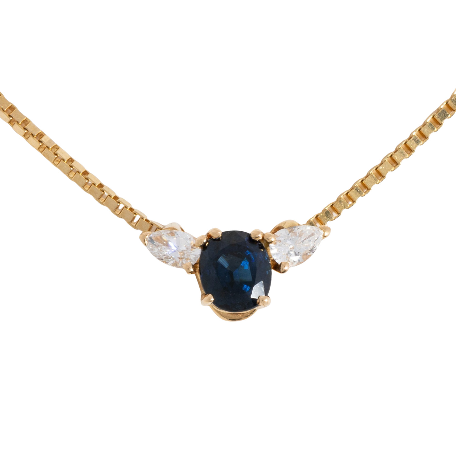 Bundle of necklace with pendant and ring, 18K yellow gold, 11.6 g, necklace L: 45 cm, pendant with oval faceted sapphire flanked by pear-cut diamonds totalling ca. 0.3 ct, ca. EW-RW (E-F)/SI-P1, ring size 55 with round sapphire and brilliant-cut diamonds totalling ca. 0.5 ct, ca. RW (F-G)/SI, late 20th century, ring with minor, necklace with distinct signs of wear.