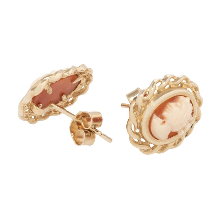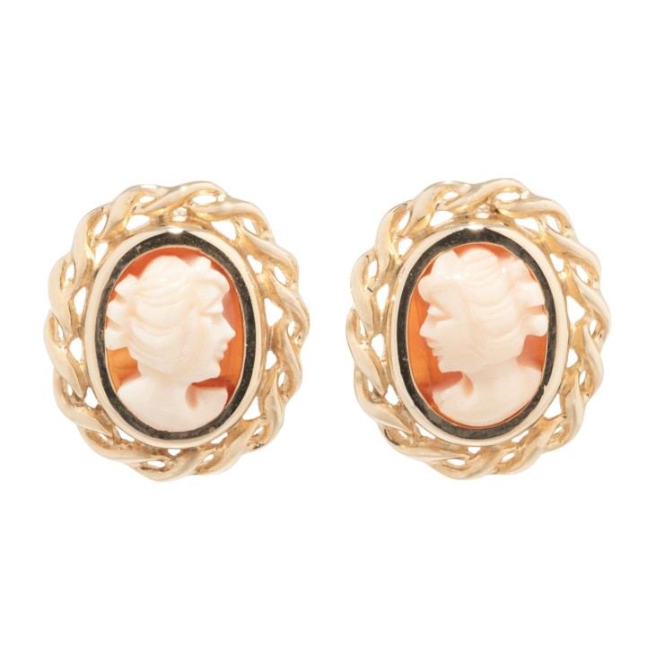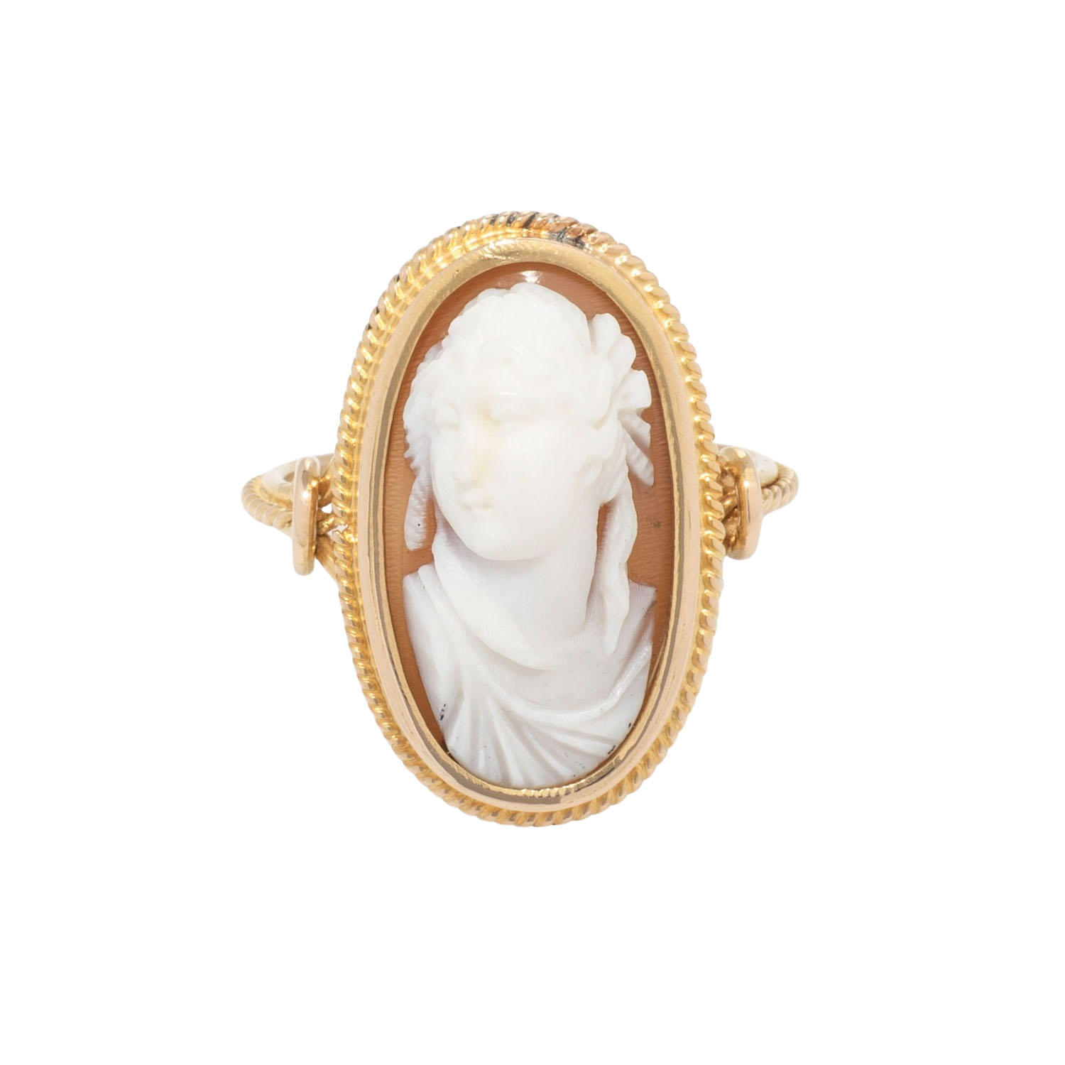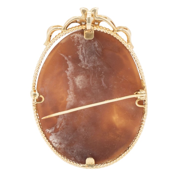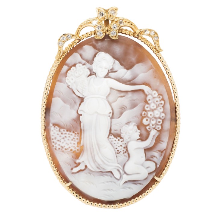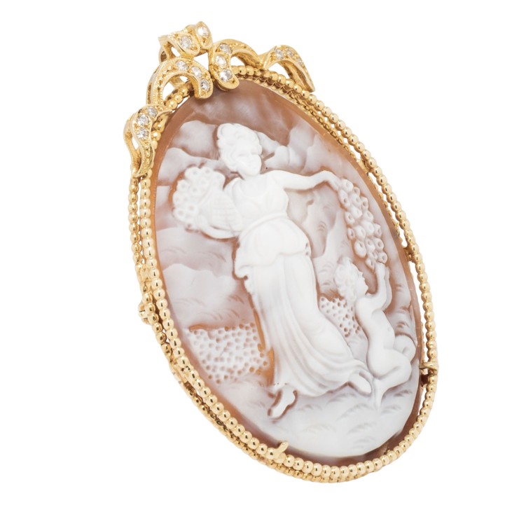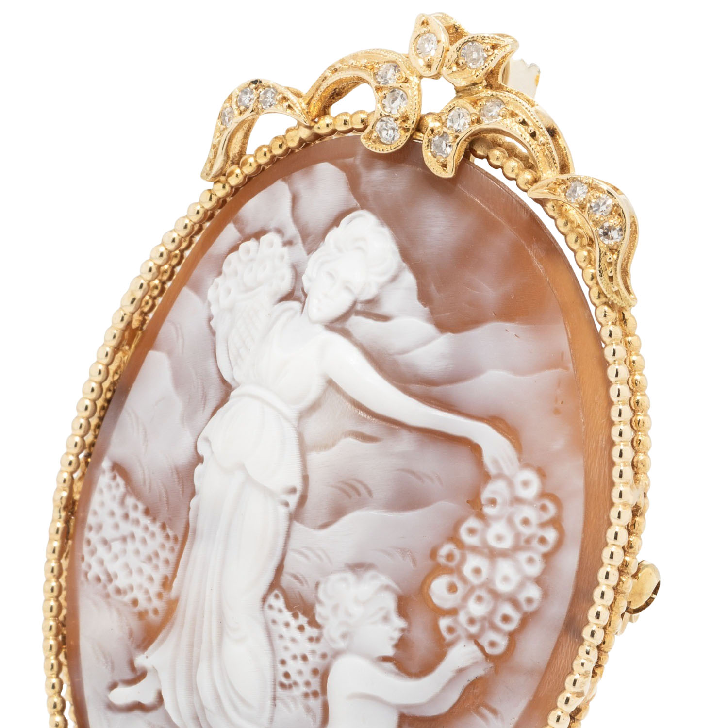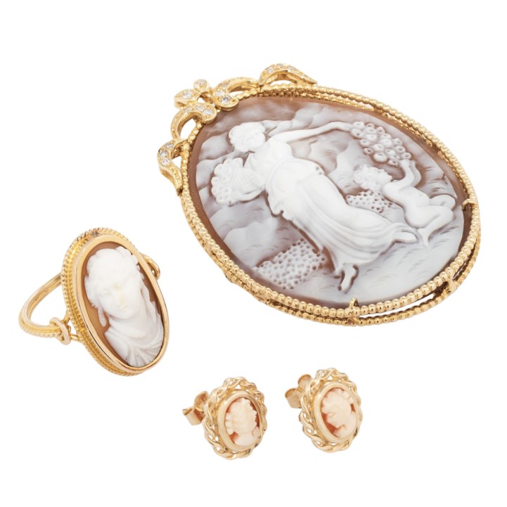 Jewellery bundle with shell cameos and single-cut diamonds totalling ca. 0.1 ct, consisting of ring with depiction of Hera, 18K yellow gold, 6.3 g, ring size 56, including certificate of Hofer/Berlin, further brooch/pendant 6x4 cm and earrings 13x11 mm of 14K yellow gold, 18.4 g, back studs doublé, 20th/21st century, partly minor signs of wear.