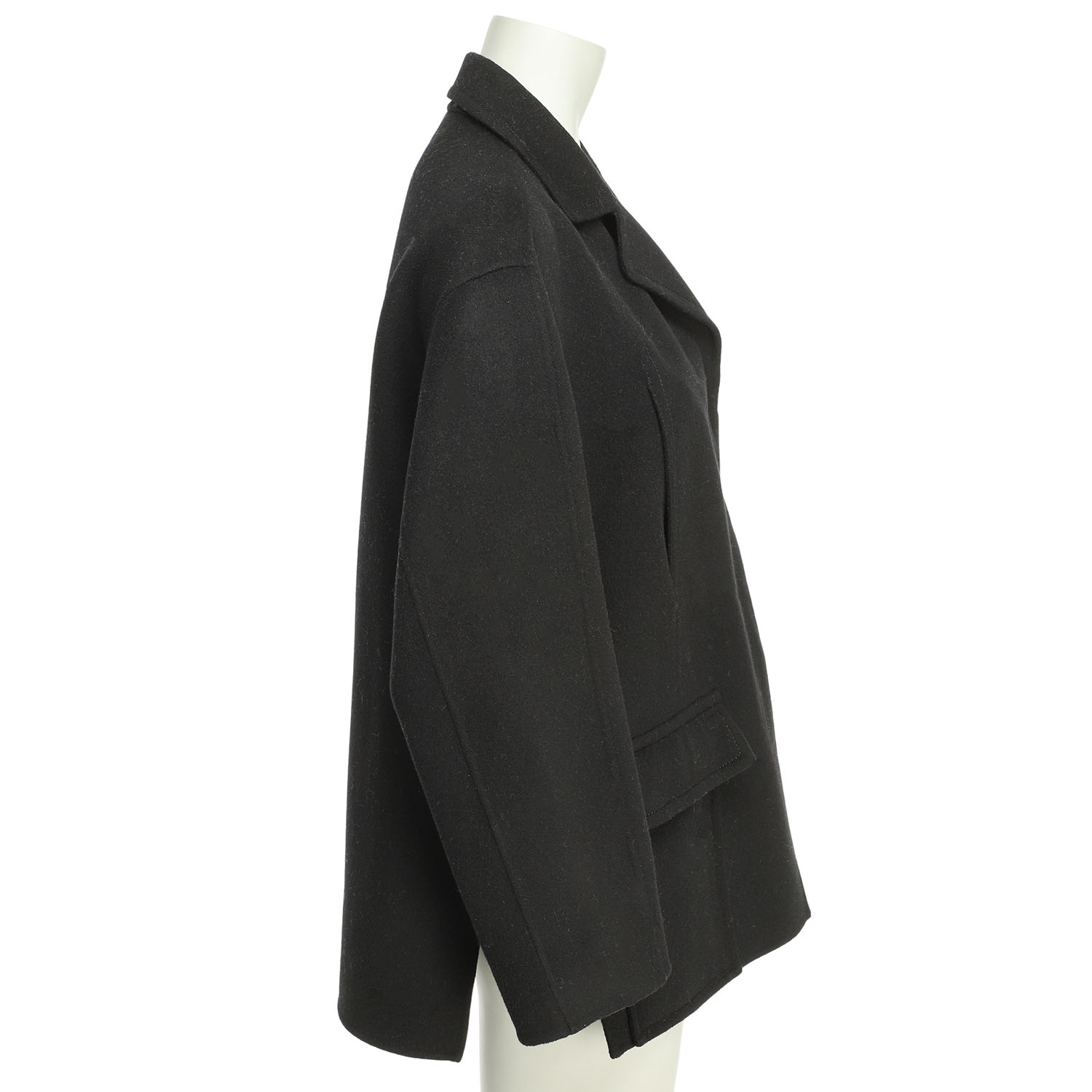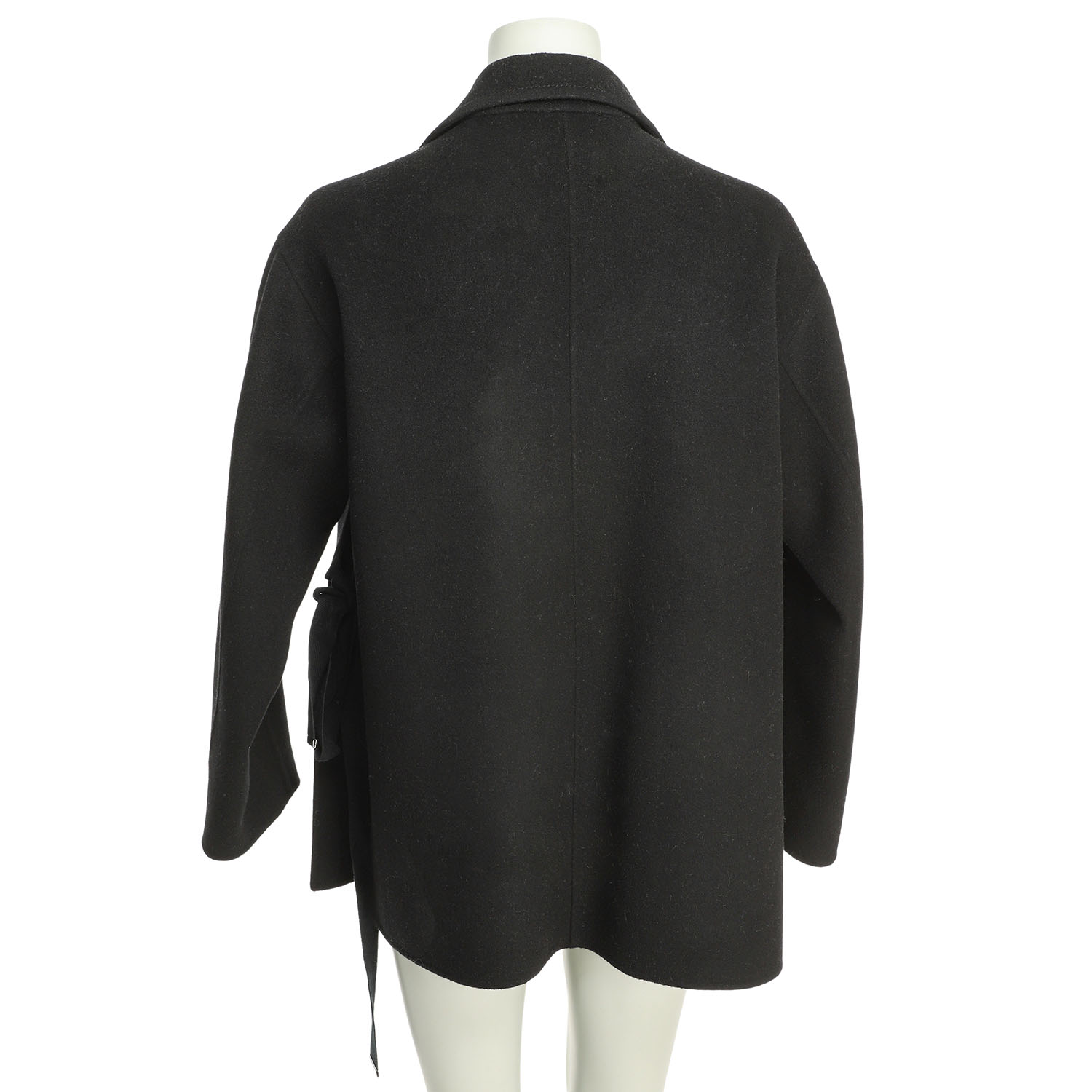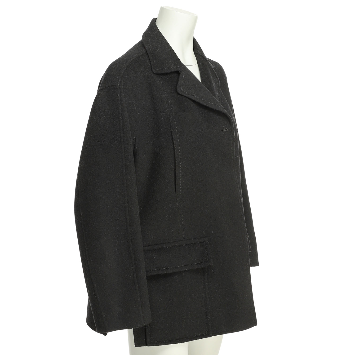 JIL SANDER jacket, size 38. 90% wool, 10% cashmere in black with lapel collar, button placket, side slits with drawstring and two slit pockets. In good condition.