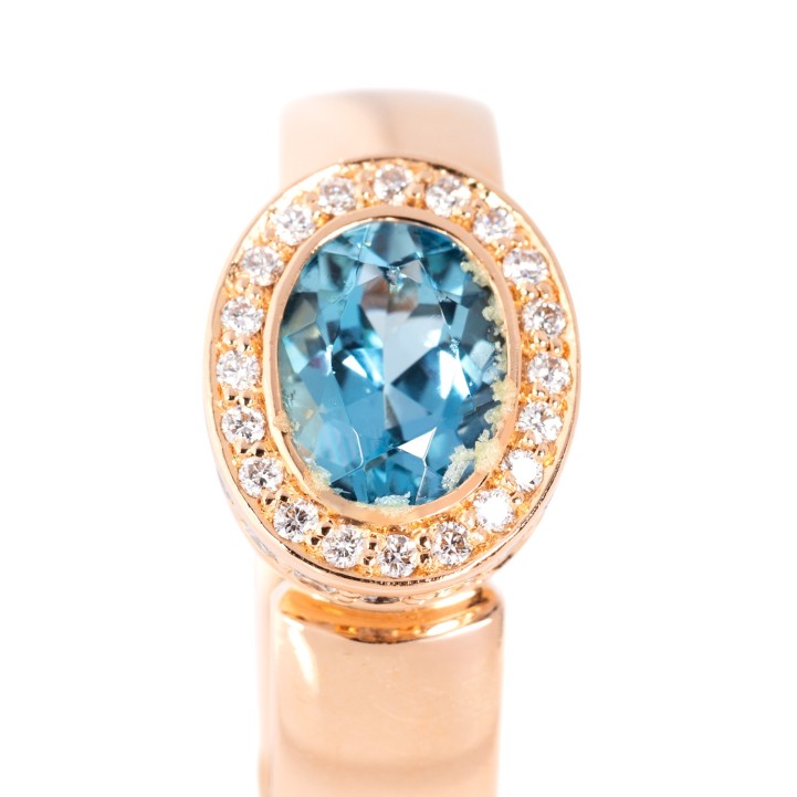 JOCHEN POHL ring with aquamarine and small brilliant-cut diamonds totalling ca. 0.44 ct (marked), good to very good color a. clarity, 18K RSG, 15.5 g, ring size 57.5, 21st century, minor signs of wear, aquamarine slightly chipped, incl. sales receitp (2011).
