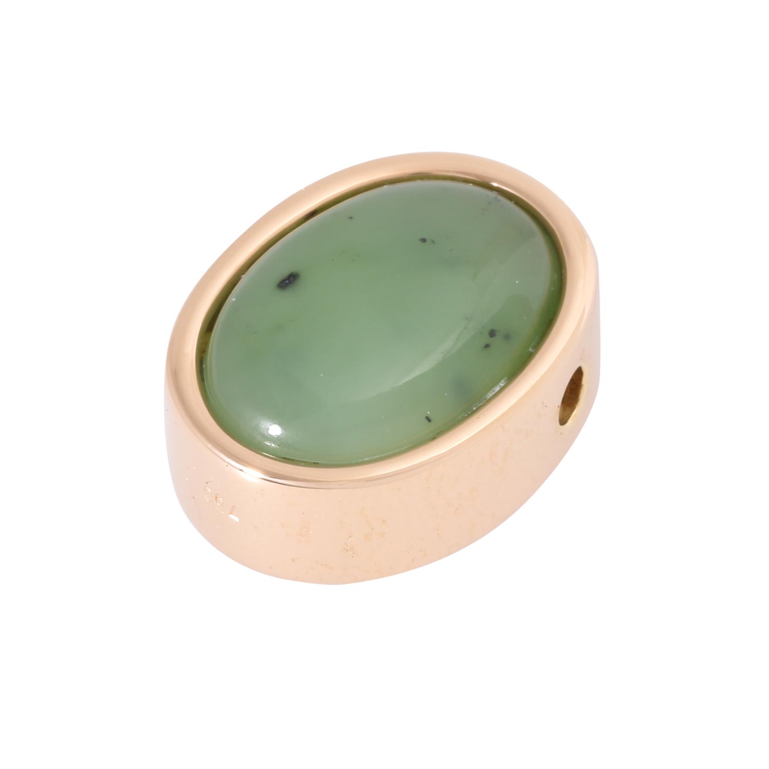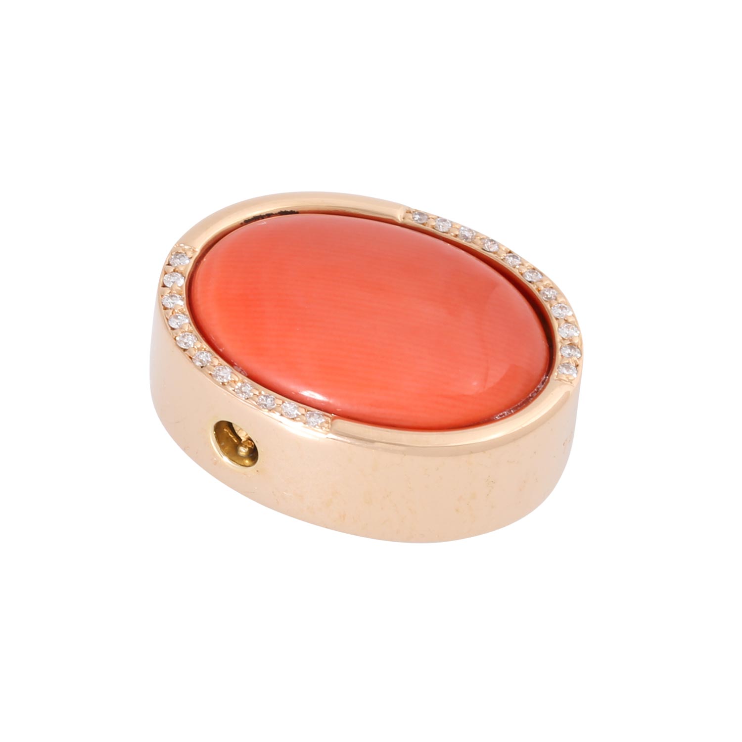 JÖRG HEINZ Bajonette clasp, interchangeable, with oval coral and nephrit cabochons, 18 x 13.5 mm, 22 brilliant cut diamonds, totalling ca. 0.11 ct, good colour and clarity, 18K rose gold 13.3 g, L x W: 21.5 x 16.6 mm, late 20th century, minimal signs of wear.