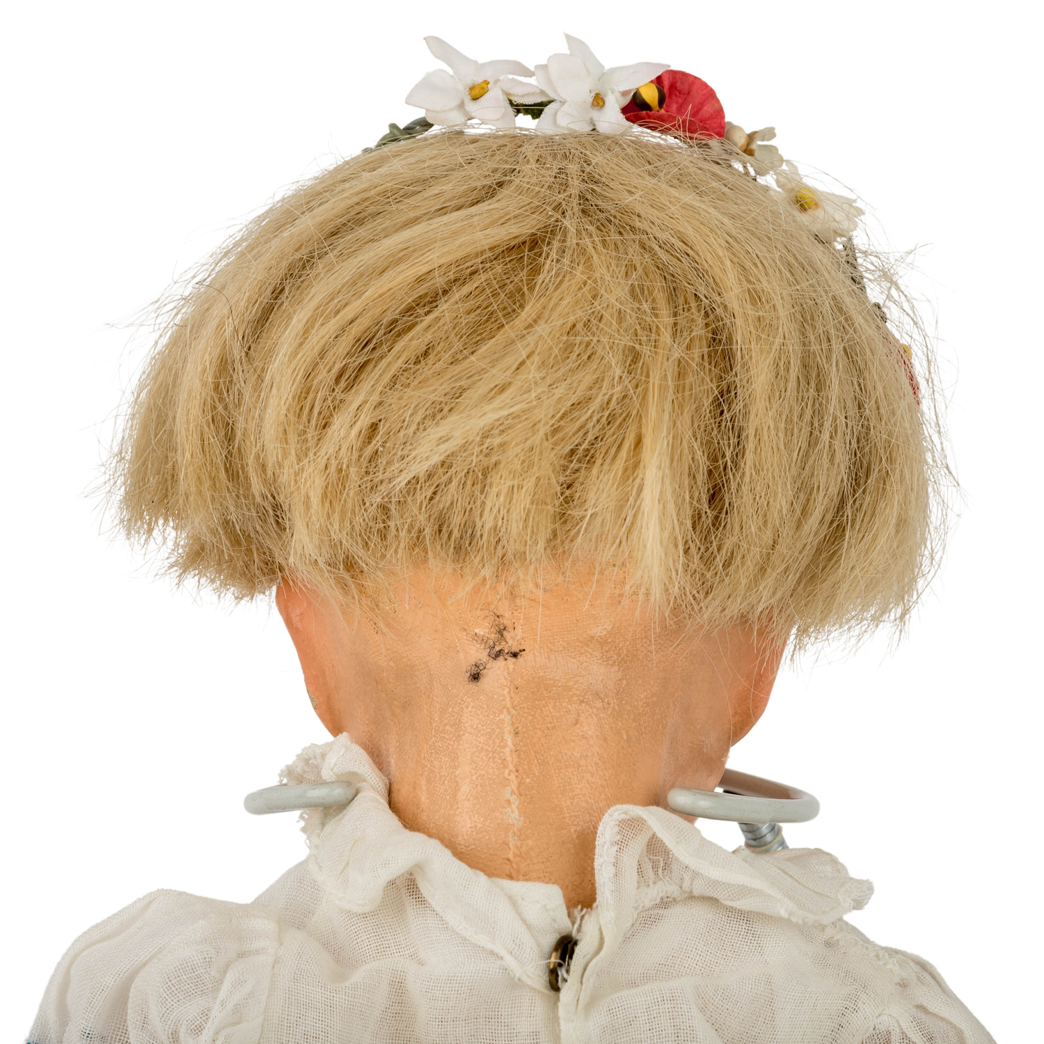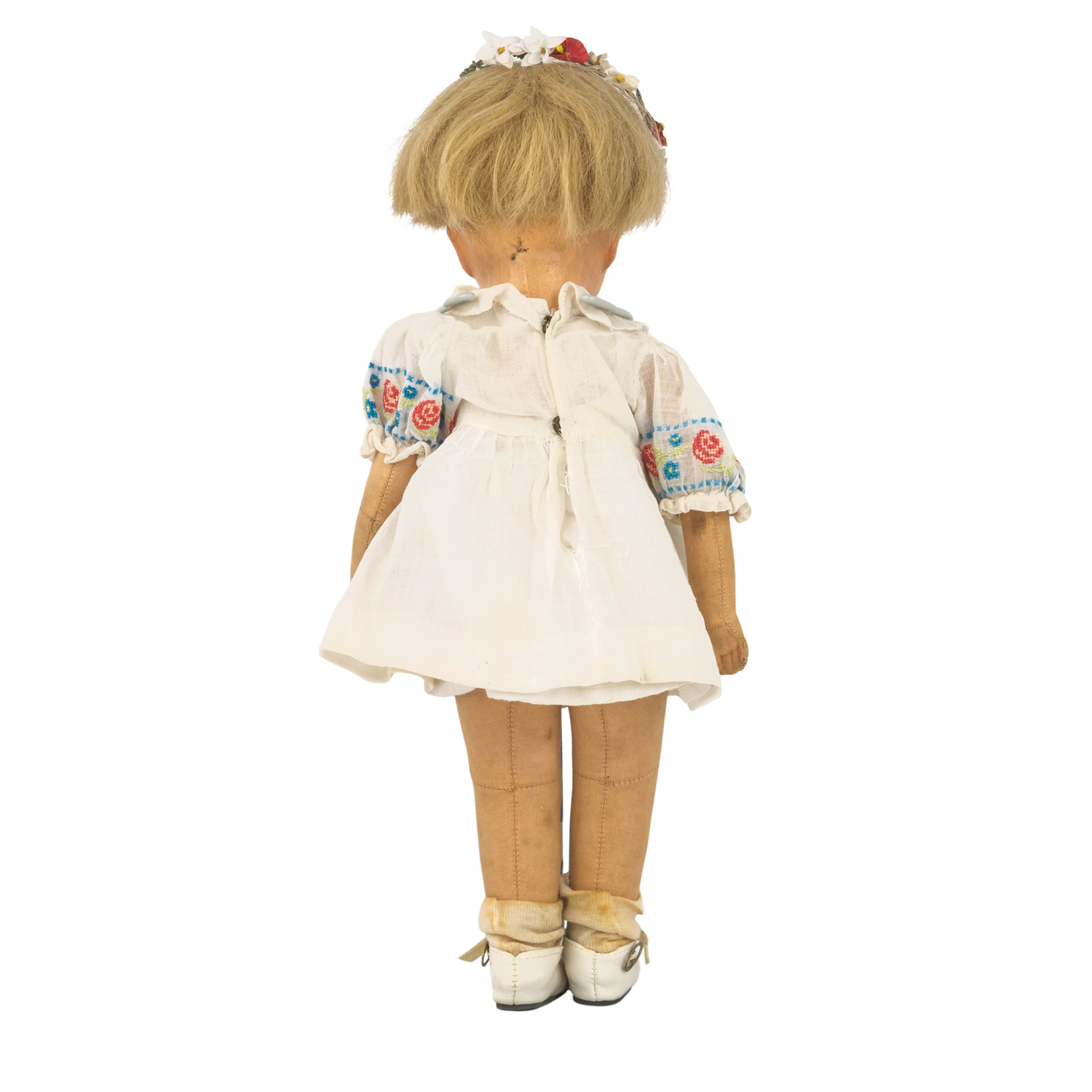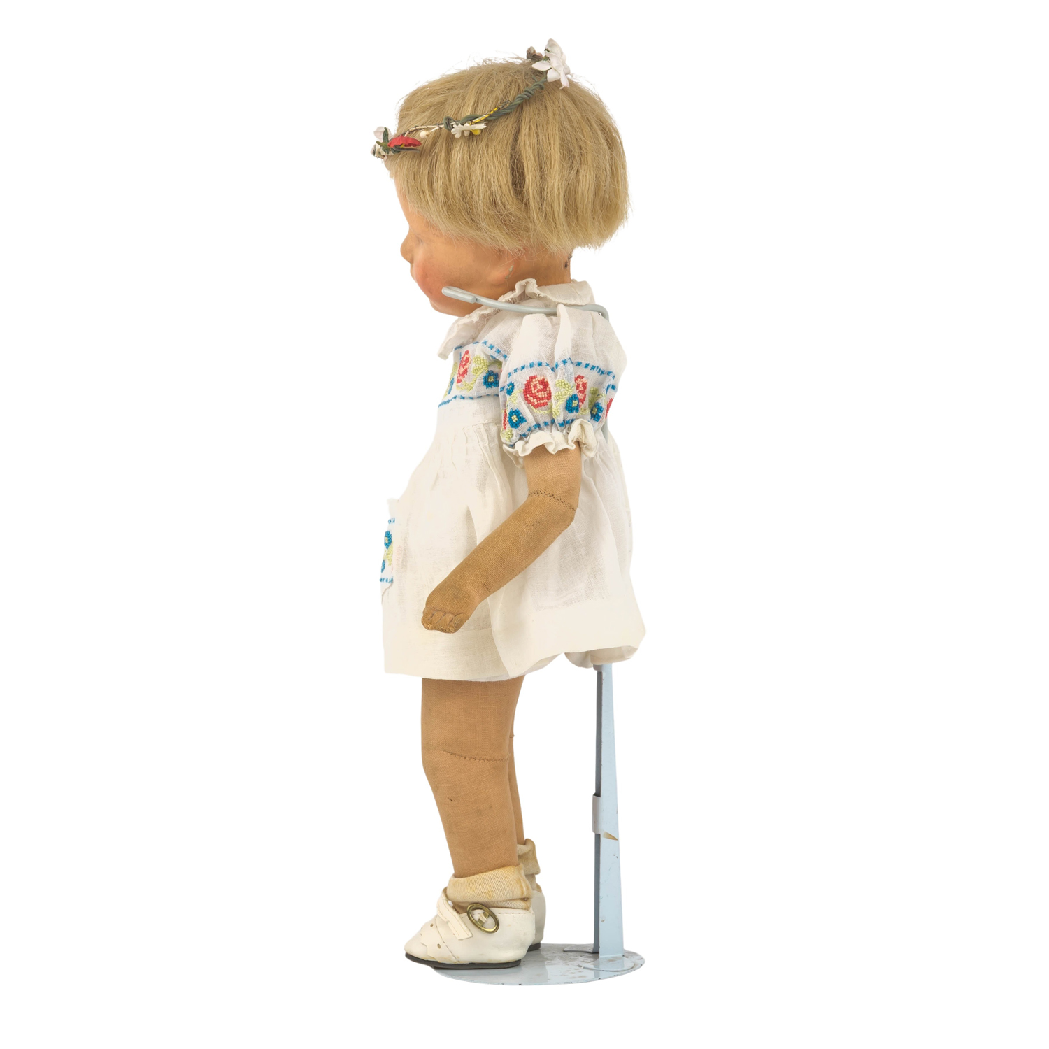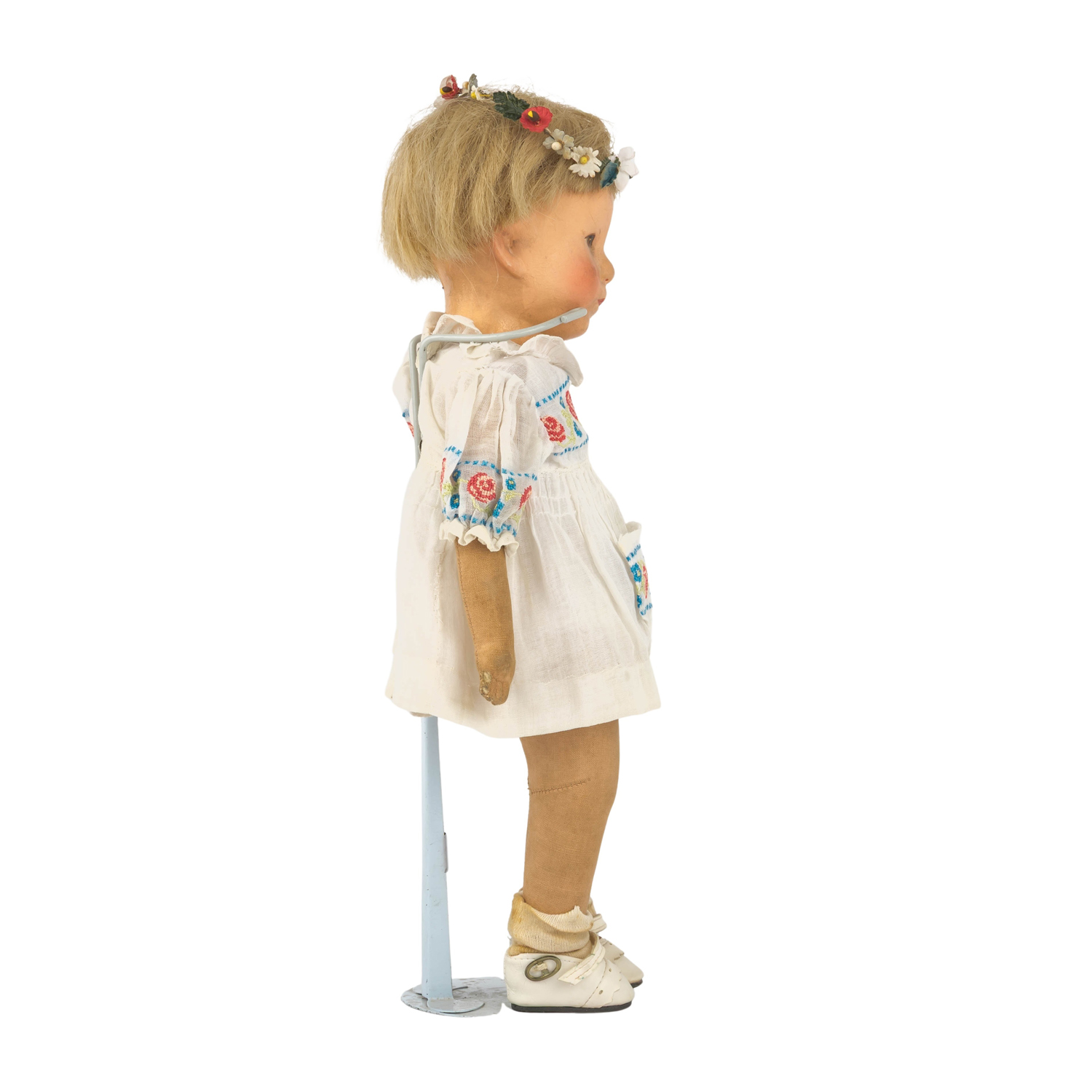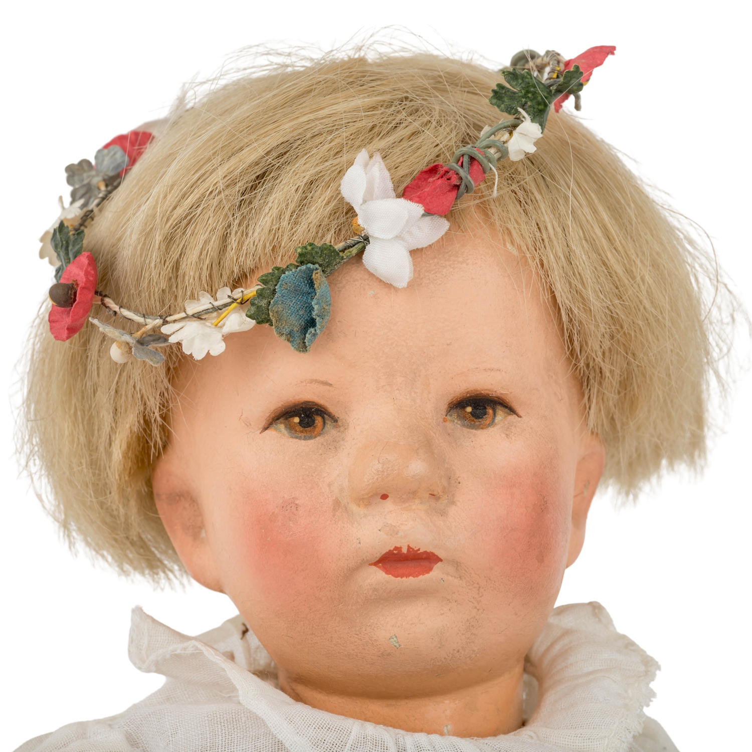 KÄTHE KRUSE Doll IX 'The Little German Child', 1930s, Crank head with blond wig (trimmed), one seam at the back of the head, facial paint with brown eyes, nose painted over, some paint rubbed off, muslin body with elbow seam (spotted), individually stitched fingers (right seam open), 5 leg seams, soles illegibly stamped, dress, shoes, stockings, and flower wreath included. Signs of age, height 36.5 cm