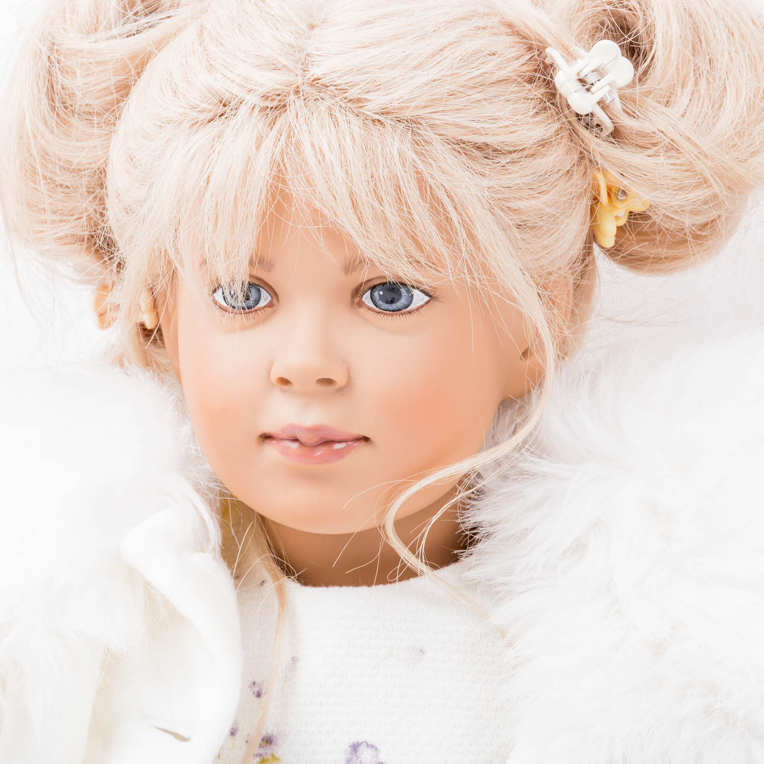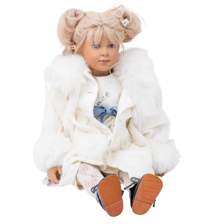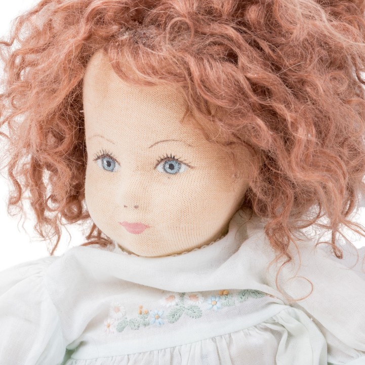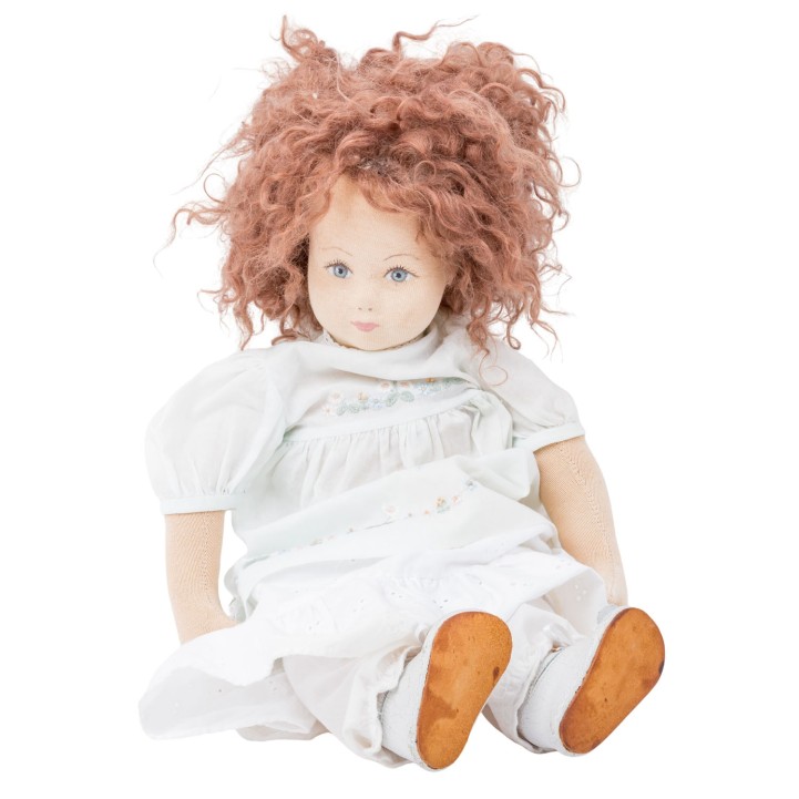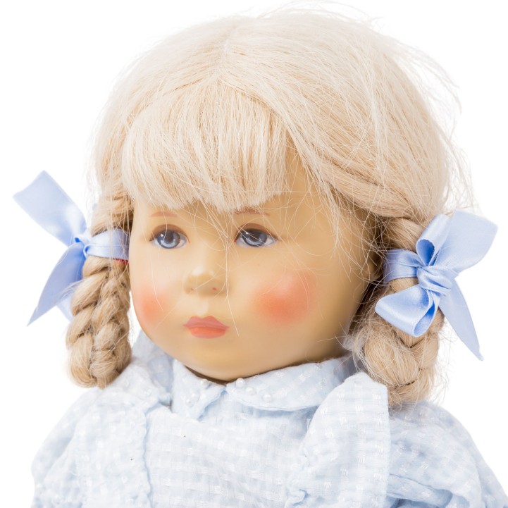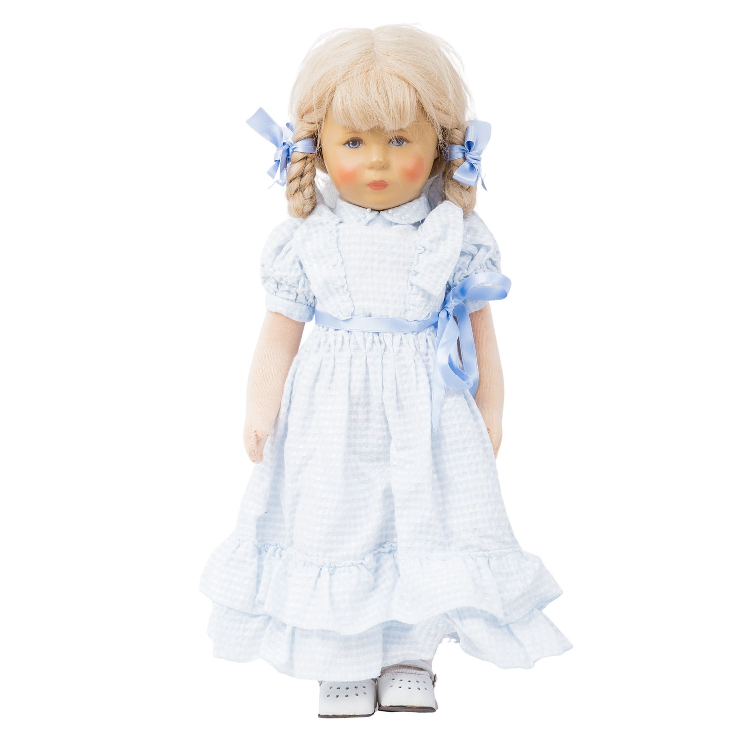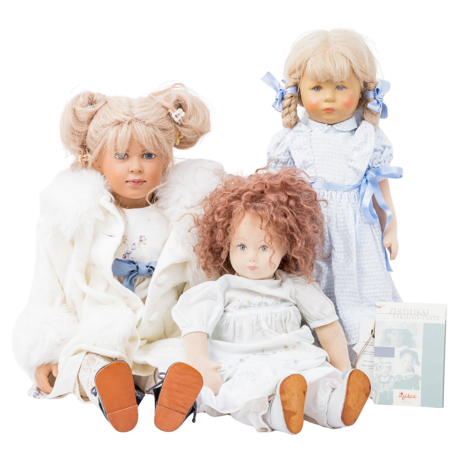 KÄTHE KRUSE/SIGIKID 3-piece set of dolls, 1980s/90s, KÄTHE KRUSE girl doll XII. Foot soles stamped with 'Käthe Kruse' and 'Apr. 86,' plastic head, long blond wig, H 47 cm, including dress and shoes; SIGIKID large girl doll, designed by Ilse Wipper, limited to 300 pieces, clothing and certificate included, H 63 cm, plus a cloth doll by an unknown manufacturer, girl doll with curly brown wig (sewn on), painted face, clothing included, H 43 cm.