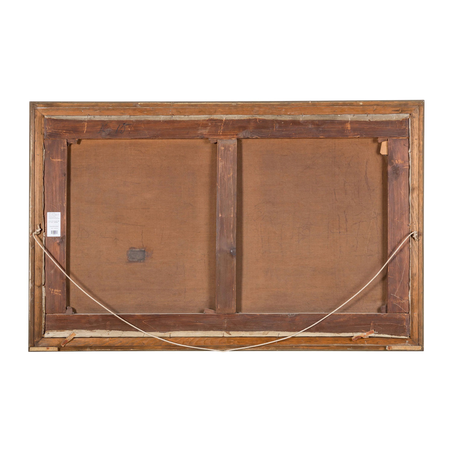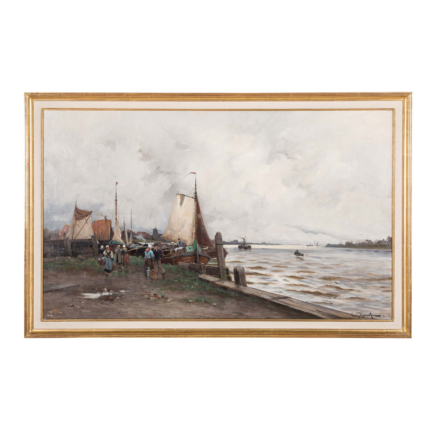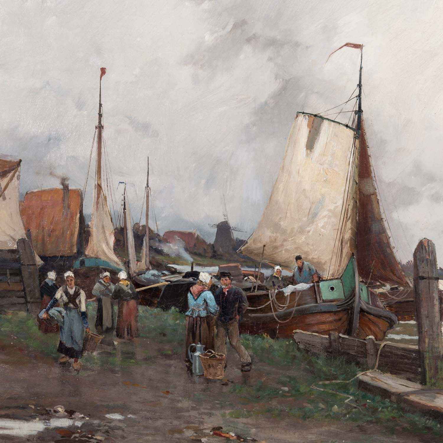 KAMPF, EUGEN (1861-1933), 'Fishermen and women in the boat harbor in front of the village', on the Dutch coast, in the background silhouette of a town and a promontory, u.re. signed, oil/canvas, HxW: approx. 72x120 cm (83x130 cm with frame). Signs of age and wear, part. slightly cracked, chipped paint, restored with a canvas lining patch on the reverse. With frame. VERSO handwritten. number 'K15'.
