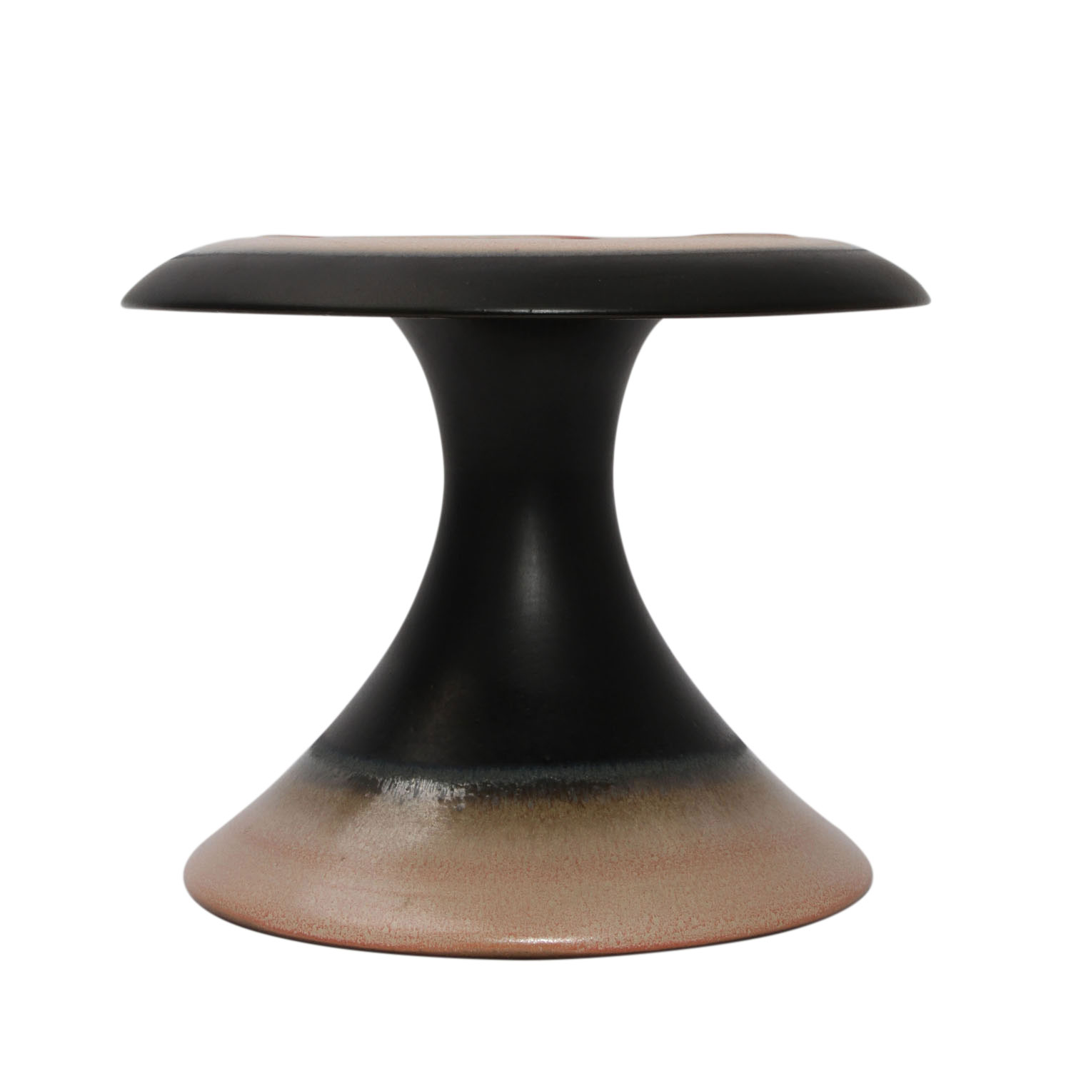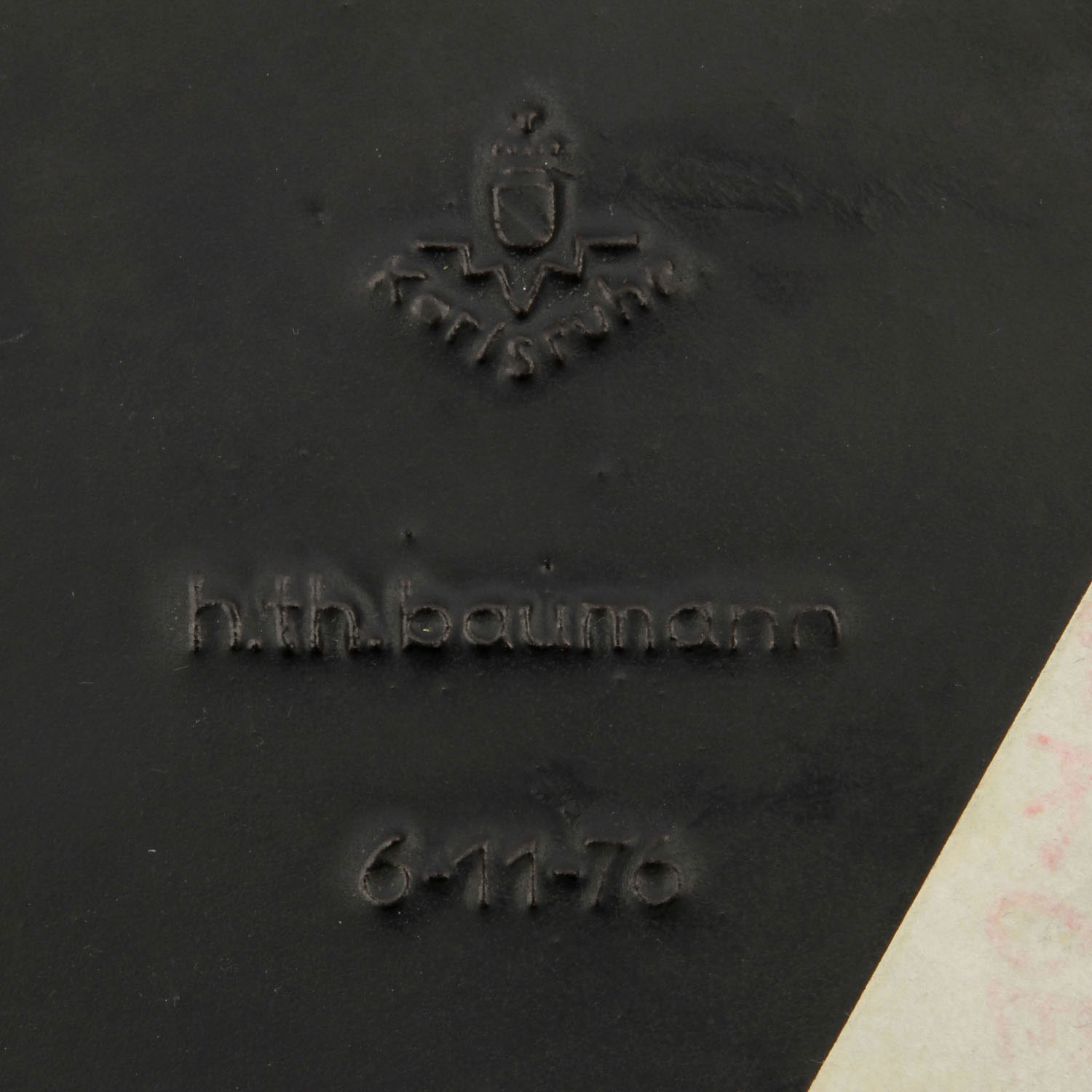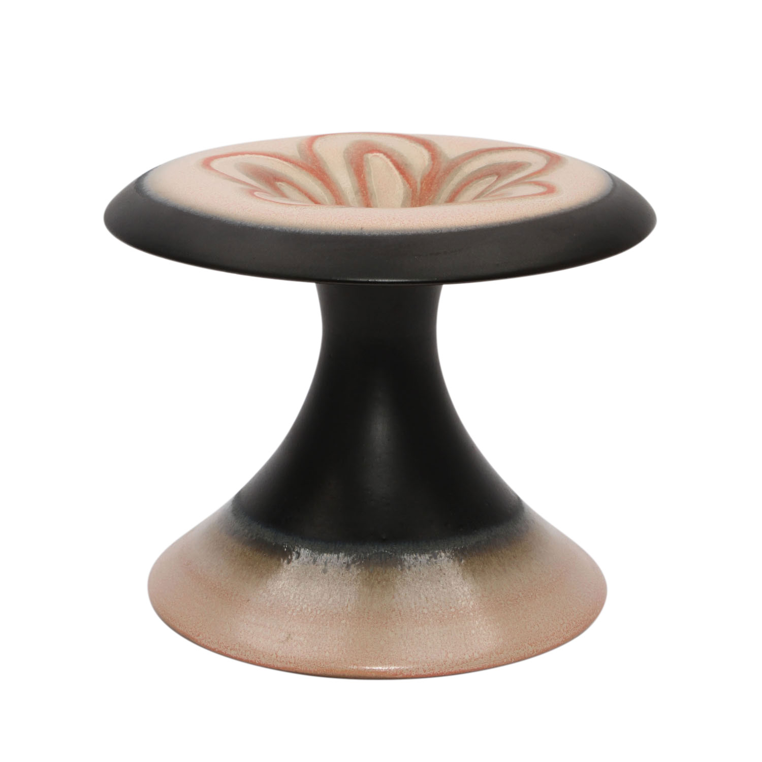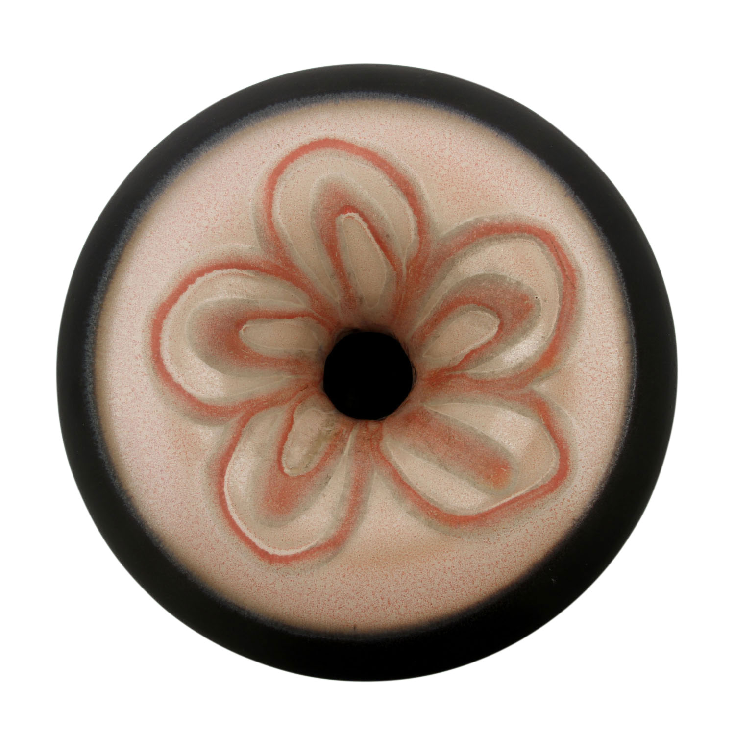 KARLSRUHER MAJOLIKA chandelier, 1970s Design Hans Theo Baumann (b. 1924 in Basel; 1976-82 collaboration with the Majolika manufactory), single-flame candlestick, round base, tapering in the middle, flared spout, predominantly black matt glaze, partial pink speckled glaze, lamp mouth with flat relief of a large flower, cast manufactory mark, designer's inscription "h.th. baumann" and date "6-11-76", signs of use, h 18.5 cm.