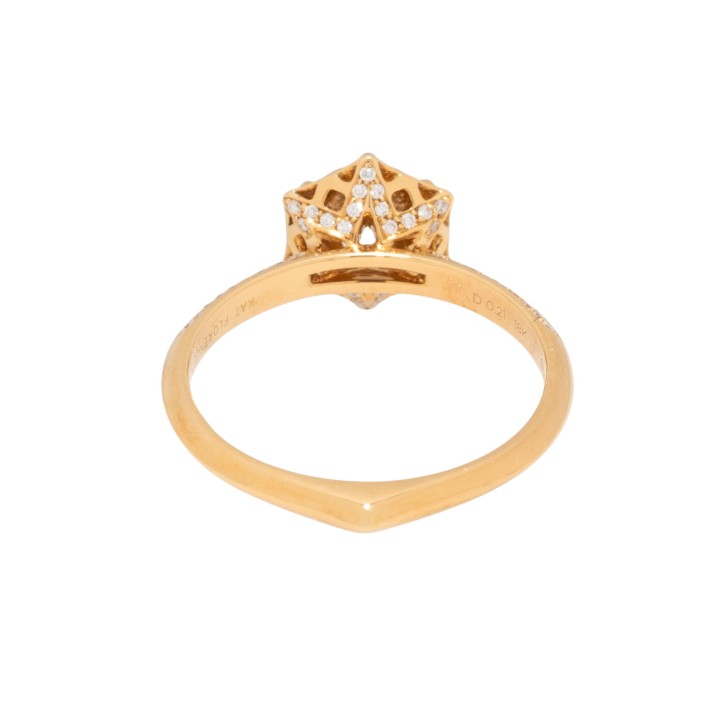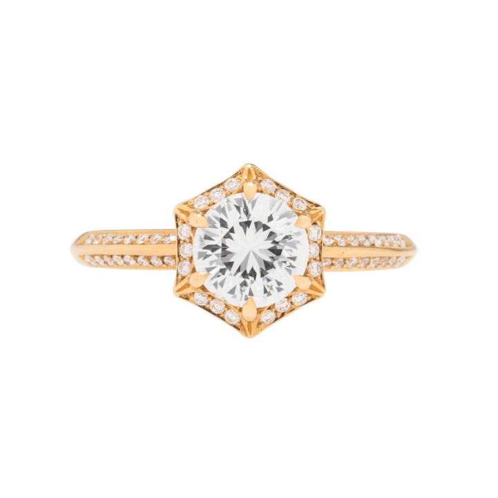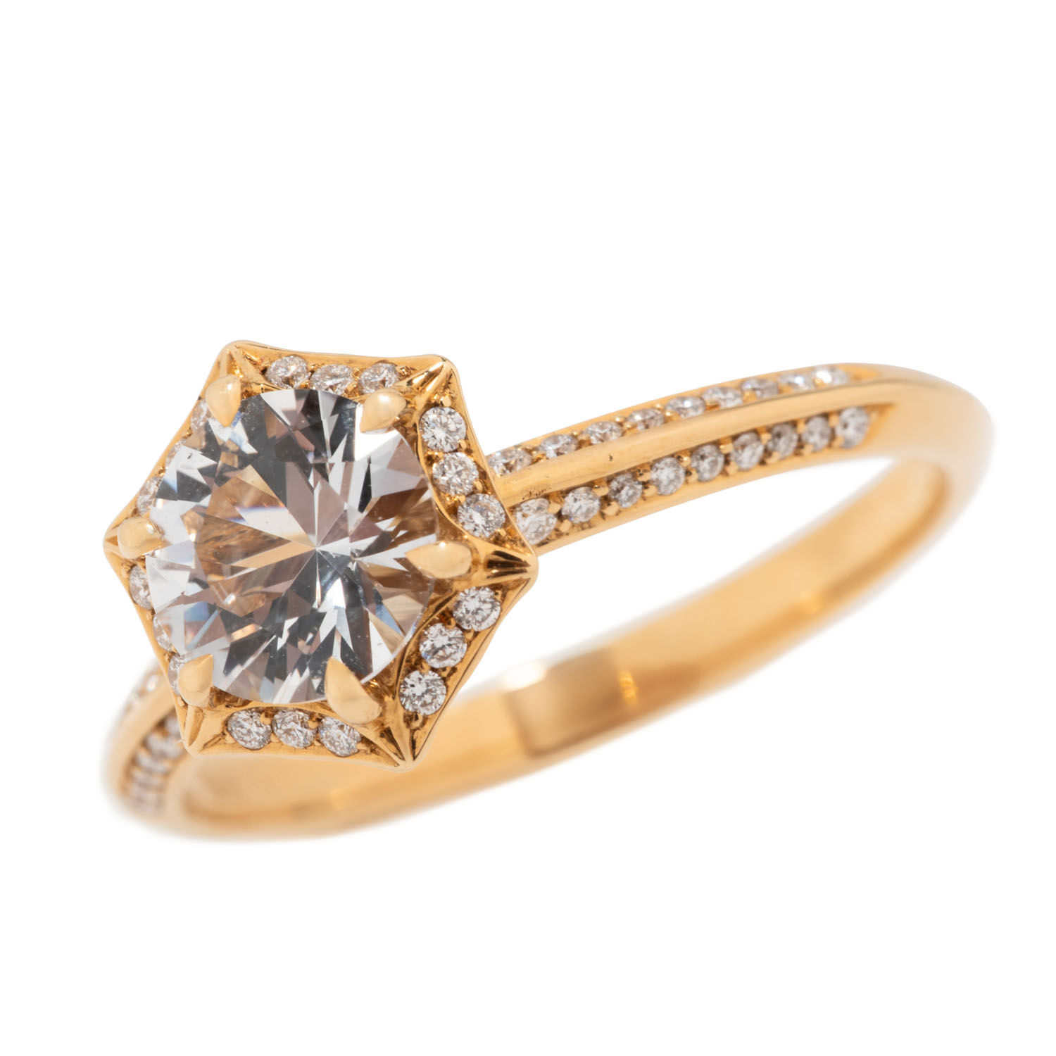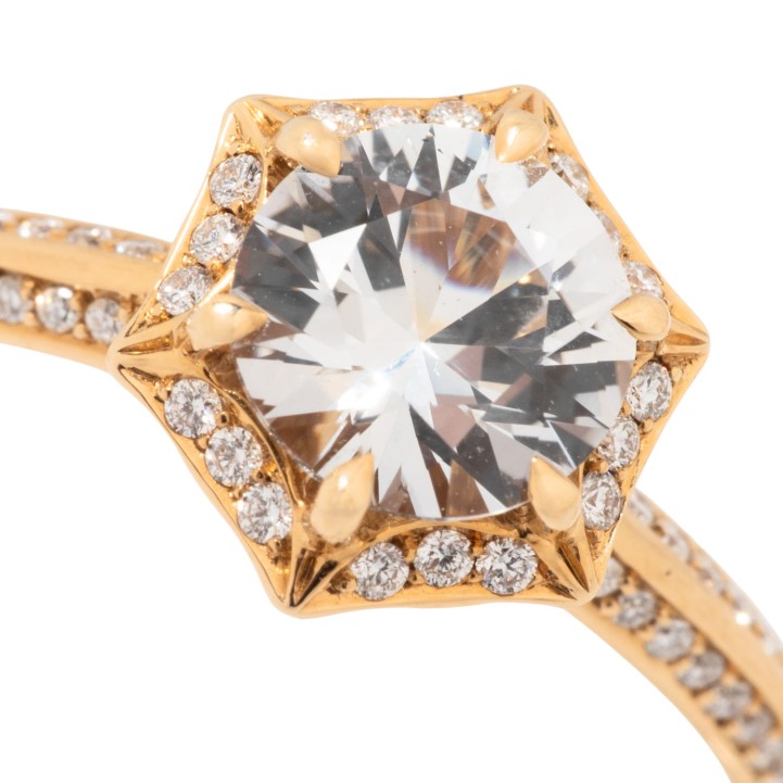 KAT FLORENCE ring with white Ceylon sapphire of ca. 1.1 ct and small brilliant-cut diamonds totalling ca. 0.21 ct, replacement value ca. 17,000 €, 18K YG, 3.3 g, ring size 55, 21st century, mint condition. Incl. case, certificate and valuation.