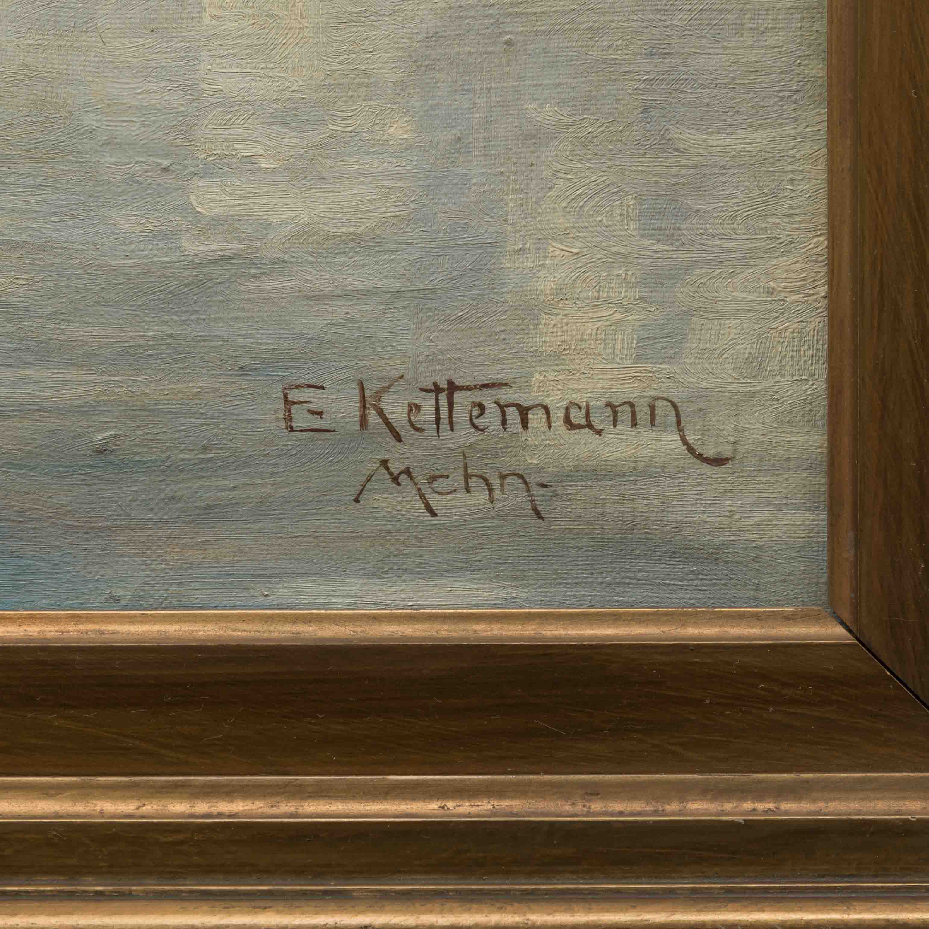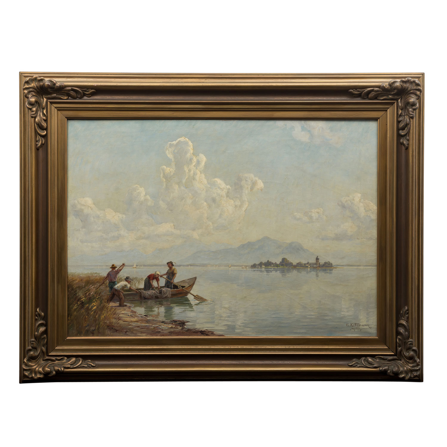 KETTEMANN, ERWIN (1897-1971), 'Fisherman on the shores of Lake Chiemsee', overlooking the Fraueninsel, signed and inscribed 'Mchn.', oil / canvas, HxW: approx. 70x100 cm (100x128 cm with frame). Minim. Craquelé, restored with a small back canvas dowel patch, light varnish gilb. With frame (slightly damaged, glued).