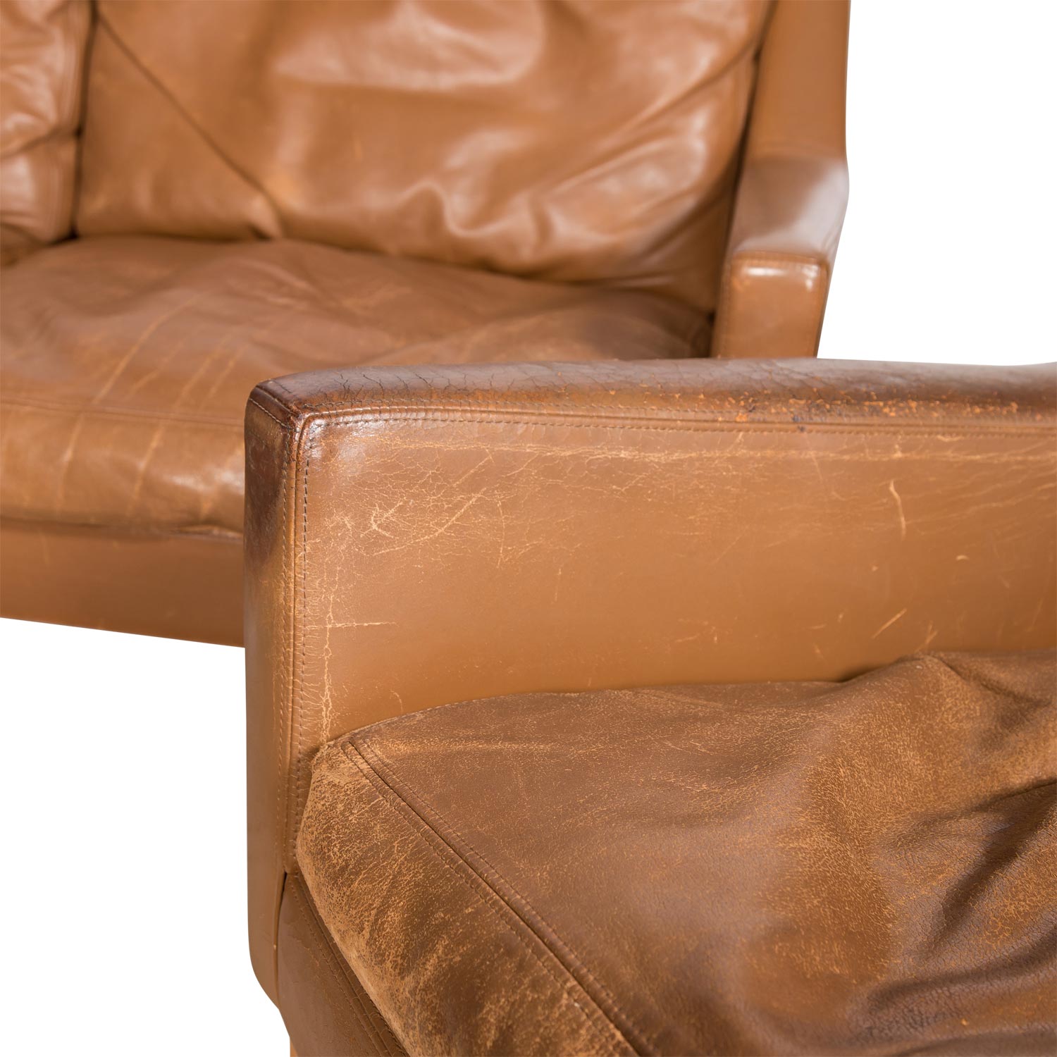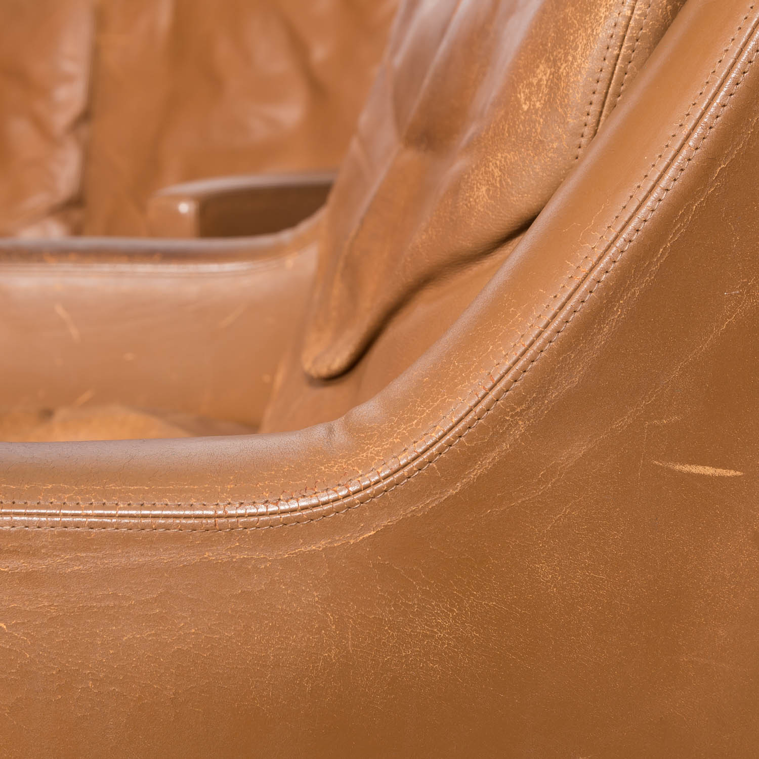 60s. Years, wooden frame construction, upholstered in cognac brown leather, cushions partly with down filling, group consisting of: Sofa 3 seater, Sofa 2 seater, 2 armchair and ottoman, traces of age.