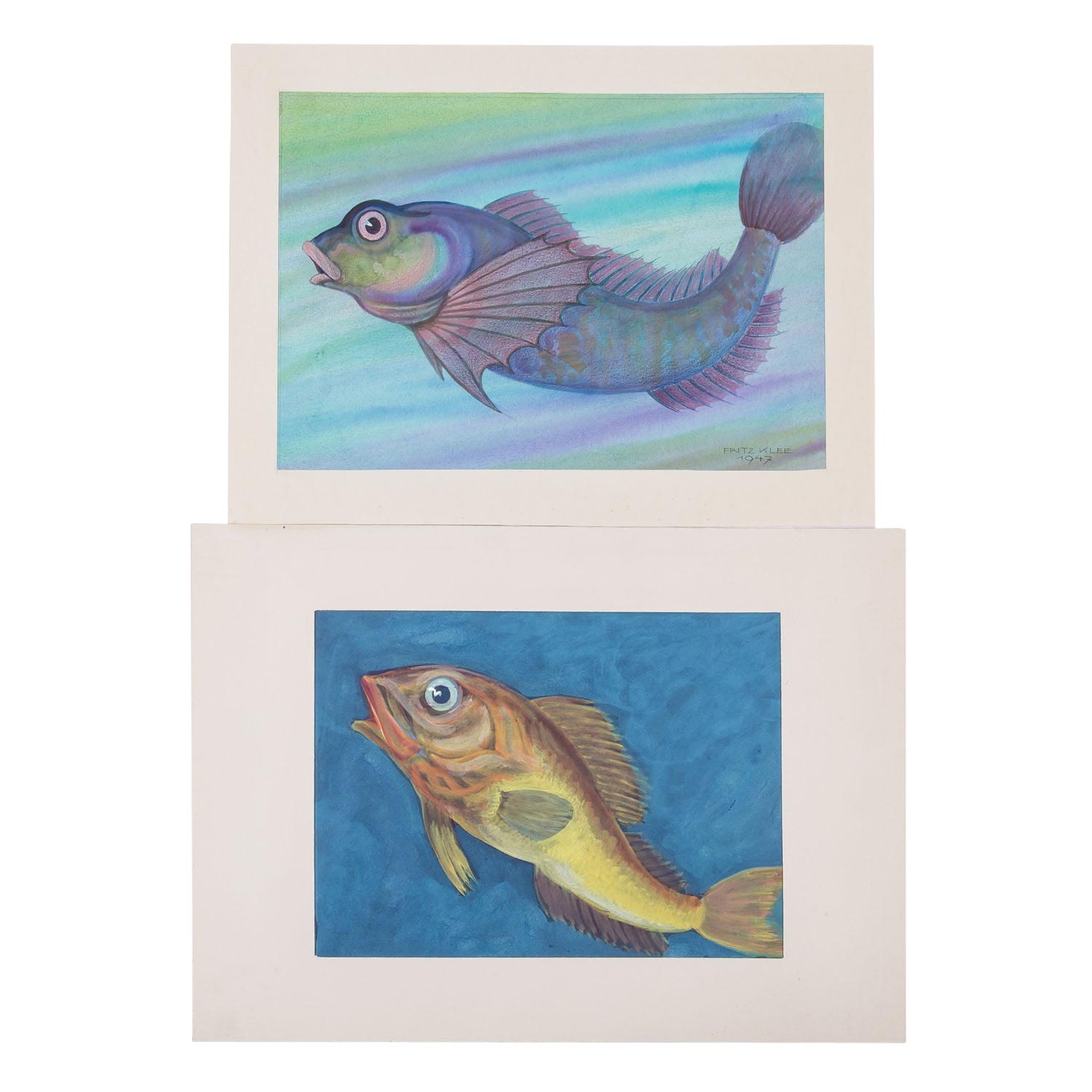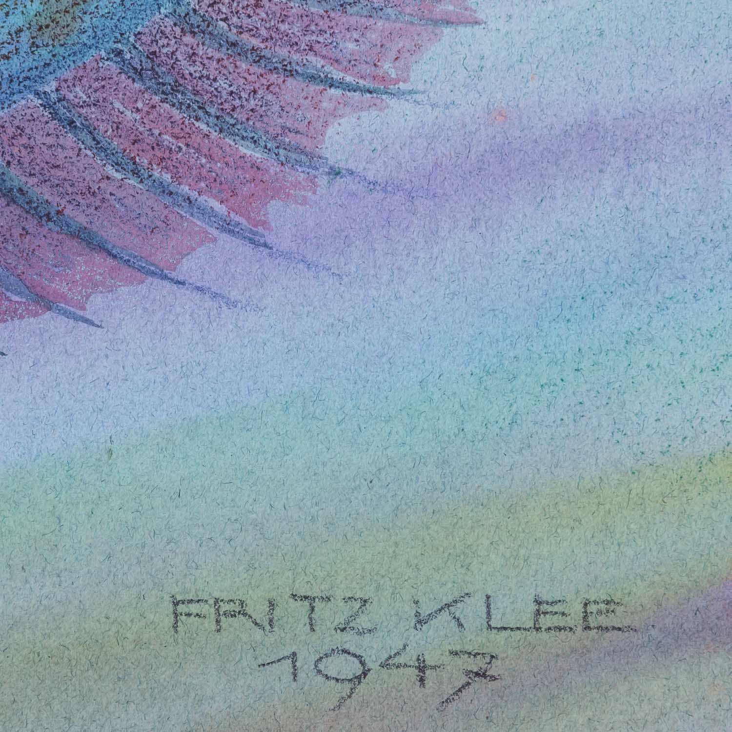 KLEE, FRITZ (1876 - 1976), group of 3 figurative colour drawings, mid-20th century, some signed or monogrammed: 'FRITZ KLEE / FK', some dated (1947). Pencils and opaque colours on various papers, each mounted behind passepartout or on support. HxW sheet: max. approx. 27.2 x 37 cm (HxW passepartout/support: max. approx. 32 x 44 cm). Signs of age and rubbing, some slight signs of storage. Without frame.