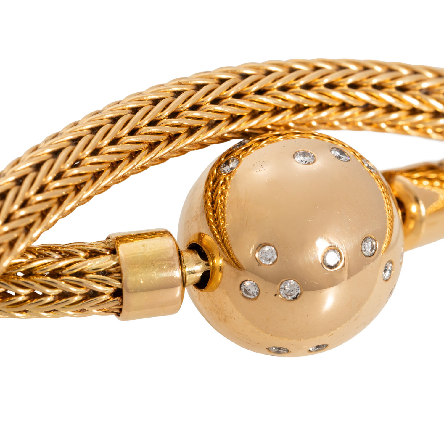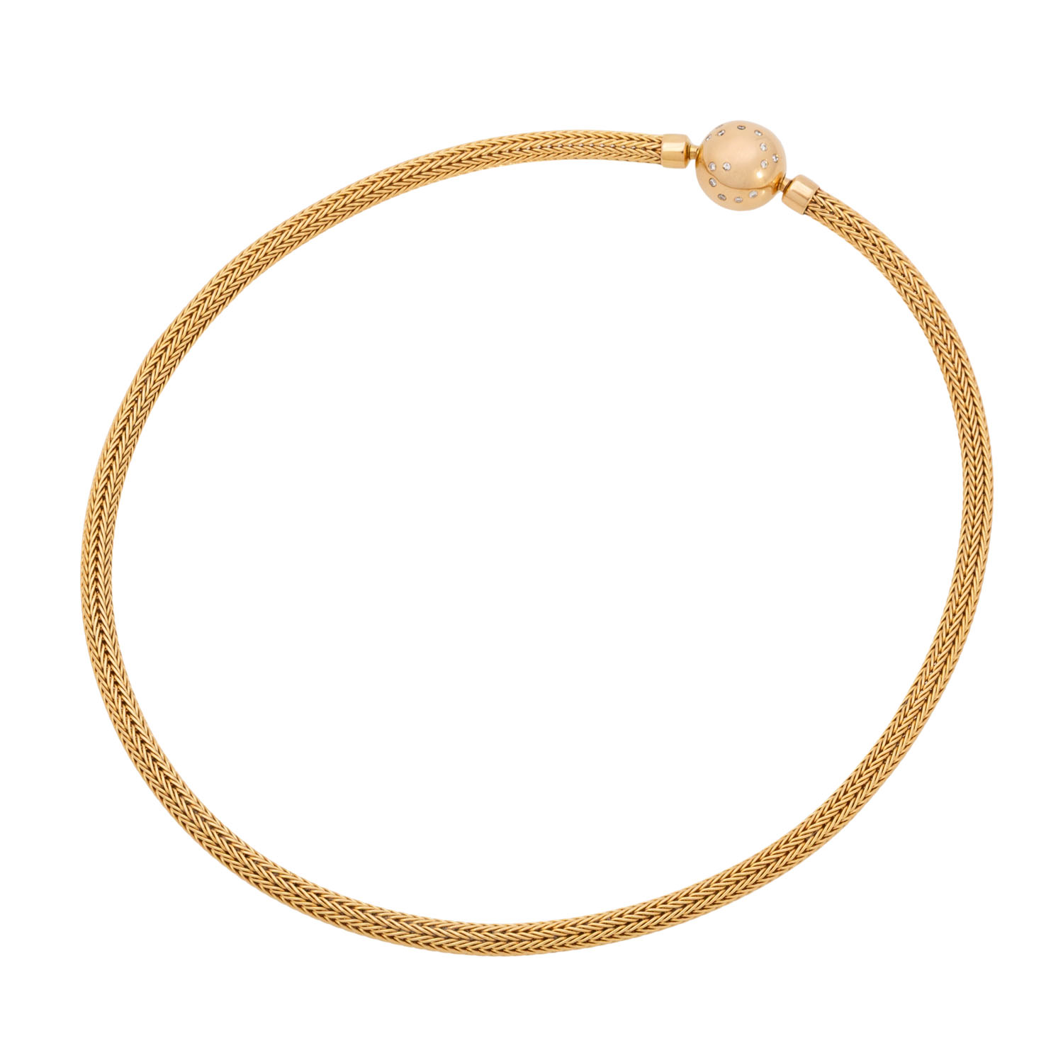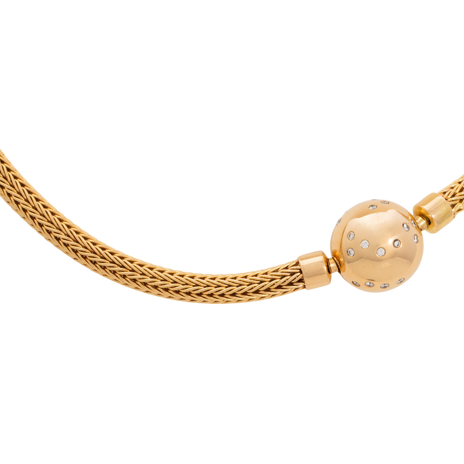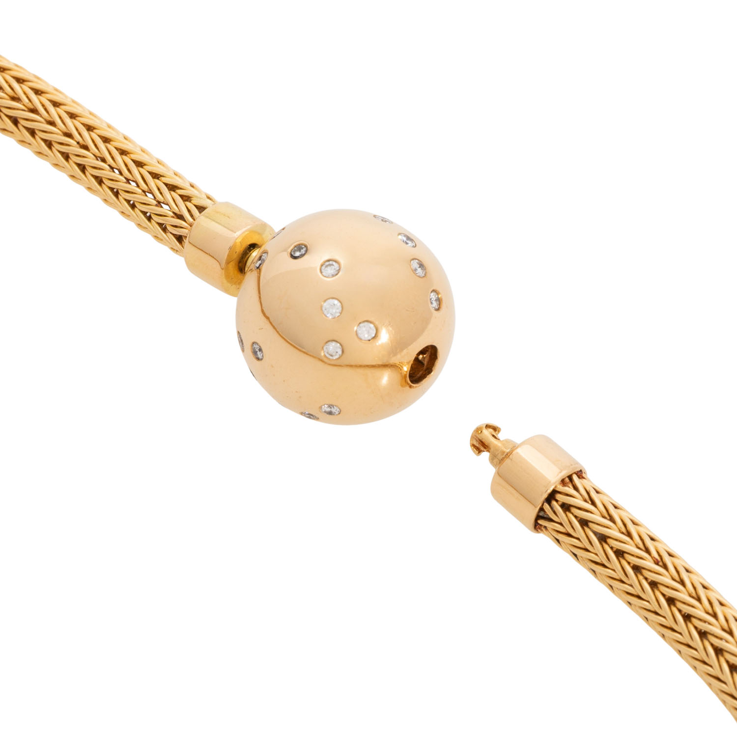 Mesh necklace and ball-bayonet-clasp with 32 brilliant-cut diamonds totalling approx. 0.64 ct, RW-WHITE (G-H)/VS, 18K yellow gold, 50 g, mesh necklace L: approx. 42 cm, W: approx. 0.5 cm, ball: D: approx. 1.4 cm, 20th/21st century, signs of wear, nacklace with dent.