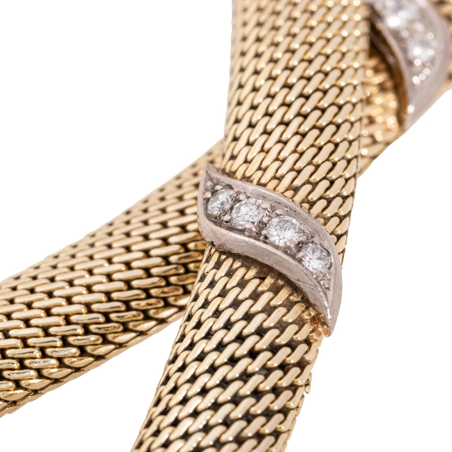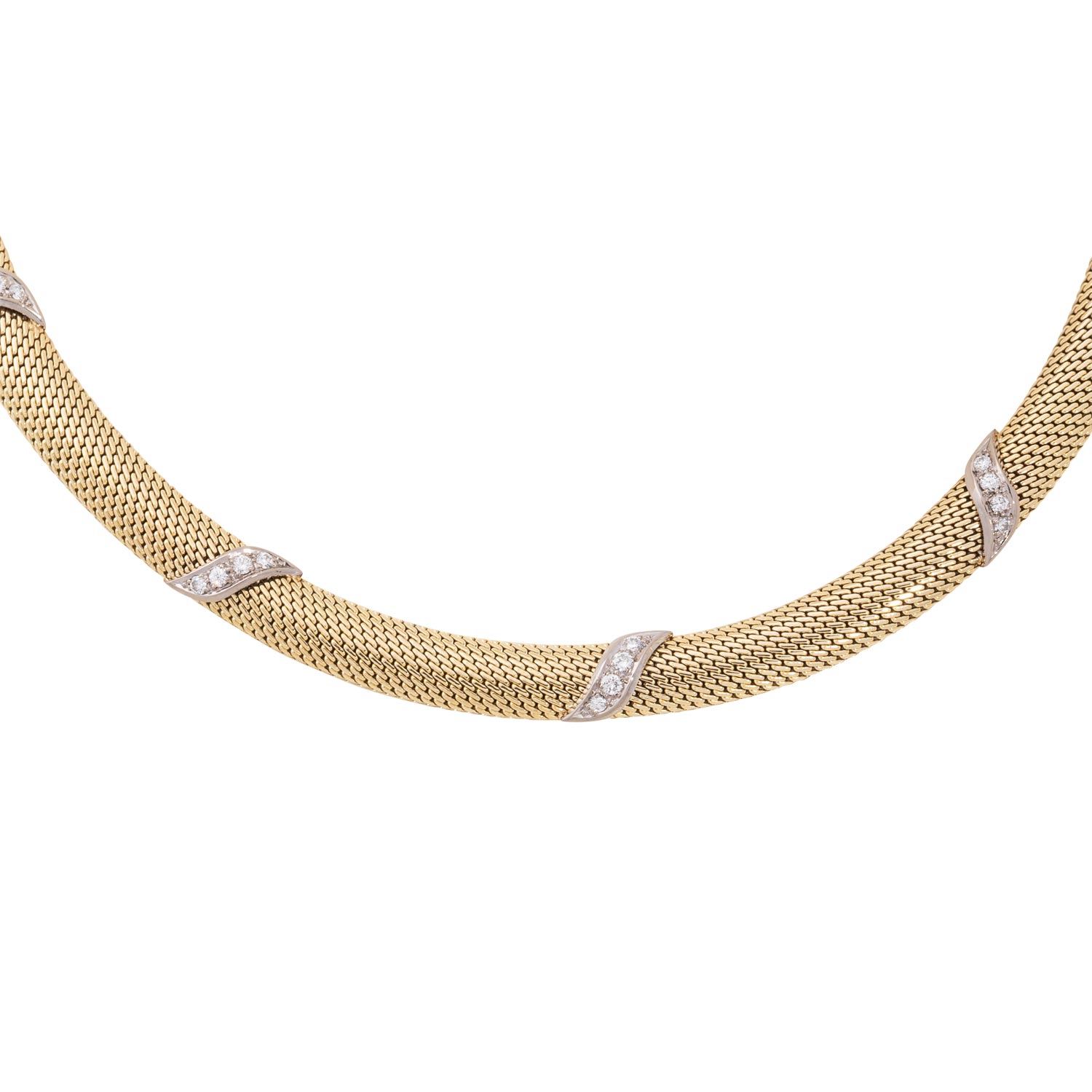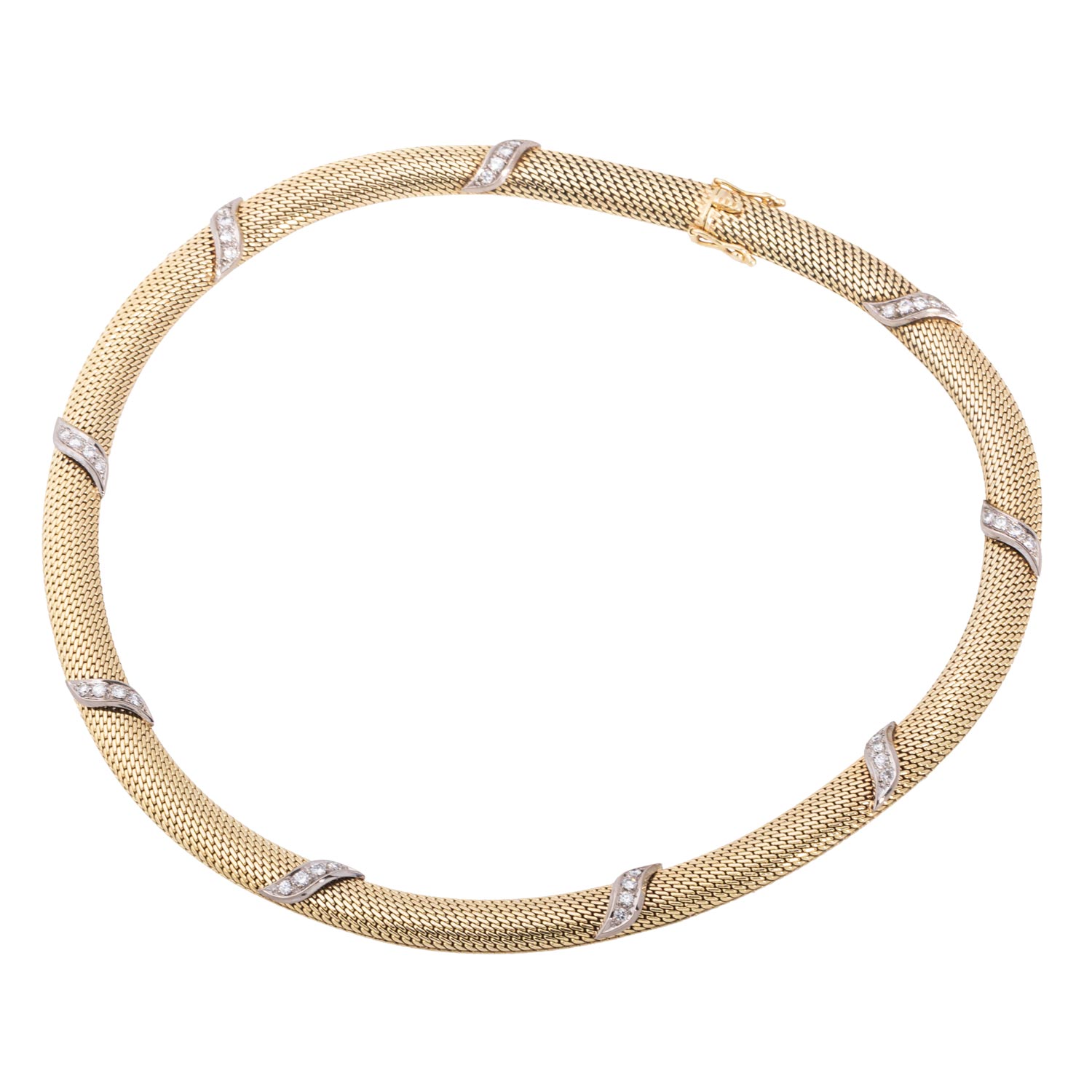 Mesh necklace with 36 brilliant-cut diamonds totalling ca. 0.90 ct, WHITE-STW (H-J)/SI-P, yellow and white gold 14K, 67.8 g, L: ca. 39 cm, W: ca. 0.7 cm, 2nd half of the 20th century, minor signs of wear.
