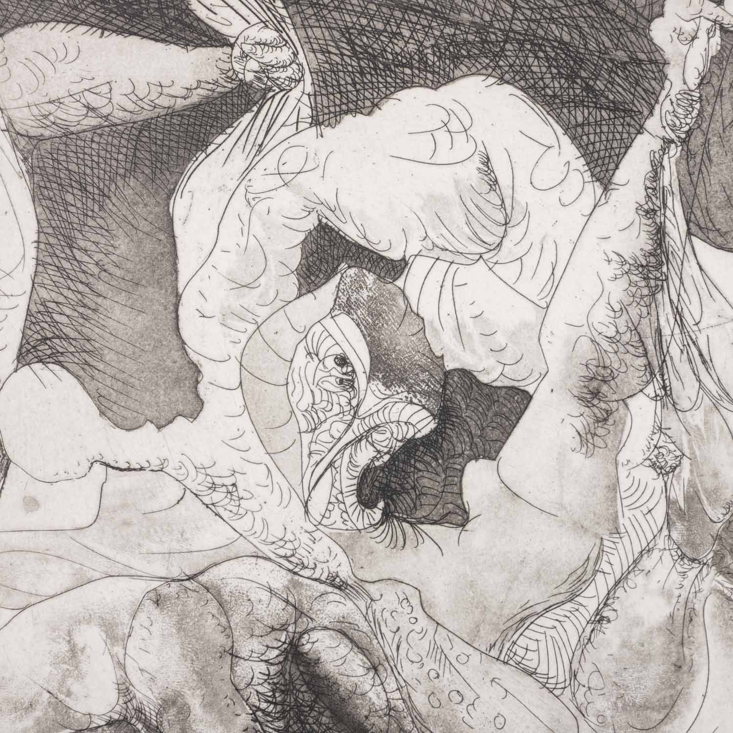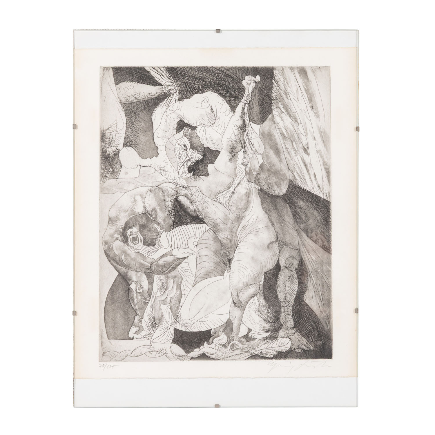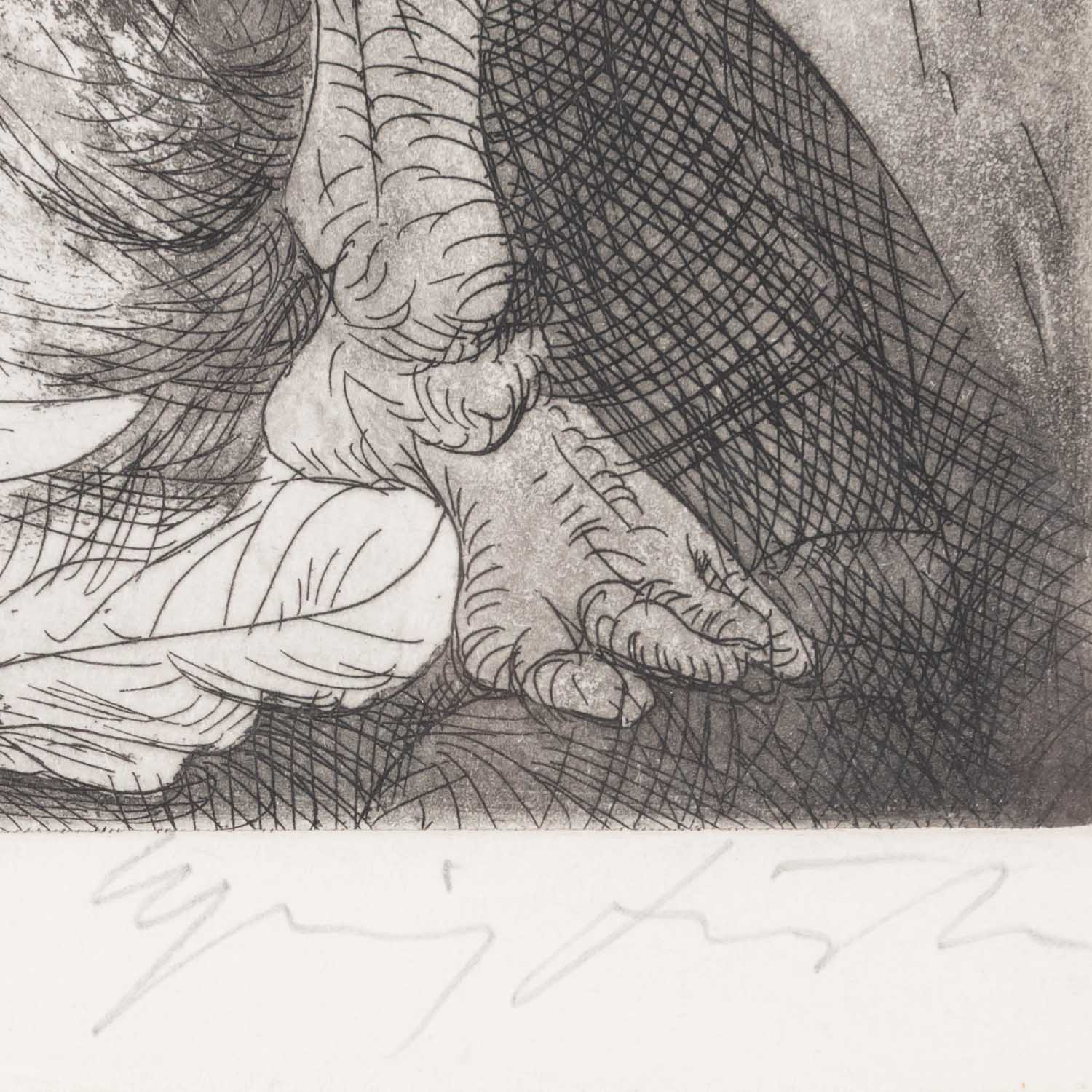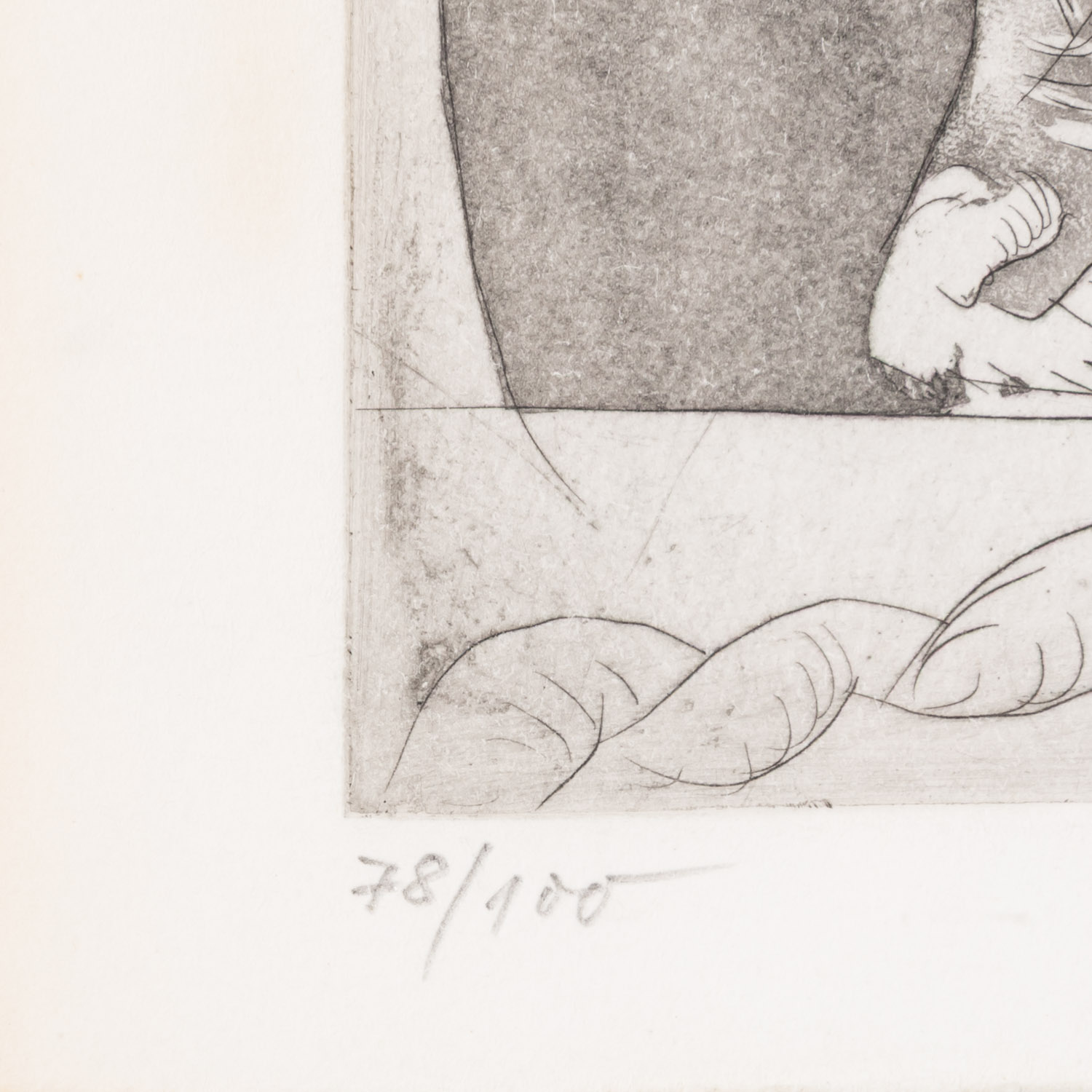 KNOKE, HEINZ (1922 - 1991), figurative composition, etching/paper, signed in pencil by hand lower right, numbered ‘78/100’ in pencil by hand lower left, HxW: plate approx. 31x24.5 cm, sheet approx. 35x30 cm, outer frame dimensions approx. 40x30 cm. Signs of age and wear, browned, discolouration to margins. Framed behind glass (traces of age and wear).
