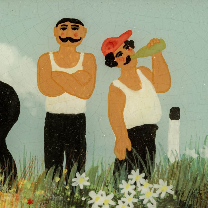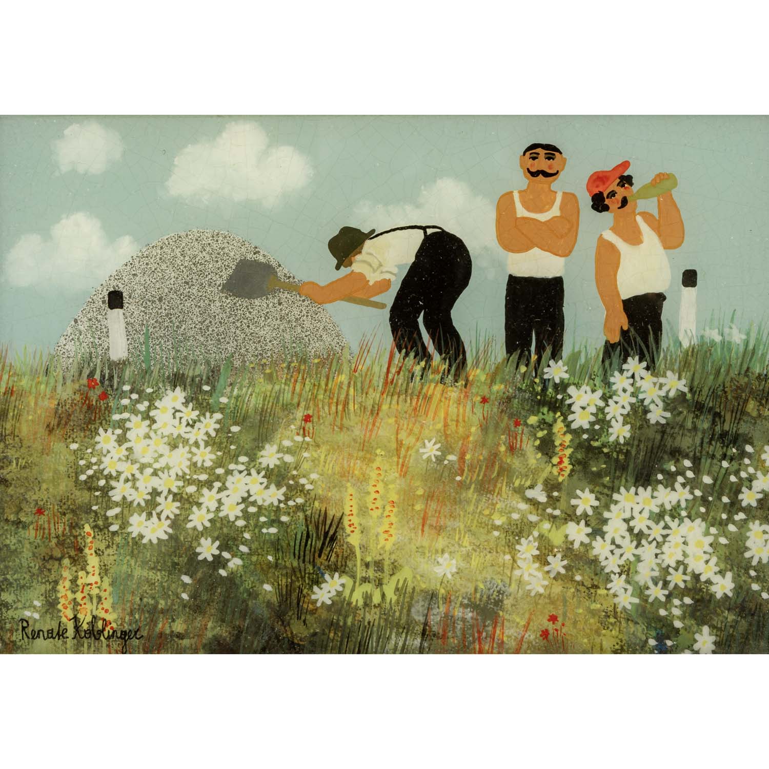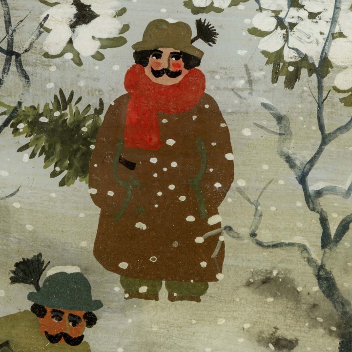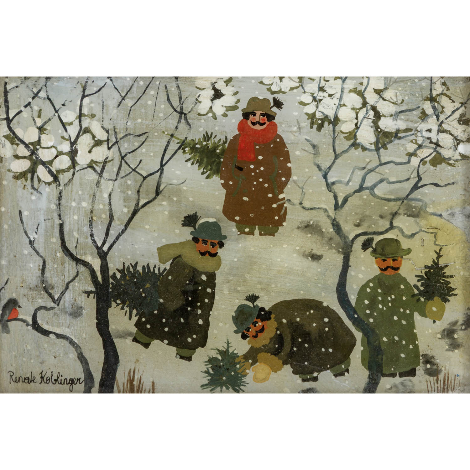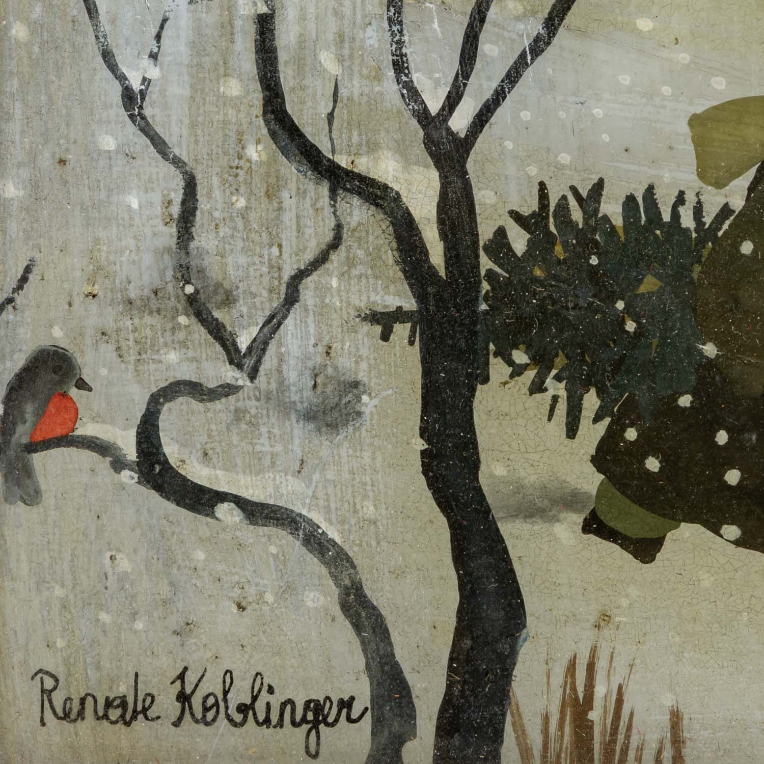 KOBLINGER, RENATE (1943), pair of reverse glass paintings ‘Summer’ & ‘Winter’, two seasons in naïve painting, each signed lower left, HxW: approx. 15x21 cm (21x27 cm with frame). Signs of age. Each with frame.