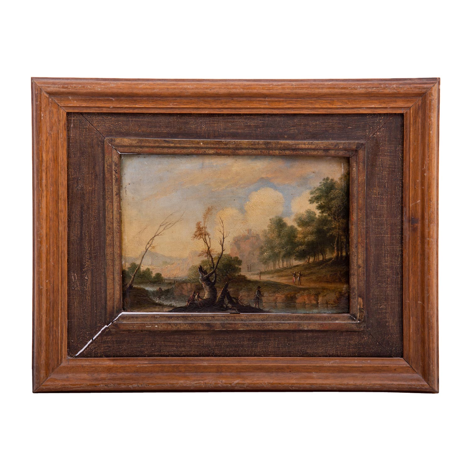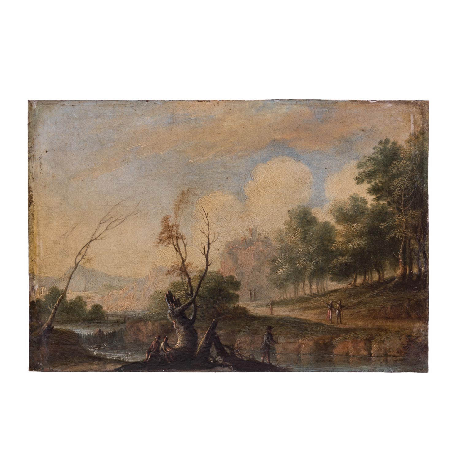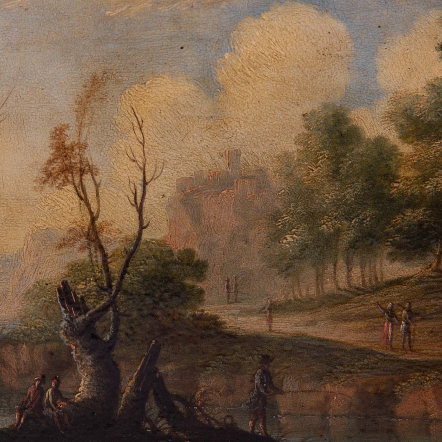 KONINCK, Jakob I, ATTRIBUIERT (around 1614-1708), 'River landscape hunters and anglers', fading hill and castle on rocks, unsigned, oil/copper, HXB: approx. 14.5x21.3 cm. Signs of age and rubbing, old restored and retouched. Enclosed photo with the attribution by Prof. Dr. H. Zimmermann, Berlin 1963. Frame loose attached (part. complemented, outer dimensions approx. 28x36 cm).