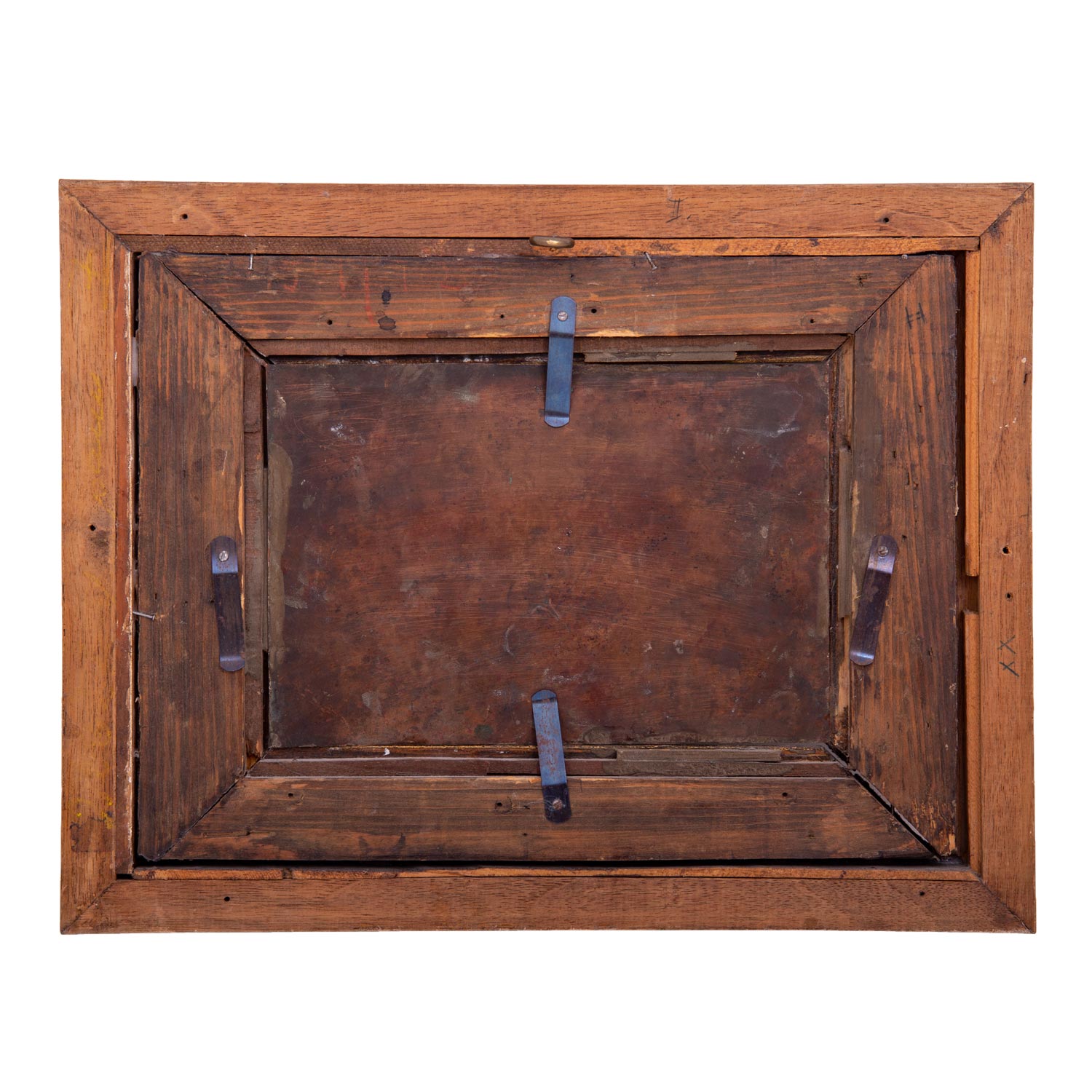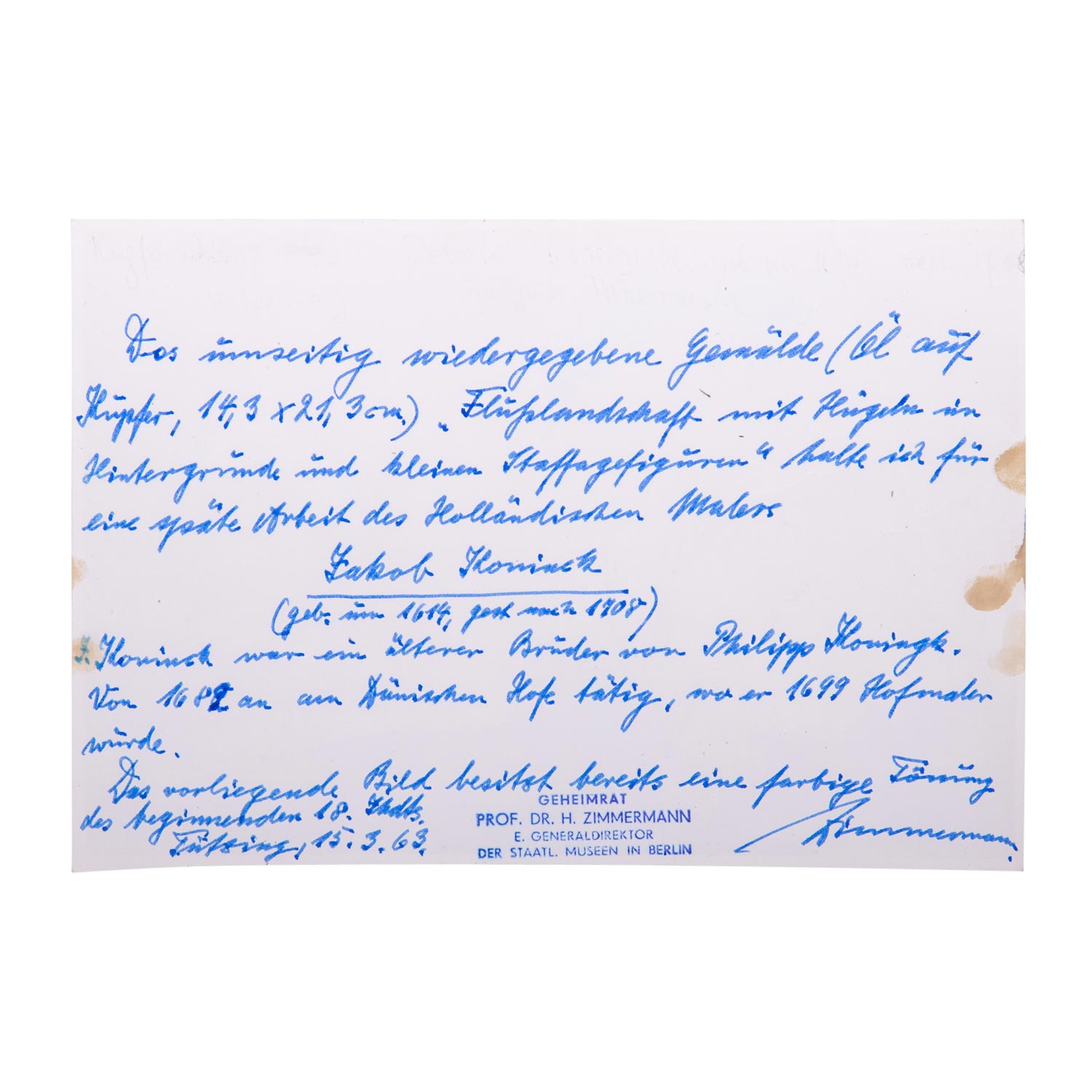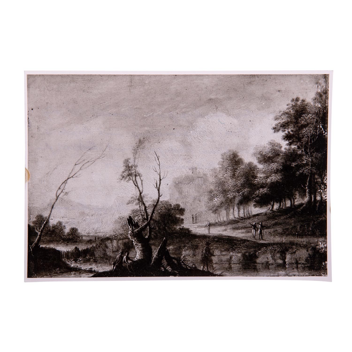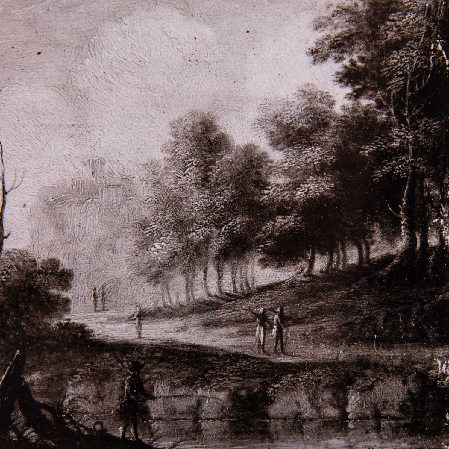 KONINCK, Jakob I, ATTRIBUIERT (around 1614-1708), 'River landscape hunters and anglers', fading hill and castle on rocks, unsigned, oil/copper, HXB: approx. 14.5x21.3 cm. Signs of age and rubbing, old restored and retouched. Enclosed photo with the attribution by Prof. Dr. H. Zimmermann, Berlin 1963. Frame loose attached (part. complemented, outer dimensions approx. 28x36 cm).