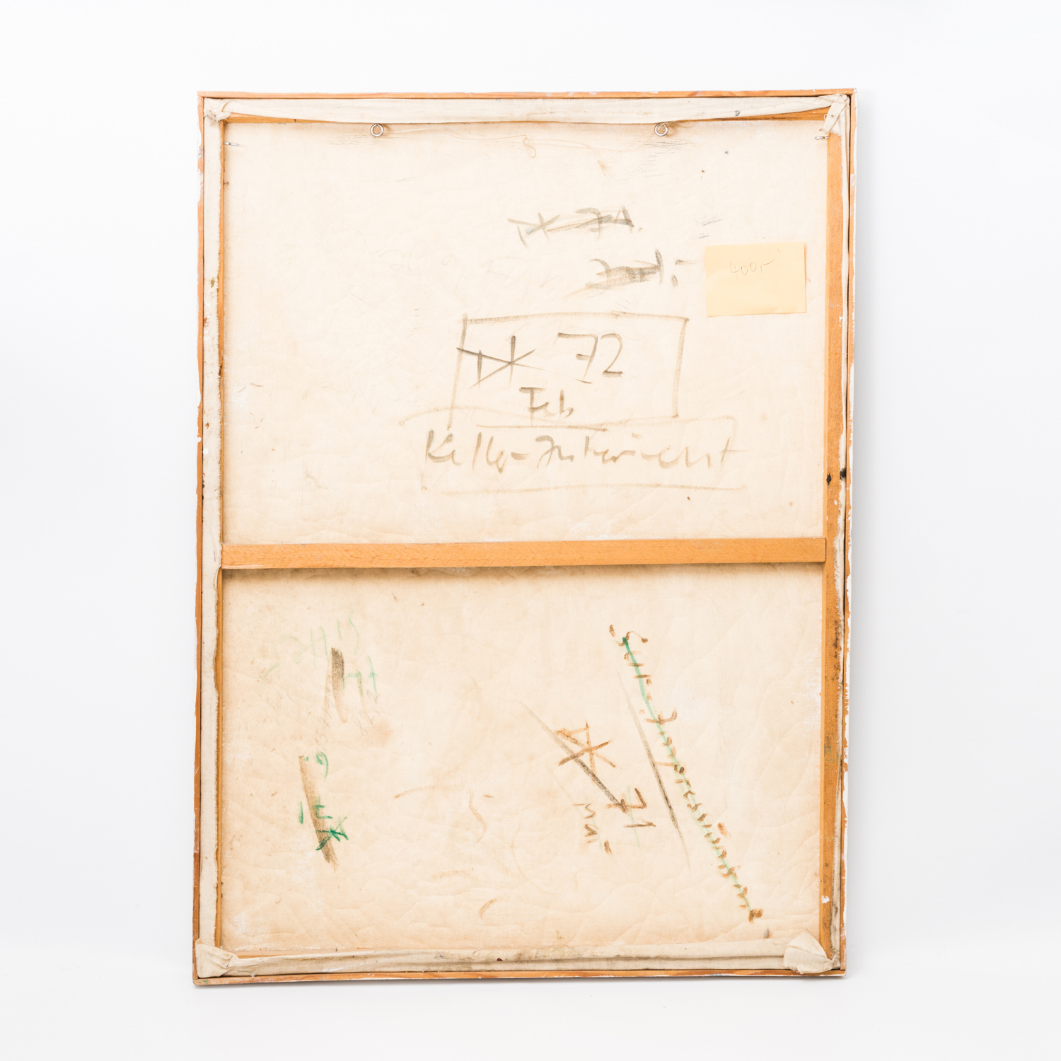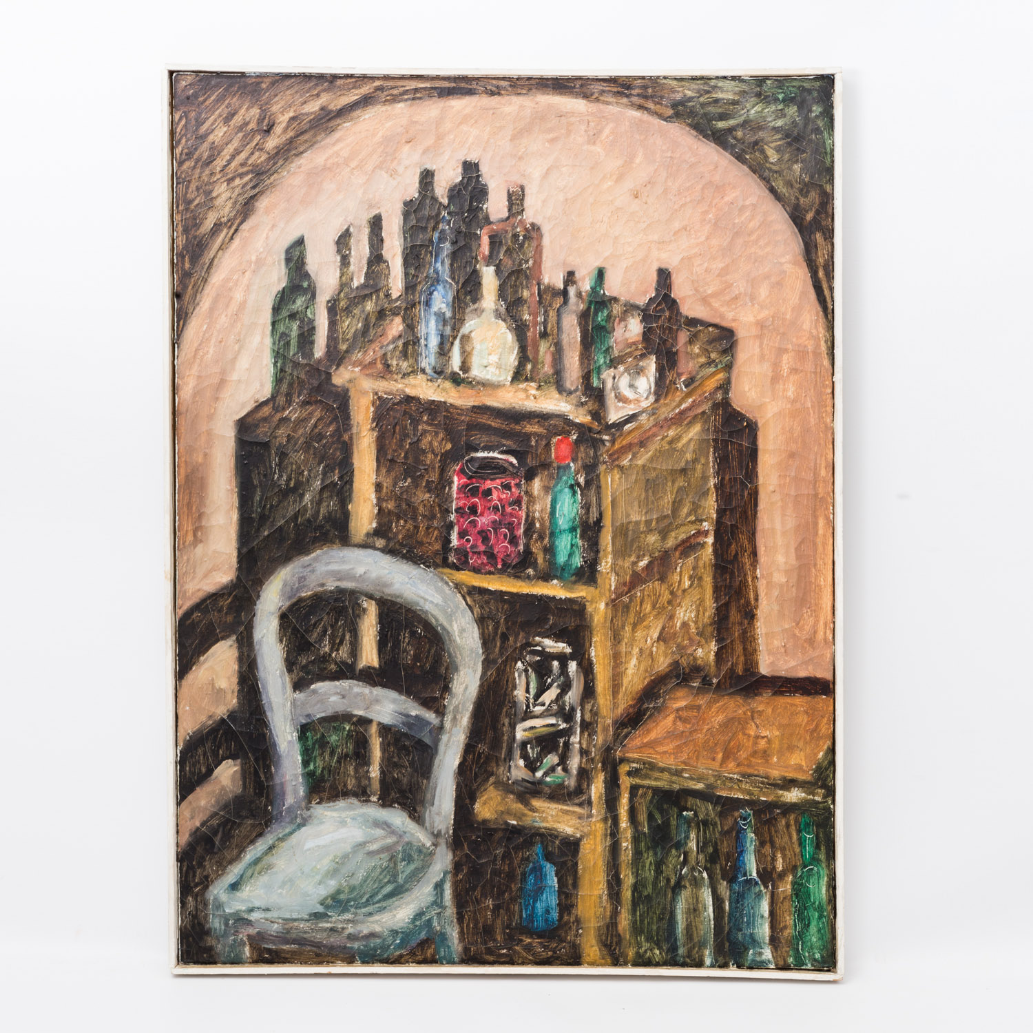 KONZELMANN, DIETER (1938-2015, artist in Marbach), 'Interieur', view into a wine cellar with a shelf with bottles and glasses, verso monogr., dat. (19)72 a. titled, oil on canvas, ca. 92,5x68,5 cm (95x69,5 cm with frame). Craquelure a. min. loss of colour. With frame. Traces of age.