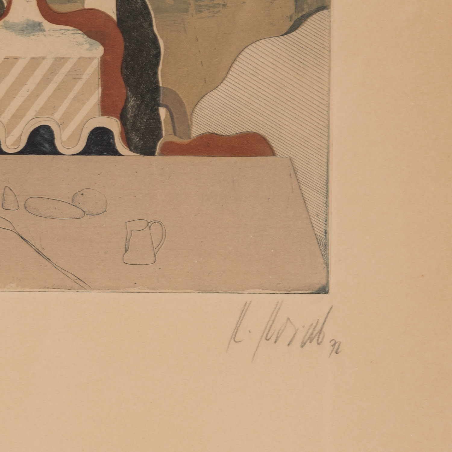 KORAB, KARL (1937), Pair of abstract compositions, 1972, each colour aquatint etching/paper, each signed and dated in pencil by hand, HxW: plate approx. 14x16 cm and 16x22 cm, sheet each approx. 48x38 cm, outer frame dimensions each approx. 50x40 cm. Each with traces of age, heavily browned, partially slightly stained. Each with glazed frame.