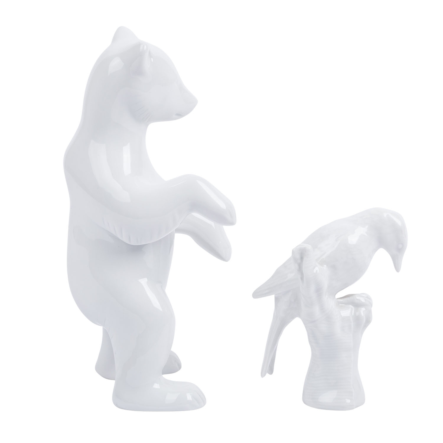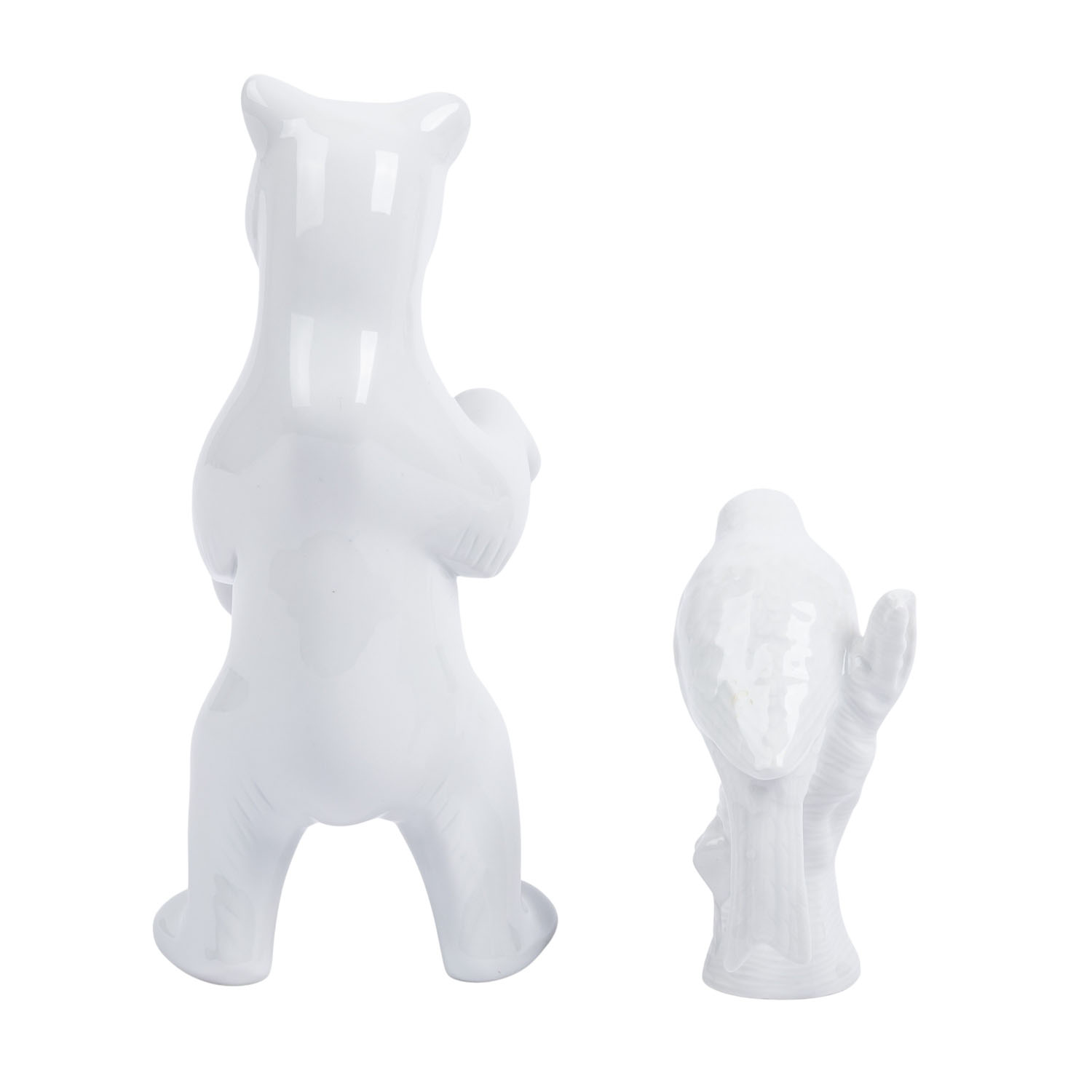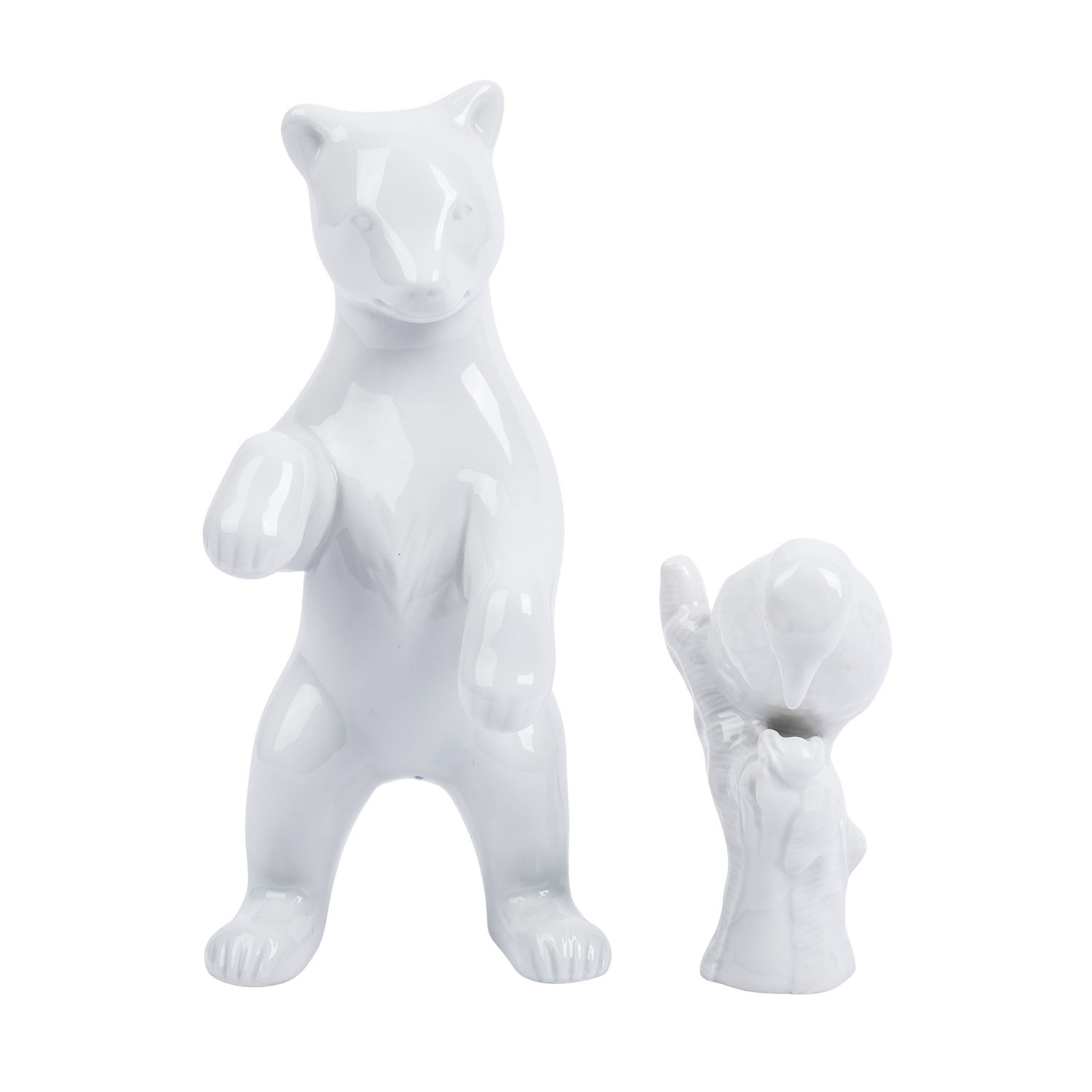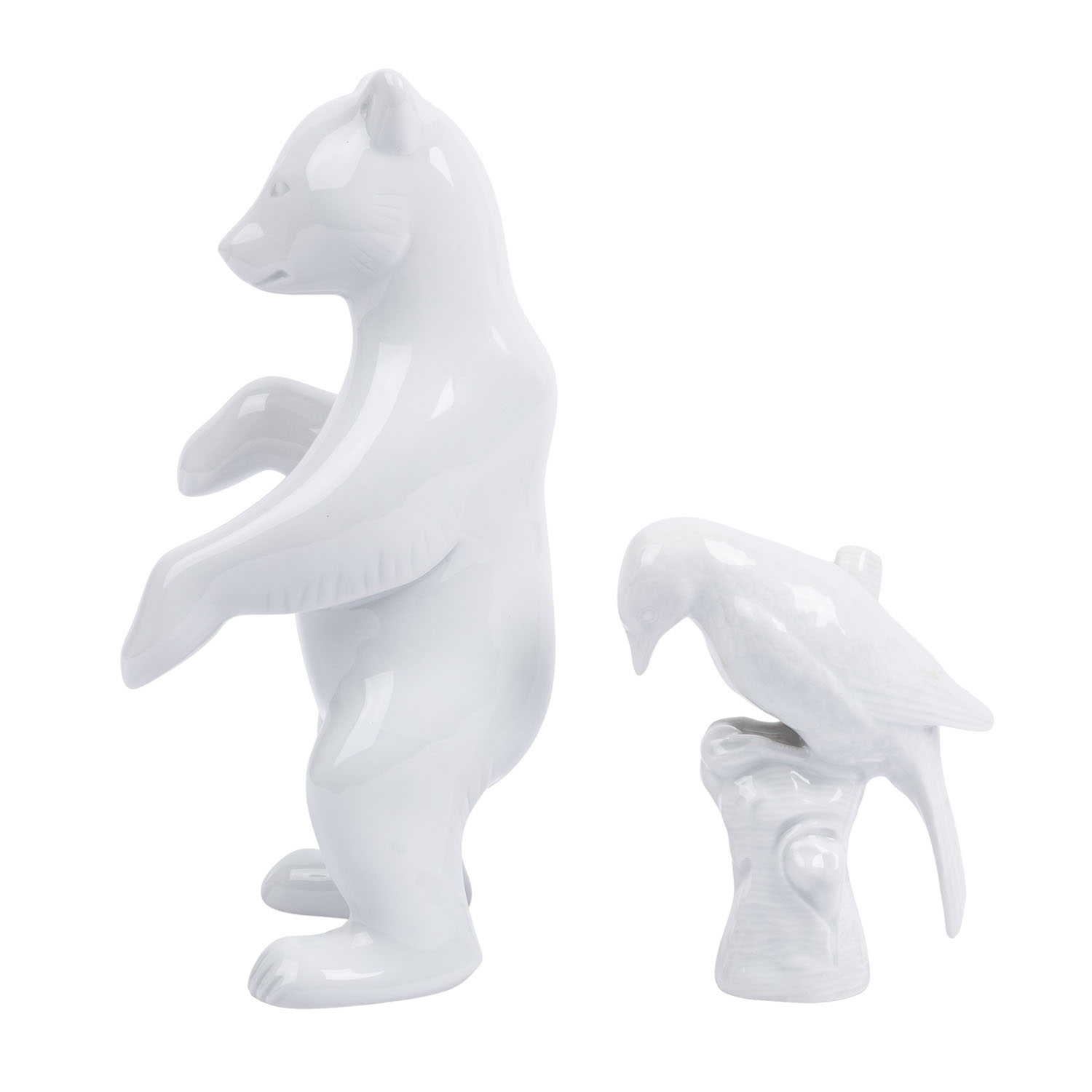 KPM 2 animal figurines, 20th/21st cent. White porcelain, 1 standing bear (h. approx. 19.5 cm) and 1 bird on a tree trunk (h. approx. 10).