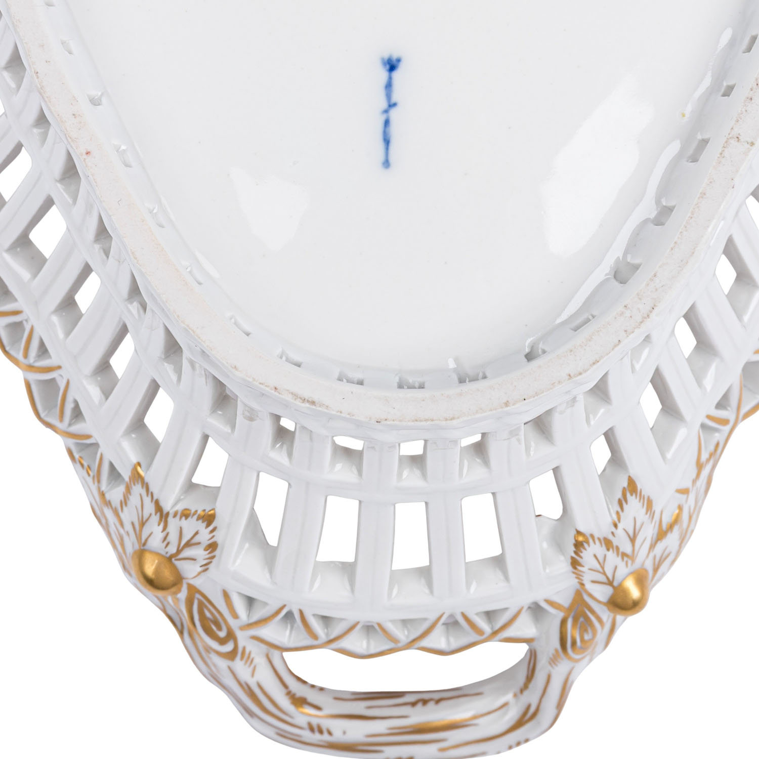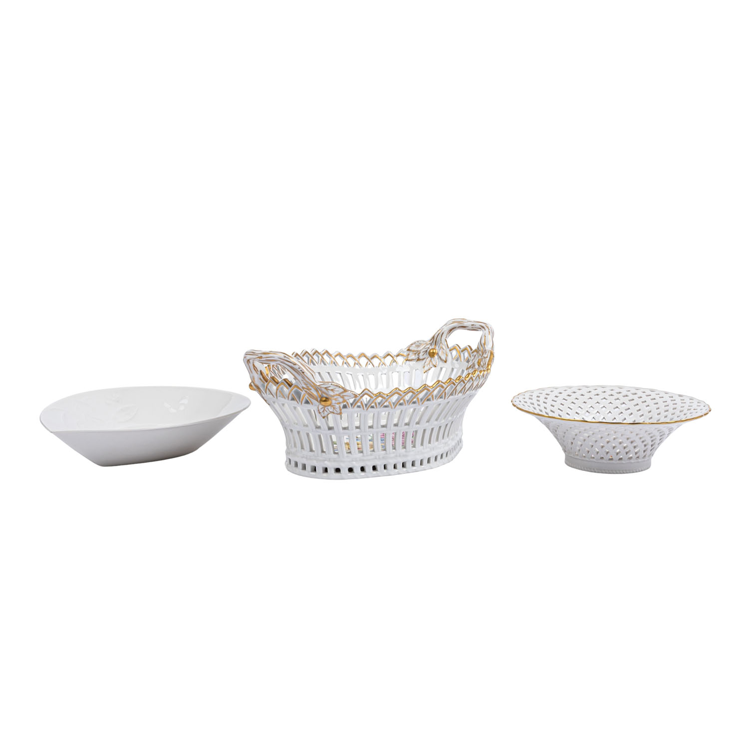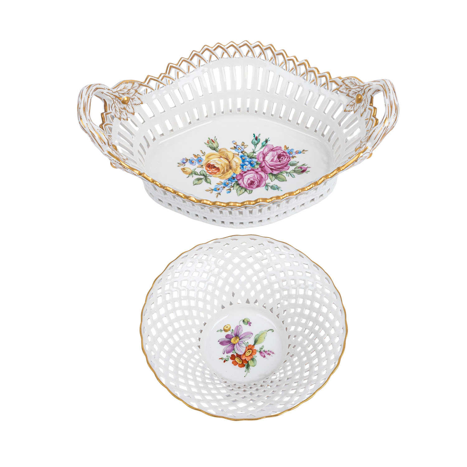 KPM 3 bowls, 20th/21st cent. 1 openwork bowl “English basket” (l. approx. 24 cm, 1 handle with small flaw), 1 openwork bowl (d. approx. 14), both with flower paintings and gold decoration, 1 bowl in leaf form, smooth with vegetal relief decoration (2nd choice, l. approx. 19). Slight signs of age and use.