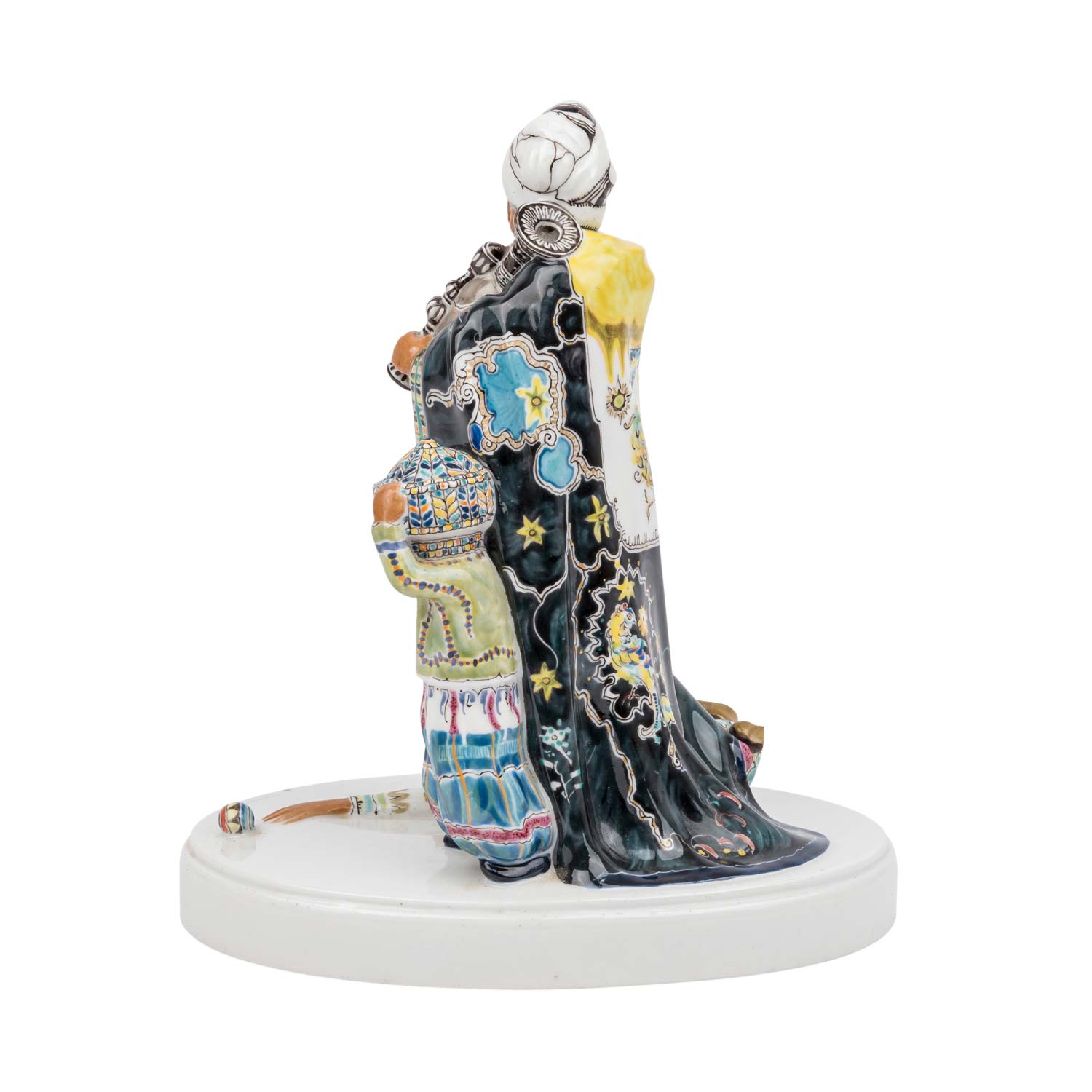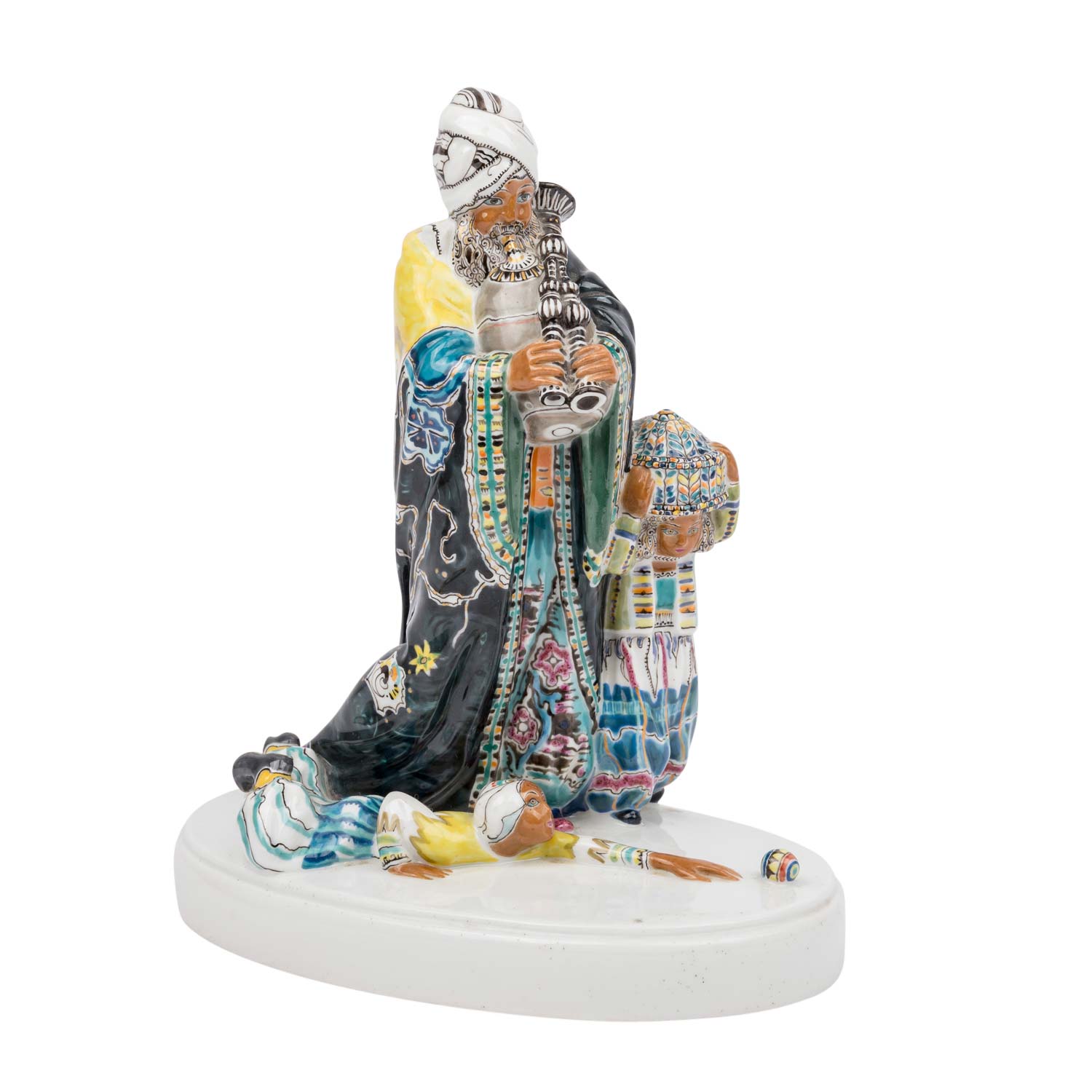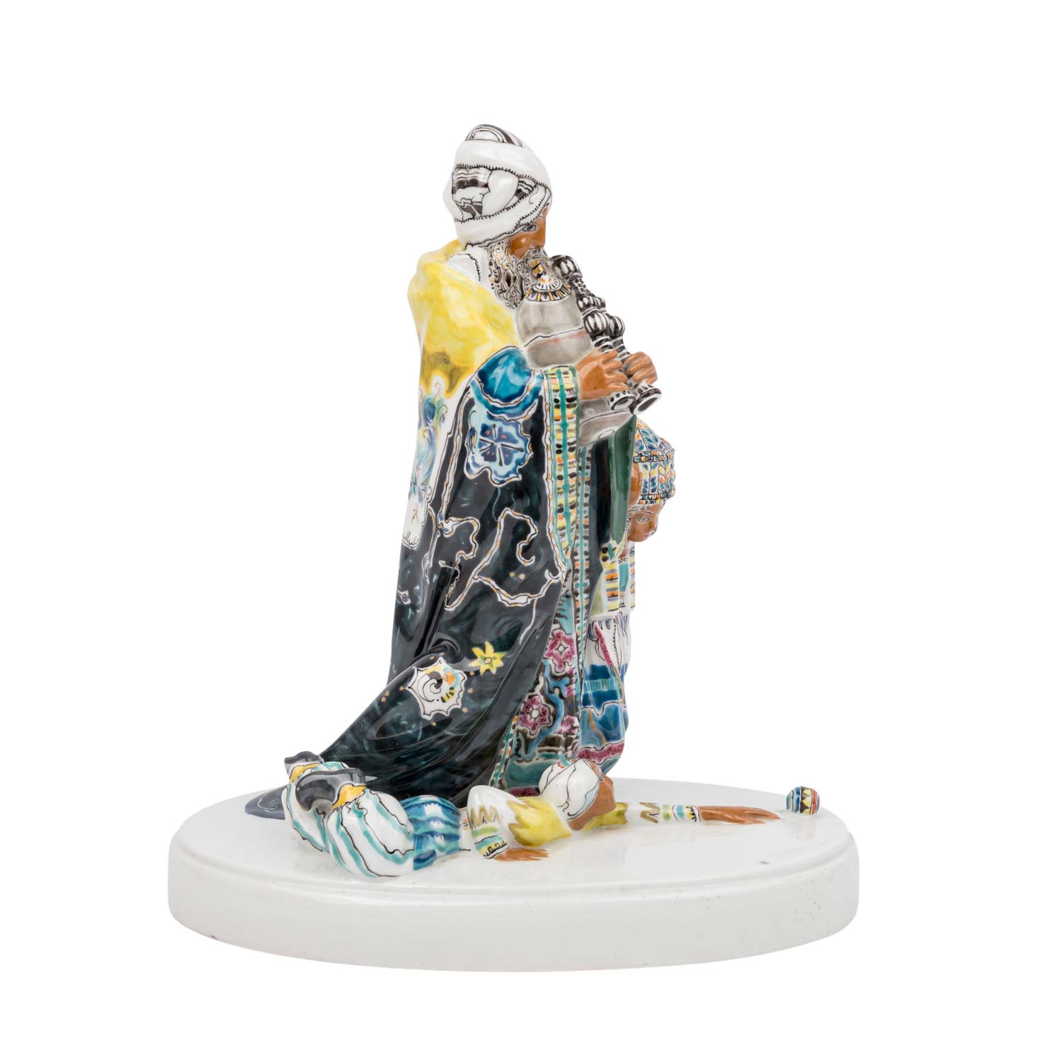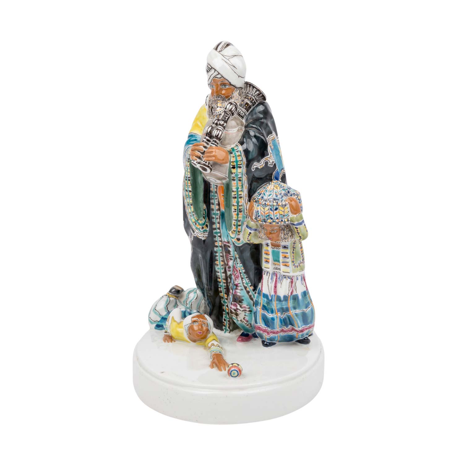 KPM Berlin figure group 'bagpiper', 1910s, Depiction of a bagpipe player on an oval plinth, surrounded by two playing children, white porcelain with colorful staffage. From the centerpiece 'Indian Pageant', designed by Carl Reschke 1912/13, decorative design by Gertrud Kant, model no. 10583, on the base inscribed 'Reschke 191?' (cannot be deciphered), scepter mark and red imperial orb mark on the underside, foot of the lying figure, broken and attached loosely, signs of age, H 22 cm.