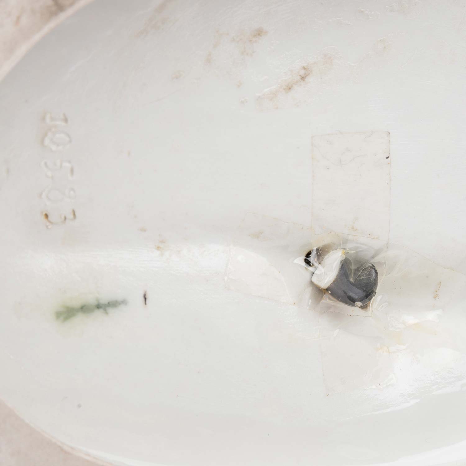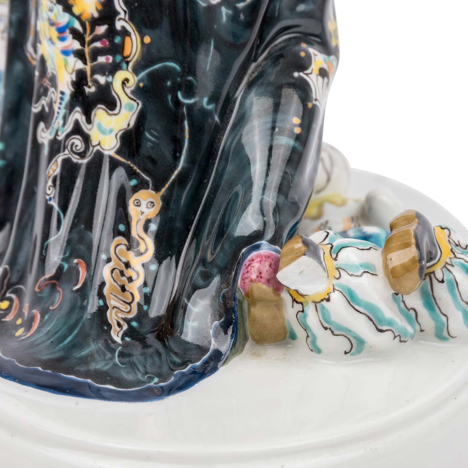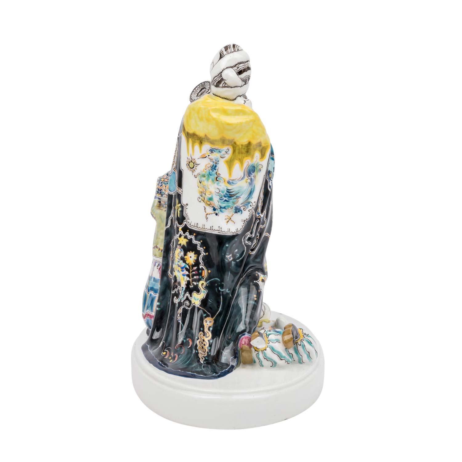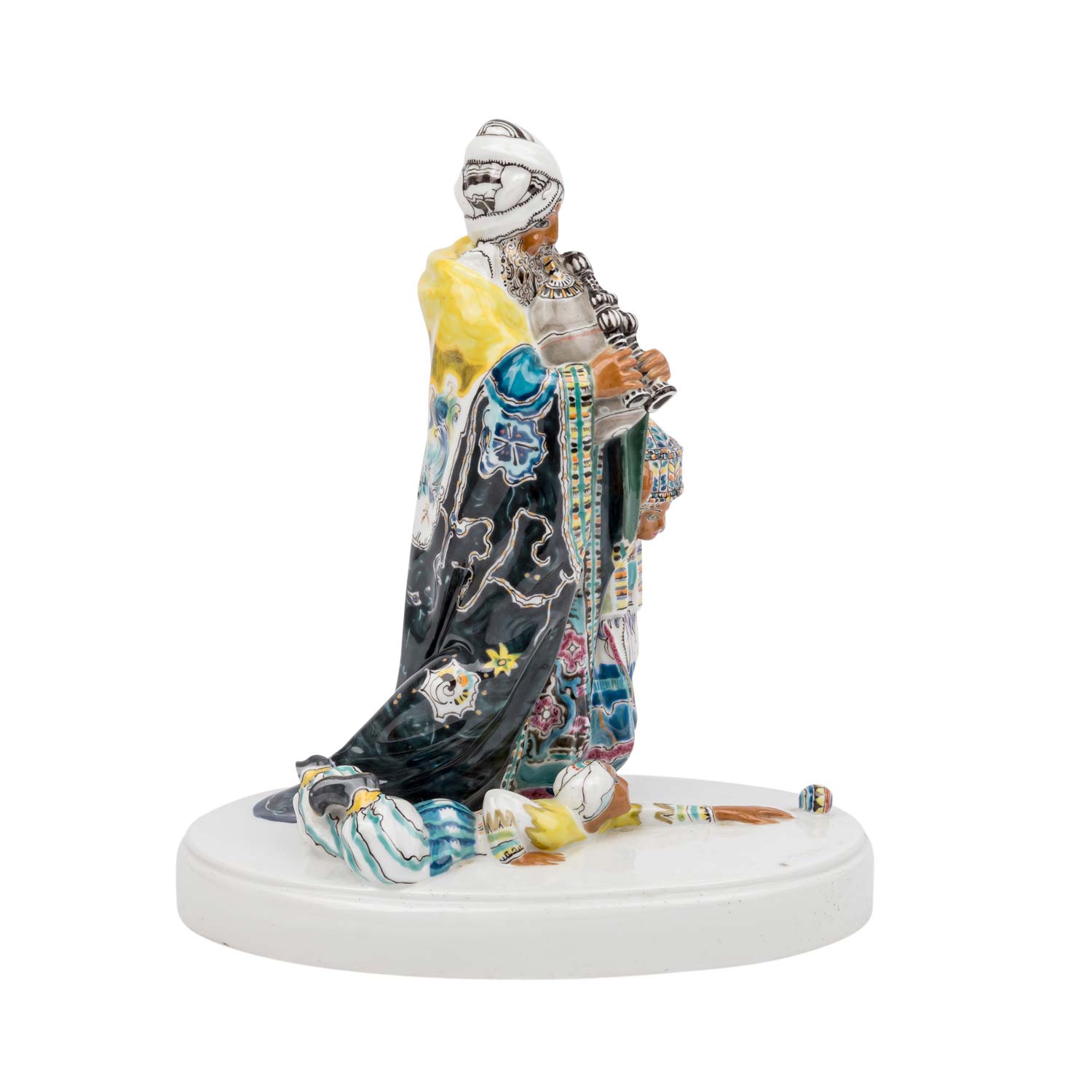 KPM Berlin figure group 'bagpiper', 1910s, Depiction of a bagpipe player on an oval plinth, surrounded by two playing children, white porcelain with colorful staffage. From the centerpiece 'Indian Pageant', designed by Carl Reschke 1912/13, decorative design by Gertrud Kant, model no. 10583, on the base inscribed 'Reschke 191?' (cannot be deciphered), scepter mark and red imperial orb mark on the underside, foot of the lying figure, broken and attached loosely, signs of age, H 22 cm.