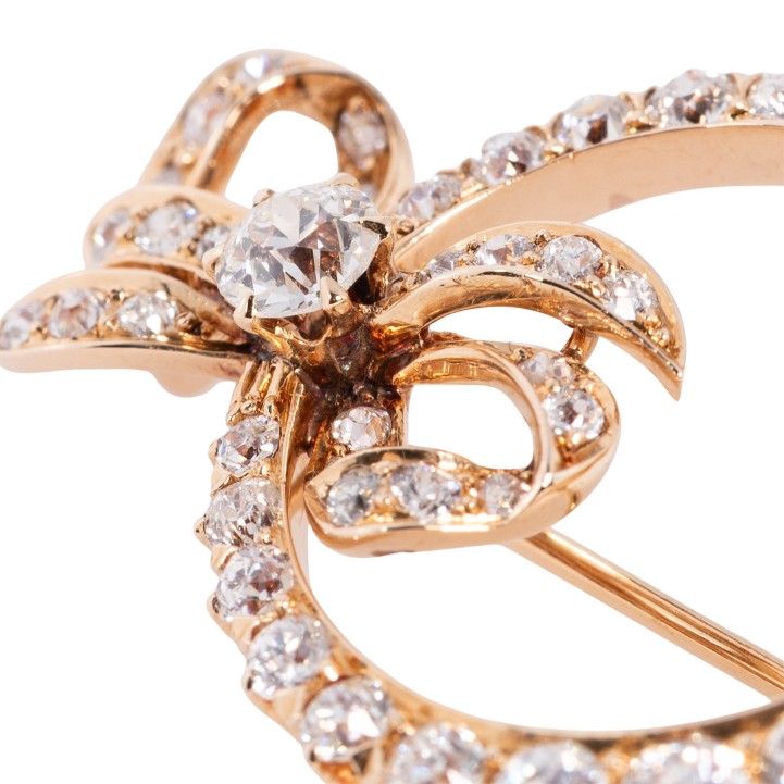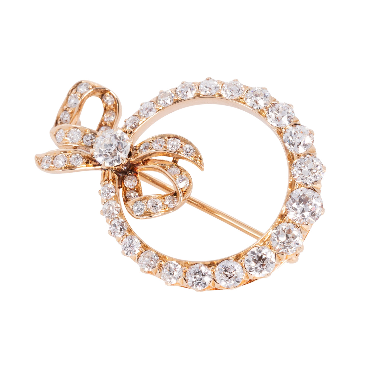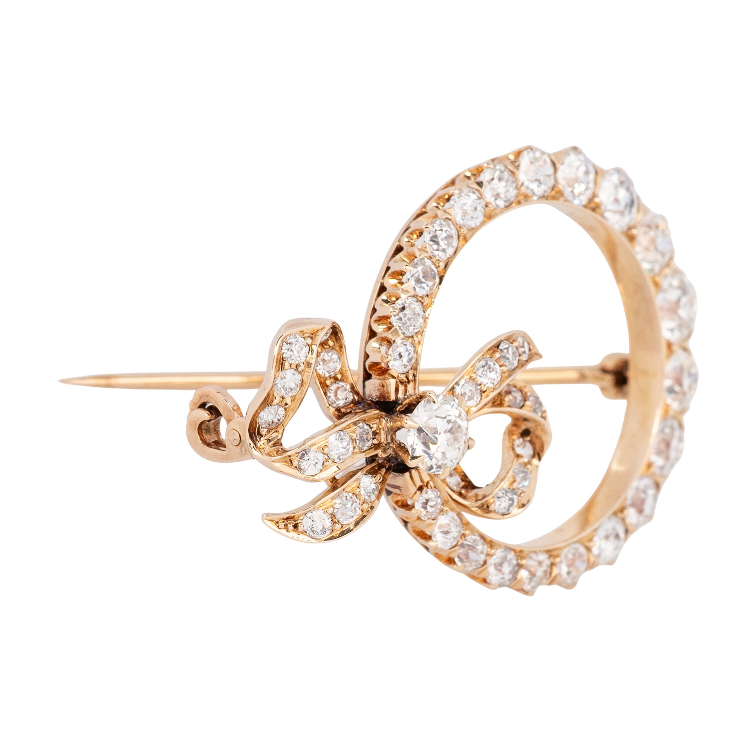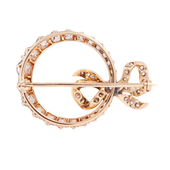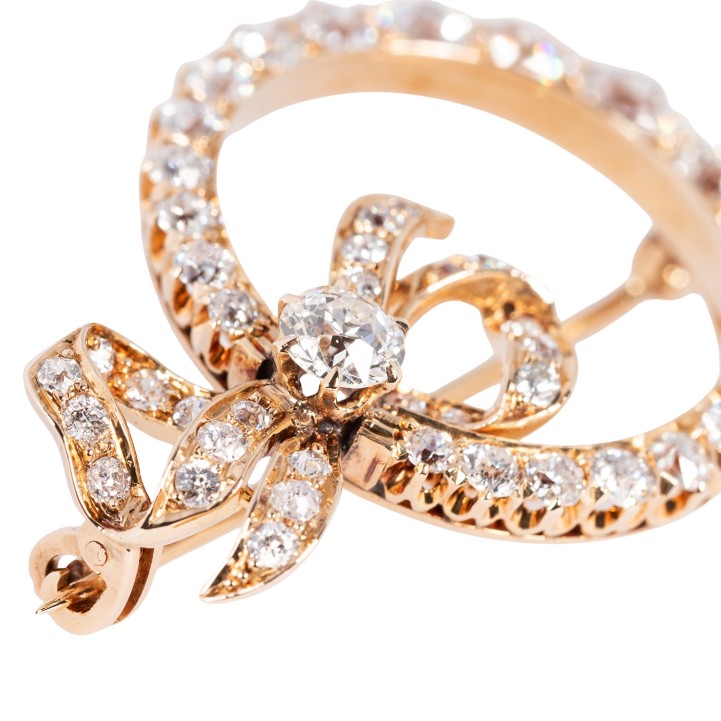 Circle brooch with bow set with old-european-cut diamonds totalling ca. 2.52 ct, ca. WHITE (H)/SI, replacement value (2023): ca. 5,840 €, 14K yellow gold, 7.1 g, 2.6x3.5 cm, late 19th century, backwards small point of tin-solder, otherwise age-relating nice condition, including certificate (2023) and sales receipt (New York 1994).