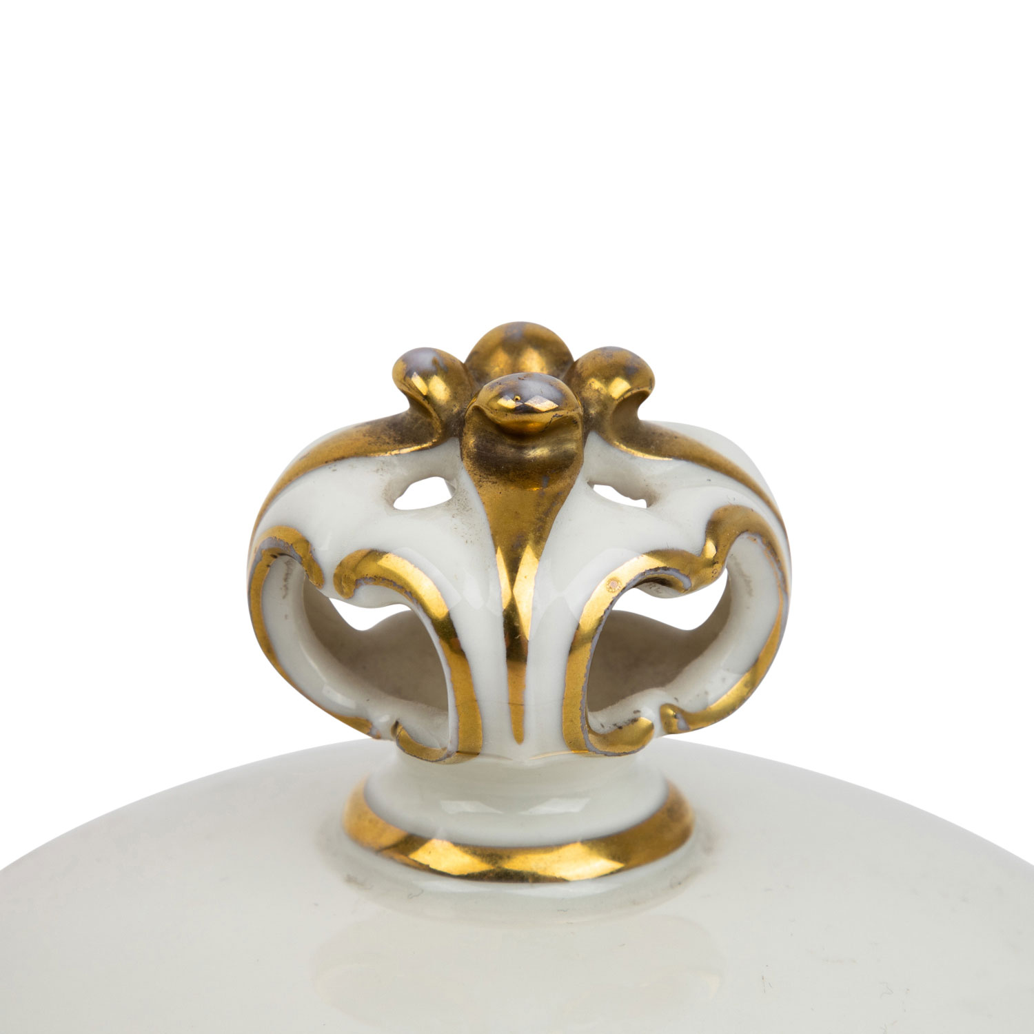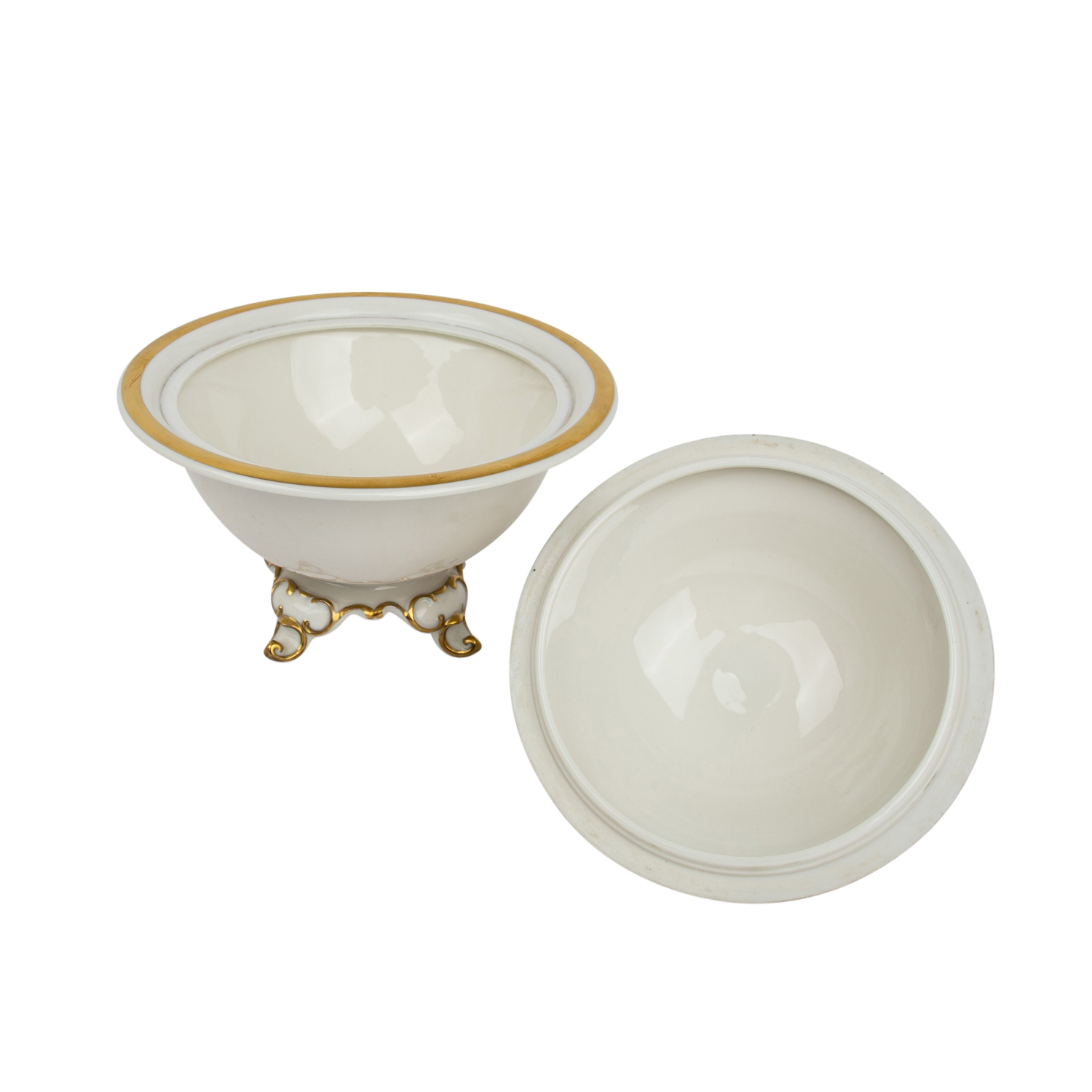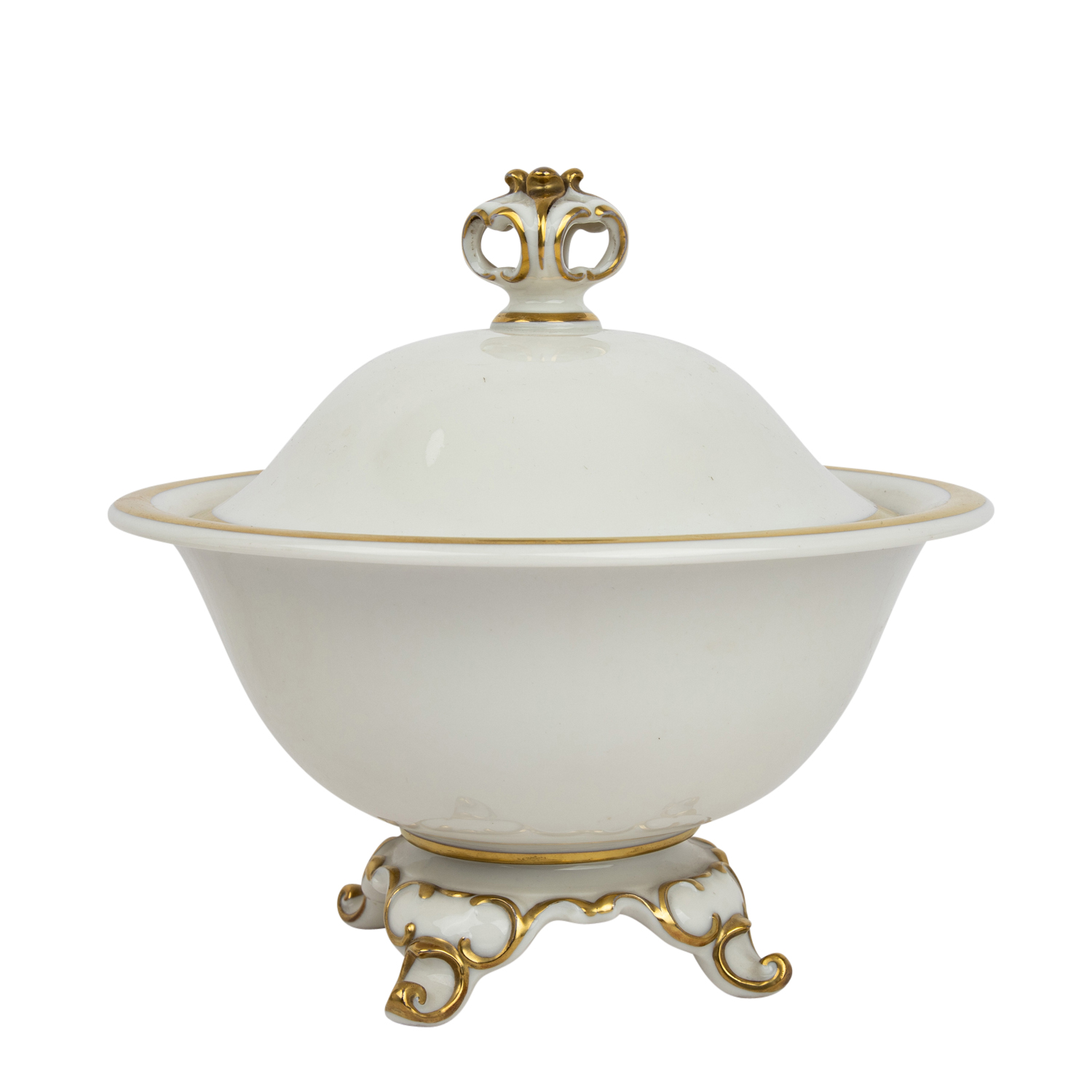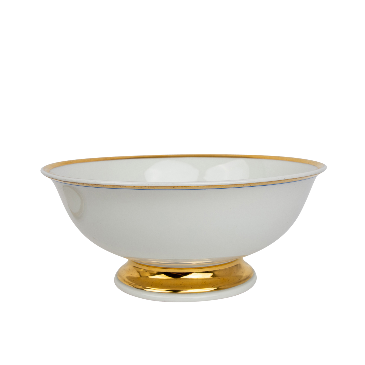 KPM/KRISTER/HUTSCHENREUTHER 3-piece convolute, 19th/20th c.: KPM deep bowl with gold rim, d. approx. 25.5 cm, KRISTER round handle bowl with gold decoration, d. without handles approx. 29 and HUTSCHENREUTHER lidded box on volute stand, design by Karl Tutter, h. approx. 19.5, d. approx. 21. Partially rubbed, signs of age and use.
