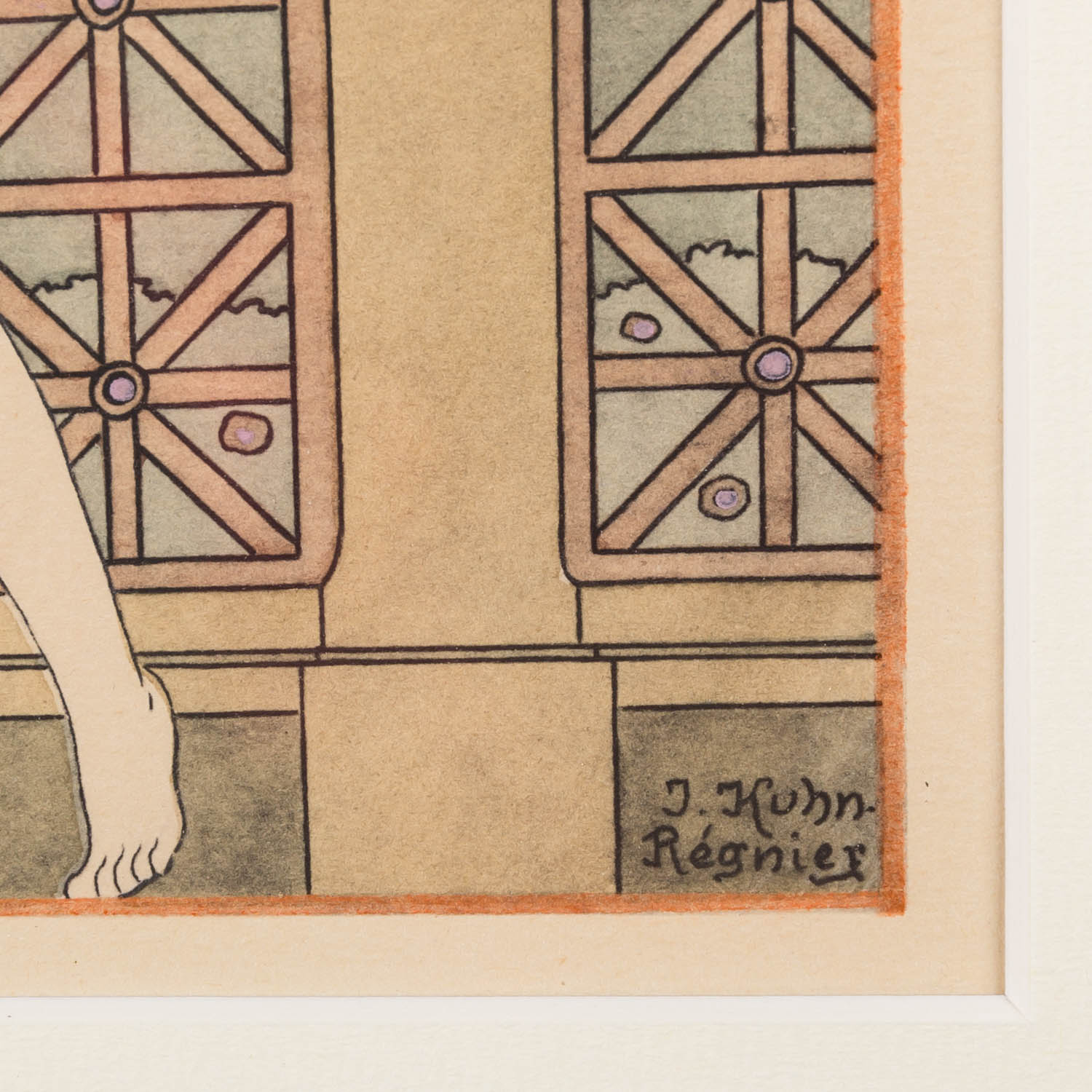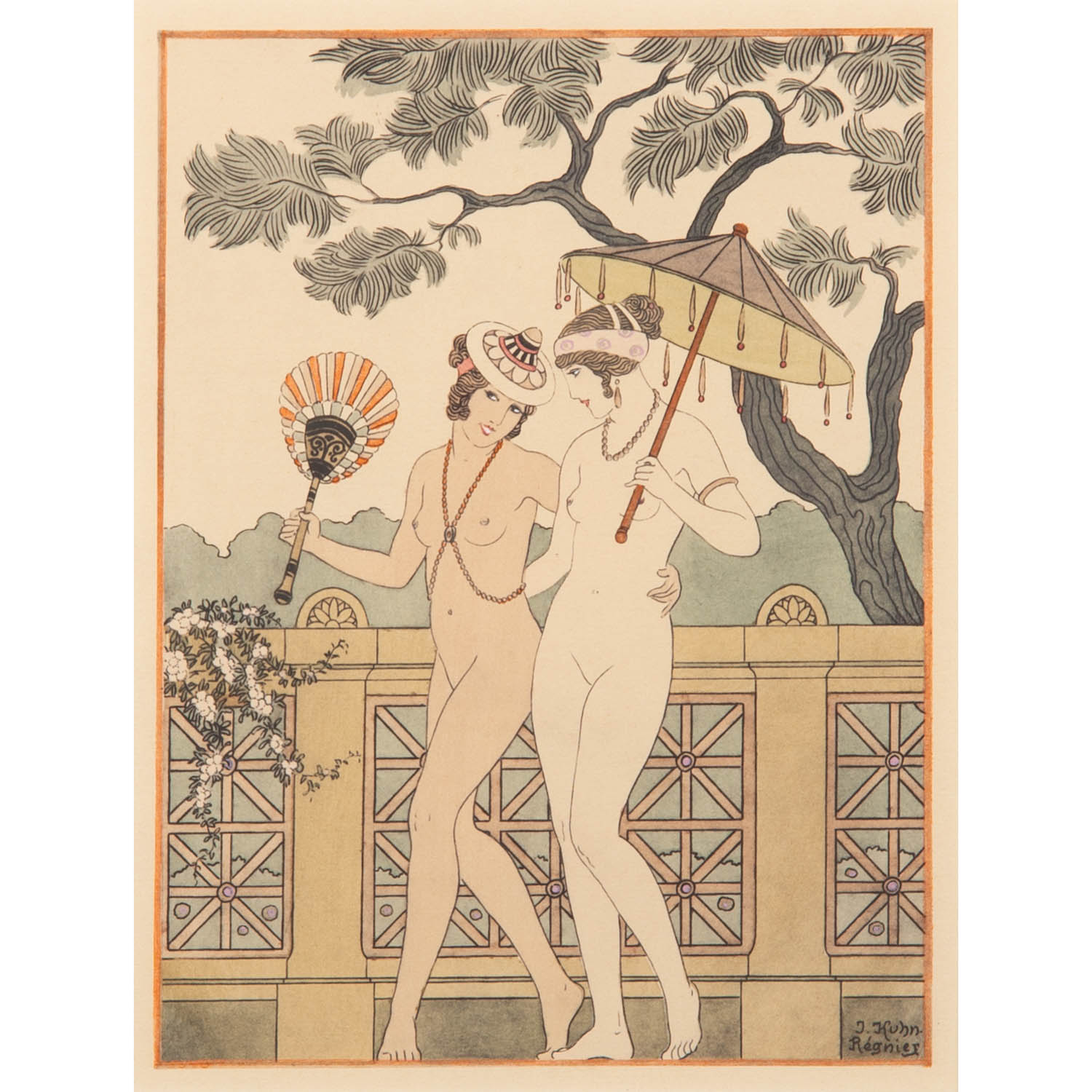 KUHN-REGNIÉR, JOSEPH (1873-1940), Pair of antique scenes with dancers and female nudes, each coloured aquarelle etching/paper, each signed in the plate, HxW: depiction each approx. 20x15 cm, mat cut-out each approx. 21x16 cm, outer frame dimensions approx. 36x30 cm. Each minimally. Traces of age. Each framed behind glass in passepartout.