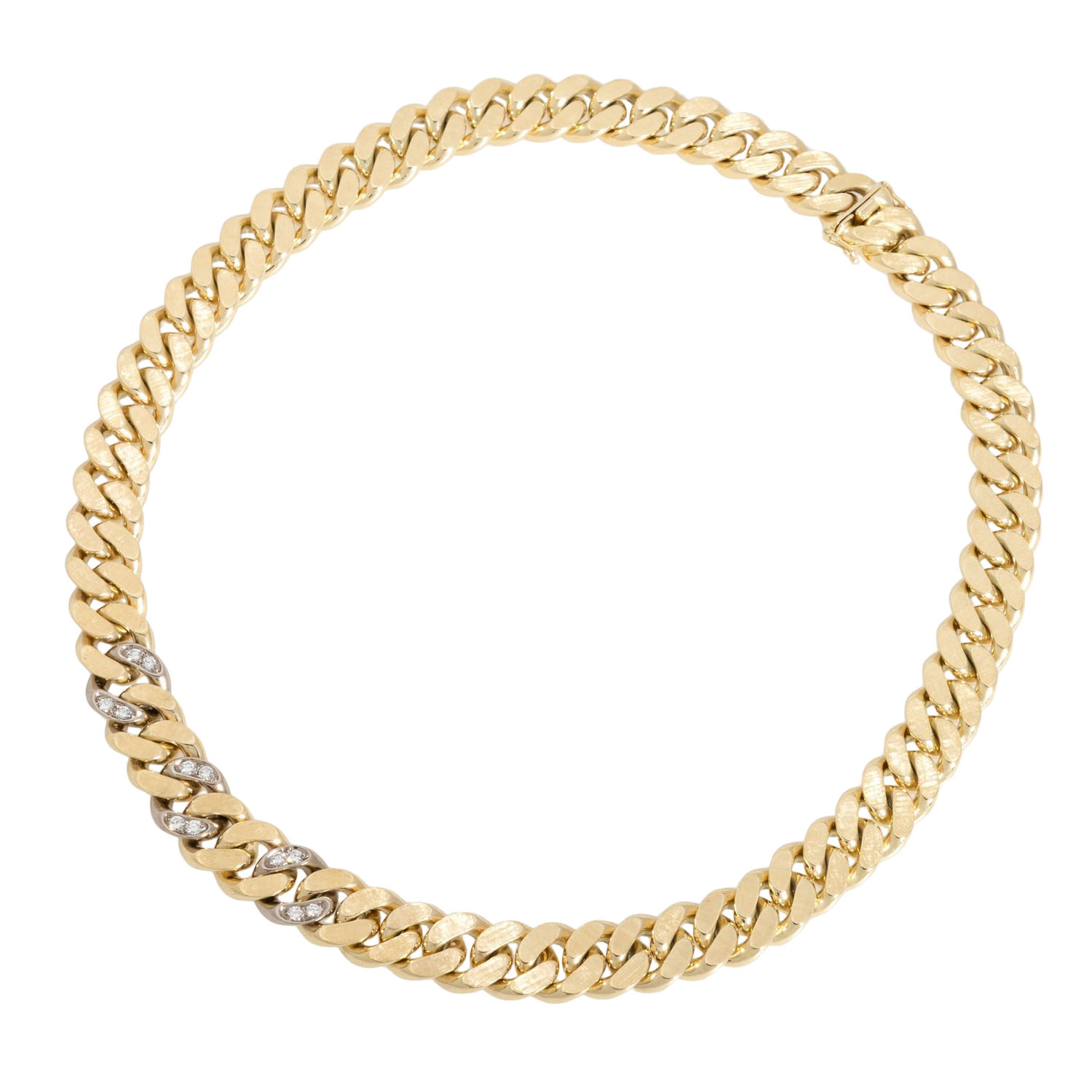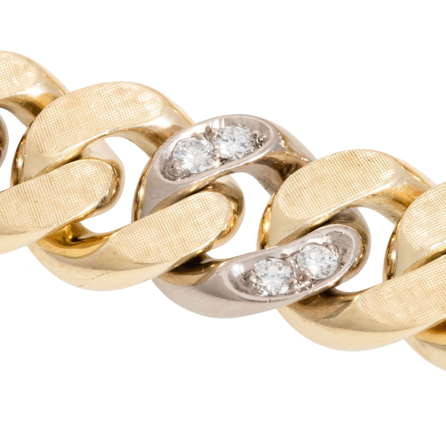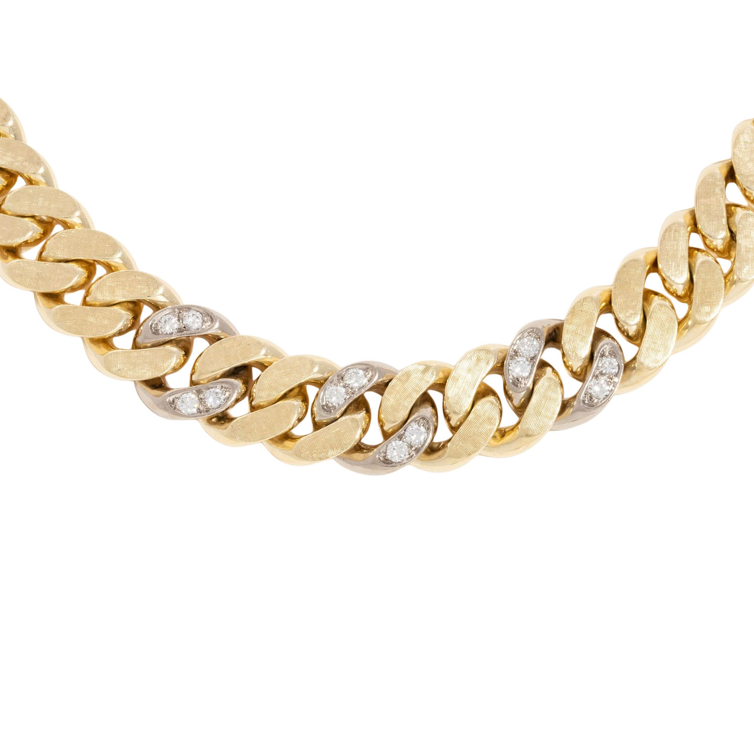 KURTZ Curb link chain with 11 brilliant cut diamonds, totalling ap. 0.5 ct, good colour and clarity, 14K yellow and white Gold, 228.5 g, L: 47 cm, W x H: 12.4 x 4.4 mm, box clasp with 2 safety catches, highly polished, front side line matted, end of 20th century, minimal signs of wear.