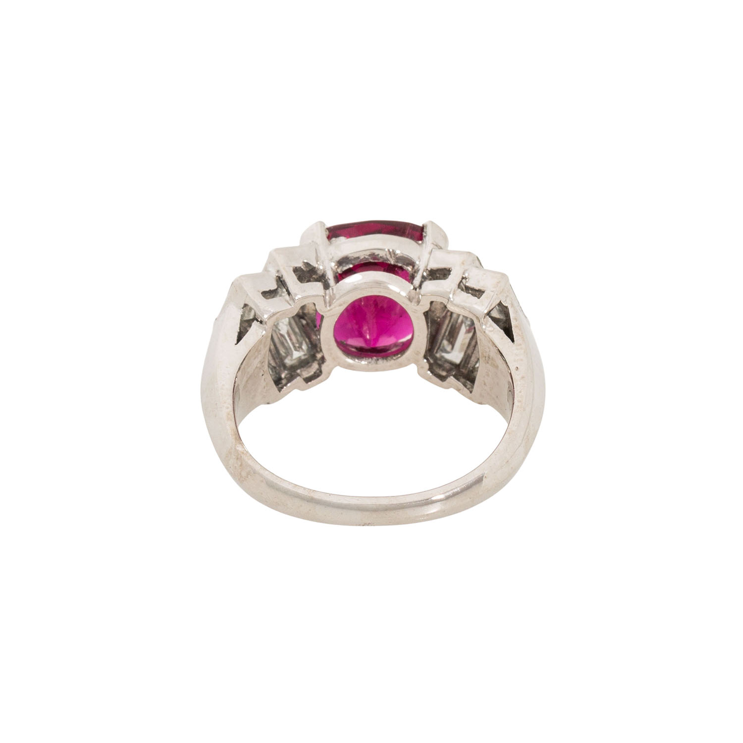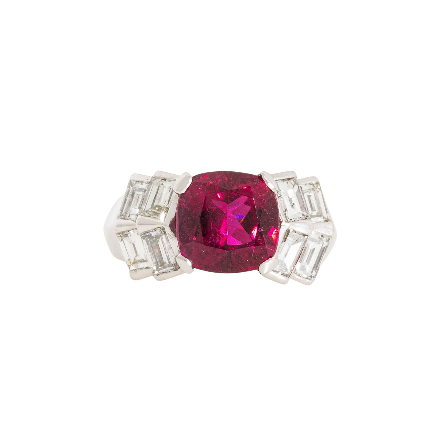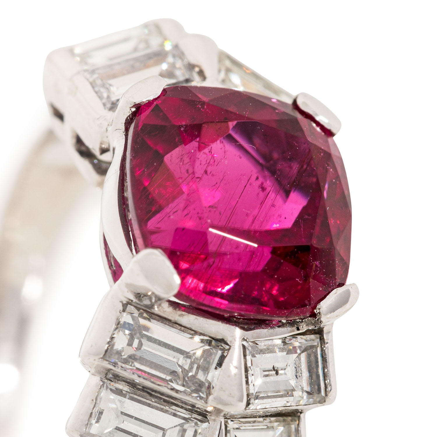 Ladies ring, set with 1 fine pink rubellite ca. 4,4 ct. and 8 rectangular cut diamonds tot. ca. 0,80 ct. G/VSI. WG 18 K, 9,2 g. Size ca. 52. High quality craftsmenship.