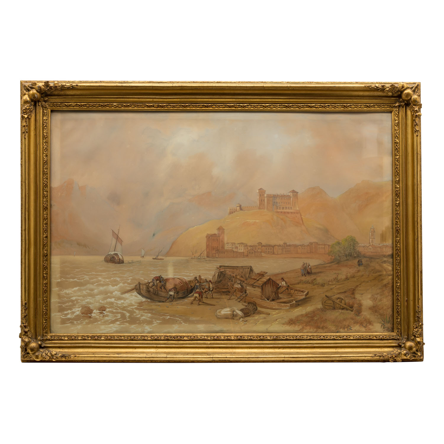 LAEISZ, CARL MARTIN (1803-1864), 'Fishermen recovering their boats on the Italian coast', with a view of a port town in the bay and a castle on the mountain above, below right signed on the side of the boat. 'C. Laeisz ', gouache over pencil / chamois-colored paper, HxW: approx. 62x94 cm (76x107 cm with frame). Browned and light edges. With a glazed frame. Signs of age.