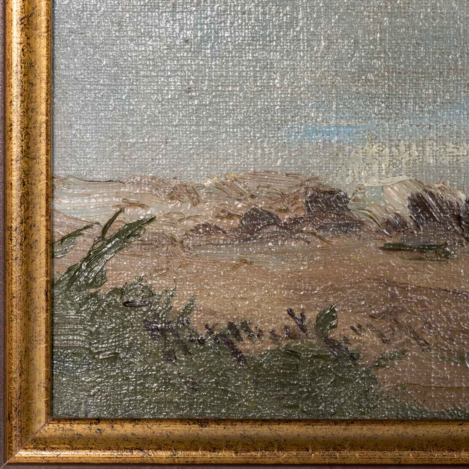 LANDSCAPE PAINTER OF THE 20th CENTURY, 'fisherman at the mountain lake', small fishing relay in wide landscape with impasto painted details, below left indistinctly signed, inscribed 'Muck', oil/canvas, HxW: ca. 60.5x75 cm (74.5x128.5 cm with frame). Craquelure. With frame (slight traces of rubbing).