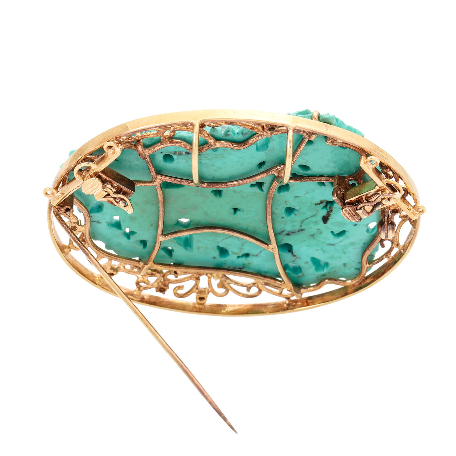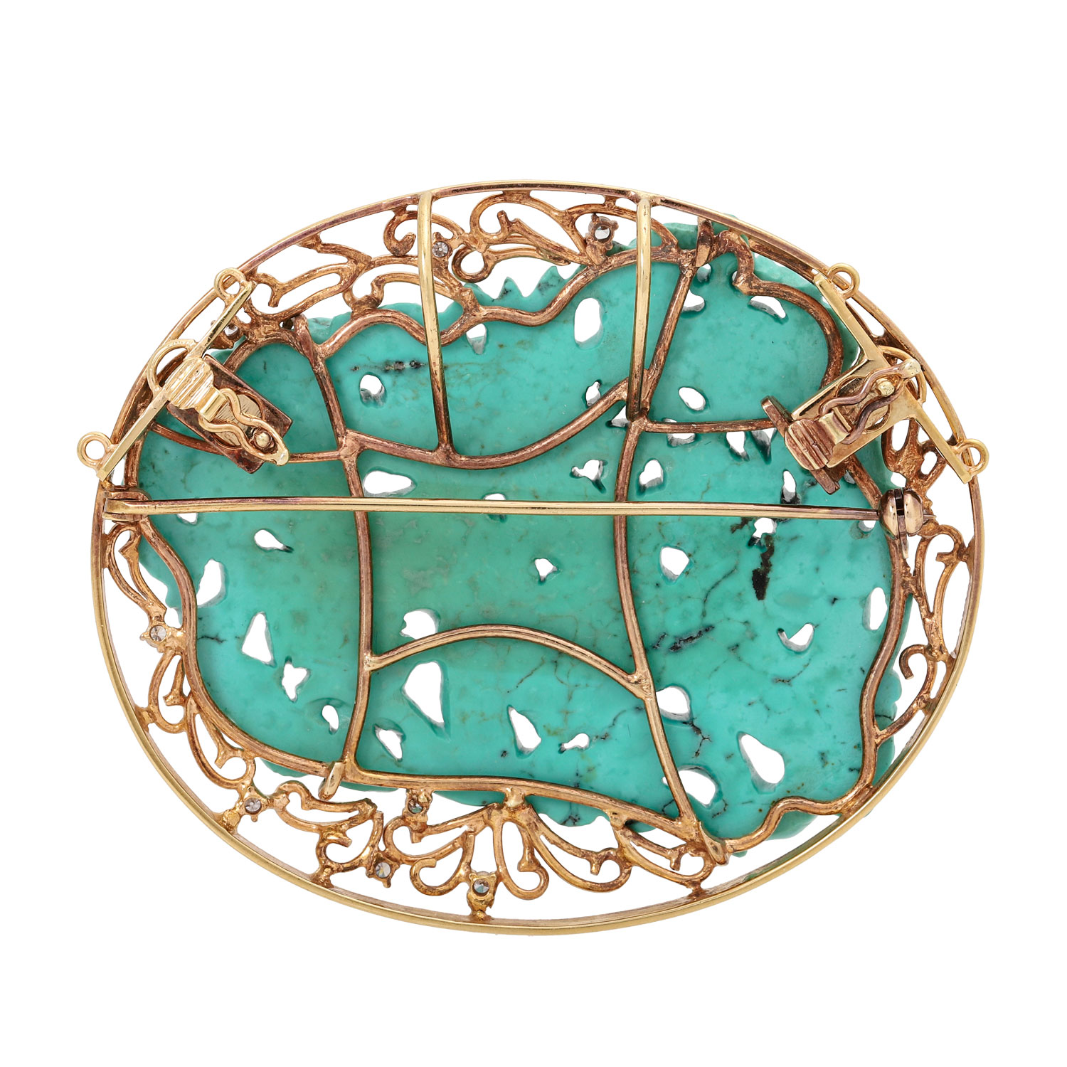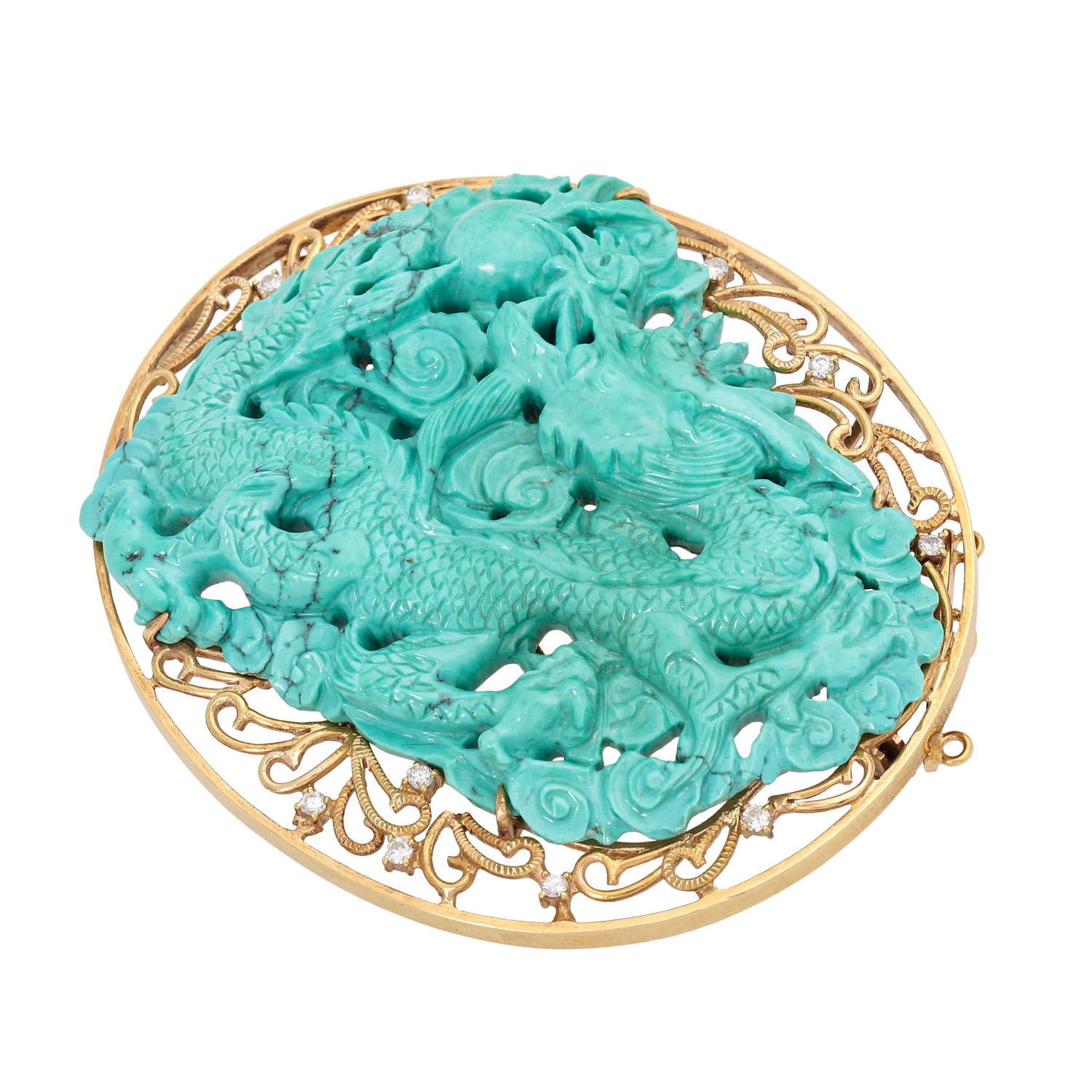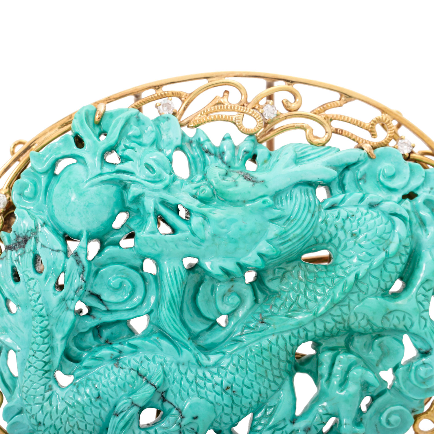 Large brooch/pendant with elaborately carved turquoise, depicting a dragon on delicate scrolls, set with 10 diamonds, totall. c. 0.10 ct, YG 14K, 39 gr, ca. 6.5 x 5.5 cm, 21st century, minor signs of wear. 'Dragon with pearl' with 4 claws, sophisticated execution. Reverse with anchors for attaching 2 pearl strands.